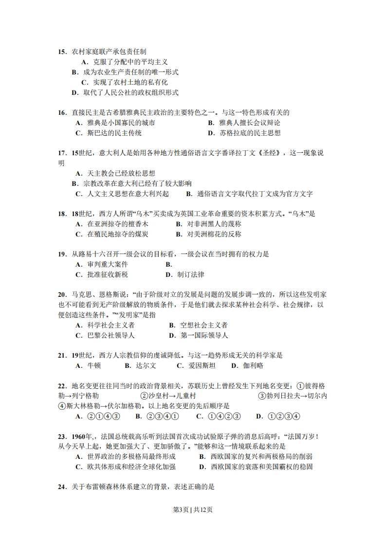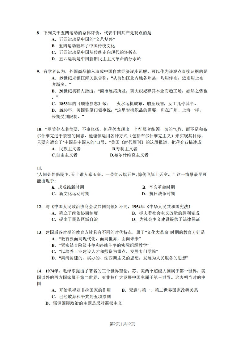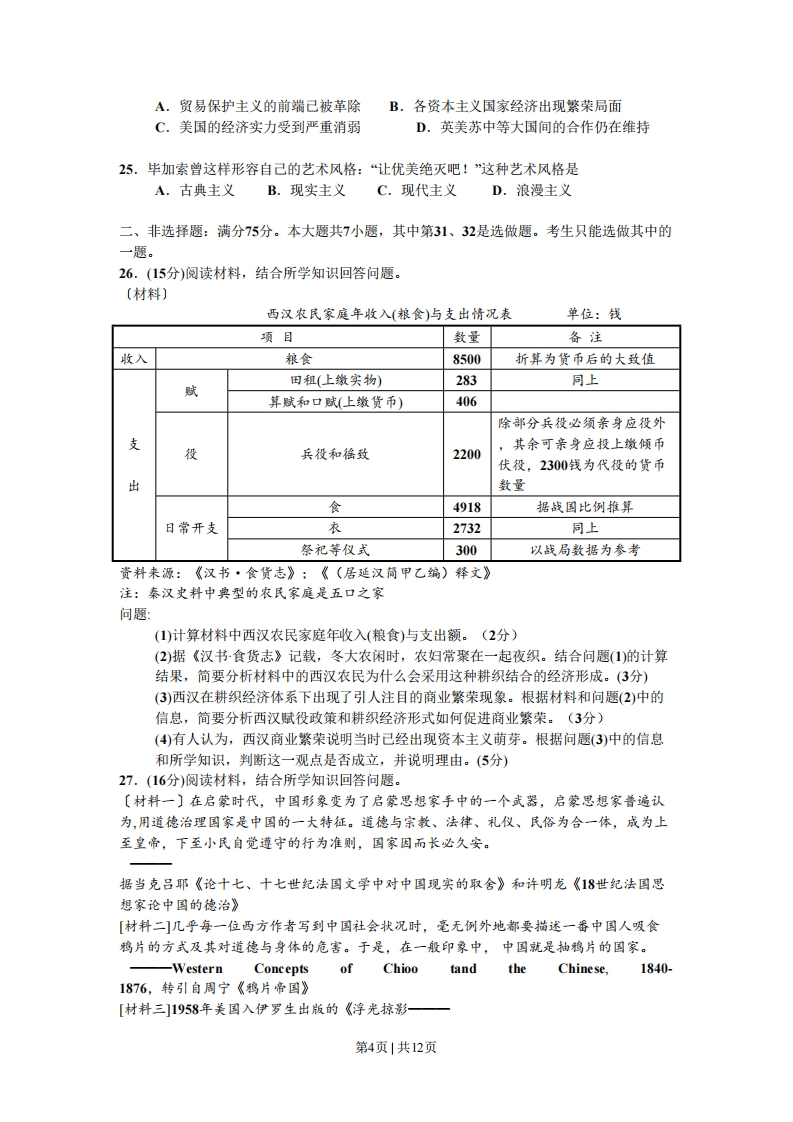 2008年普通高等学校招生全国统一考试广东)历史本试卷共6页,满分150分。考试用时120分钟。一、选择题:满分75分。本大题共25小题,每小题3分。在每小题列出的四个选项中只有一一项符合题目要求。1.右图是明清古建筑中的一幅牌扁,与它有关联的中国古代政治制度是A.分封制B.宗法制C.三省六部制D.内阁制2.符合右图所示农业生产分布状况的朝代是A.西周B.西汉C.晋D.宋3.某思想家说:“我之出而仕也,为天下为万民,非为一姓也。”他所反对的是A.民主共和制度B.中央集权制度C.专制主义制度D.群主立宪制度4.齐国管帅说:“凡为国之急者,必先禁宋作文巧。未作文巧禁,则民无所游食,无民所游食则必事农,民事农则田垦,田垦则粟多,粟多则国富,国富者兵强,兵强者战胜,战胜者地广。”某研究者据此得出“中国精耕农业的产生与专制国家农业政策密切相关”的结论。该推断A.材料充分、理解准确一绪论合理B.材料充分、理解不准确,结论不合理C.材料不充分、理解准确,结论合理D.材料不充分、理解不准确、结论不合理5.情风吹动旗幡,一人说是风动,一人说是幡动。禅宗六祖慧能说,不是风动,不是幡动,而是两的位心动。在世界本原问题上,与慧能的观点有相似之处的思想家是A.孔子B.程颖C.朱熹D.王阳明6.某思想家在1925年提到世人对他的评价:“自戊戌以来,旧则攻吾大新:新则再吾太旧。”该思想家是A.康有为B.梁启超C.严复D.胡话7.《民报》刊号刊登黄帝像(见下图)的主要目的是A.提倡民主自由B.宣传排满革命C.倡导个人崇拜D.反对帝国主义第1页1共12页