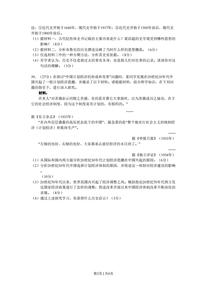 绝密★启用前试卷类型:A2011年普通高等学校招生全国统一考试(广东卷)文科综合历史部分试题12.“夫仁政,必自经界(土地的分界)始,…经界既正,分田制禄,可坐而定也。”孟子的这段话认为A.轻徭薄赋是实施仁政的手段B.均贫富是实施仁政的障碍C.解决土地问题是实施仁政的前提D.贵民轻君是实施仁政的途径13.隋唐以前,官府设有谱局,考定父祖官爵、门第。此后该现象逐步消失,主要原因是A.宗法制的终结B.察举制的完善C.三省六部制的设立D.科举制的推行14.“虎溪三笑”讲的是儒者陶渊明、道士陆修静、僧人慧远一起品茗畅谈、乐而忘返的故事。故事本身是虚构的,却在唐宋诗歌、绘画作品中时有出现。据此可以得出符合史实的结论是,当时A.儒道佛出现融合的趋势B.佛教开始传入中国C.诗歌创作呈现繁荣局面D.绘画风格以写实为主15.清末有舆论说:“中兴名臣曾国藩仅赏侯爵,李鸿章不过伯爵,其余百战功臣,竞有望男爵而不可得者,今乃以子、男等爵奖创办实业之工商,斯诚稀世之创举。”此“创举”反映了A.资本主义的萌芽B.重农抑商传统的改变C.爵位制度的创设D.封建君主专制的加强16.图5所示为乡村知识分子1913年的一则日记(部分),由此可见A.作者不认同辛亥革命大清宣统五年,正月初三B.作者主张全面学习西方自变乱以来,一切新党竞袭洋夷之皮毛,C.当时乡村社会习俗没有变化不但遵行外洋之政治,改阴历为阳历,即服色亦D.当时民主共和观念深入人心效洋式,而外洋各国之夷蚕食鲸吞,日甚一日。来拜年者五十余人,皆系便衣便帽,无一顶戴之人,间有洋帽之人,较上年之情形迥然不图517.20世纪20年代农会会员数的变化反映了农民运动的状况。导致表1所示变化出现的直接原因是表1格省色西整广东广西湖南湖北江西山东直隶河南时间1926年6月647,766814438,150412011532841342270,0002,502,61927年6月700,00081444,517,140382,617284360245,50000A.南昌起义B.井冈山革命根据地的开辟第1页|共4页