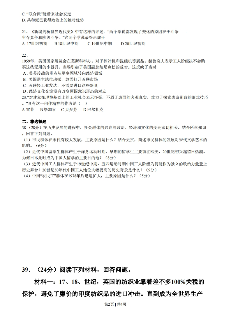 2010高考广东文综(历史)试题解析一、选择题12.在中国古代“家国一体”的社会中,忠孝观念源远流长,其源头是A.宗法制B郡县制C君主专制D中央集权制13.北魏均田制实行后,文献中出现了“庄园”一词,被指圈占的成片土地。唐代均田制实行后,“庄园”一词的使用更普遍。这反映了均田制实行后A.井田制得以恢复B.不存在土地私有现象C.仍存在土地集中现象D.庄园由中央集中管理14.唐代和宋代都有谏官。唐代谏官由宰相荐举,主要评议皇帝得失:宋代谏官由皇帝选拔,主要评议宰相是非。这说明:A.唐代君主的权力不受制约B.唐代以谏官削弱宰相的权力C.宋代谏官向宰相和皇帝负责D.宋代君主专制的程度高于唐代15.“人人自有定盘针,万化根源总在心。却笑从前颠倒见,枝枝叶叶外头寻。”这首诗反映了A.孟子的“仁政”B.董仲舒的“独尊儒术”C王阳明的“心学”D.顾炎武的“经世致用”16.“民众以为清室退位,即天下事大定,所谓民国共和则取得从来未有之名义而己。至其实质如何,都非所问。”这说明A.辛亥革命具有坚实的群众基础B.新文化运动具有历史必要性C.国民革命结束了君主专制制度D.君主立宪制得到民众的普遍支持17、下列说法体现了“双百”方针内涵的是A“要革命派,不要流派”B.“争论会引起党内思想不一致”C.“让样板戏占领革命舞台”D.“不打棍子、不戴帽子、不抓辫子”18、下表是我国某时期的国际邮件资费表(部分),从中可推出的符合史实的结论是邮件种类计费单位(每10克)邮资(元)亚洲各国0.32苏联及东欧民主国家0.48航空西欧各国(捷克转)0.48西欧各国(香港转)0.80其他各洲0.80A.香港已经回归,成为中国与西欧交往的重要桥梁B.改革开放前,中国没有与西方国家建立外交关系C.捷克已加入欧盟,成为中国往西欧各国邮件的中转地D.新中国外交史上,苏联及东欧民主国家曾有特殊地位19、“我们不把任何未经验证的意见接受作为真理,而是遵照必要的次序,从一步推演到下一步..不论多么深奥,最终都能发现。”与这句话的理念一致的说法是A.“信仰即可得救”B“人是万物的尺度”C“要有勇气运用你自己的理智”D.“我们茫然于新事物,并对未来充满了恐惧”20、1873年,法国某报纸刊登的一封读者来信写到:“我们是工业家和土地所有者,需要秩序,并不喜欢共和政体。但是,如果联合派'(属于君主派)获得胜利,那些现在还留在我们方面的大部分人将投入极端共和派的怀抱去了。”这段话反映出当时在法国A.政治局面错综复杂B.无产阶级建立了共和政体第1页|共4页