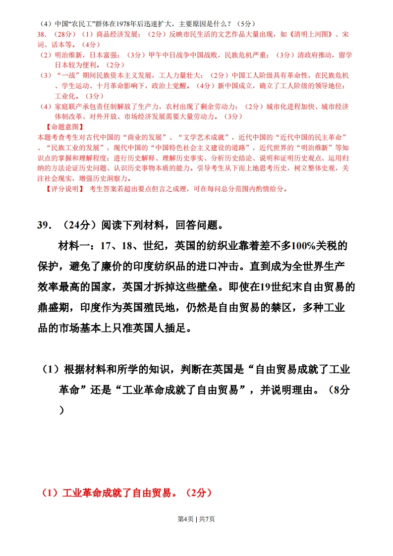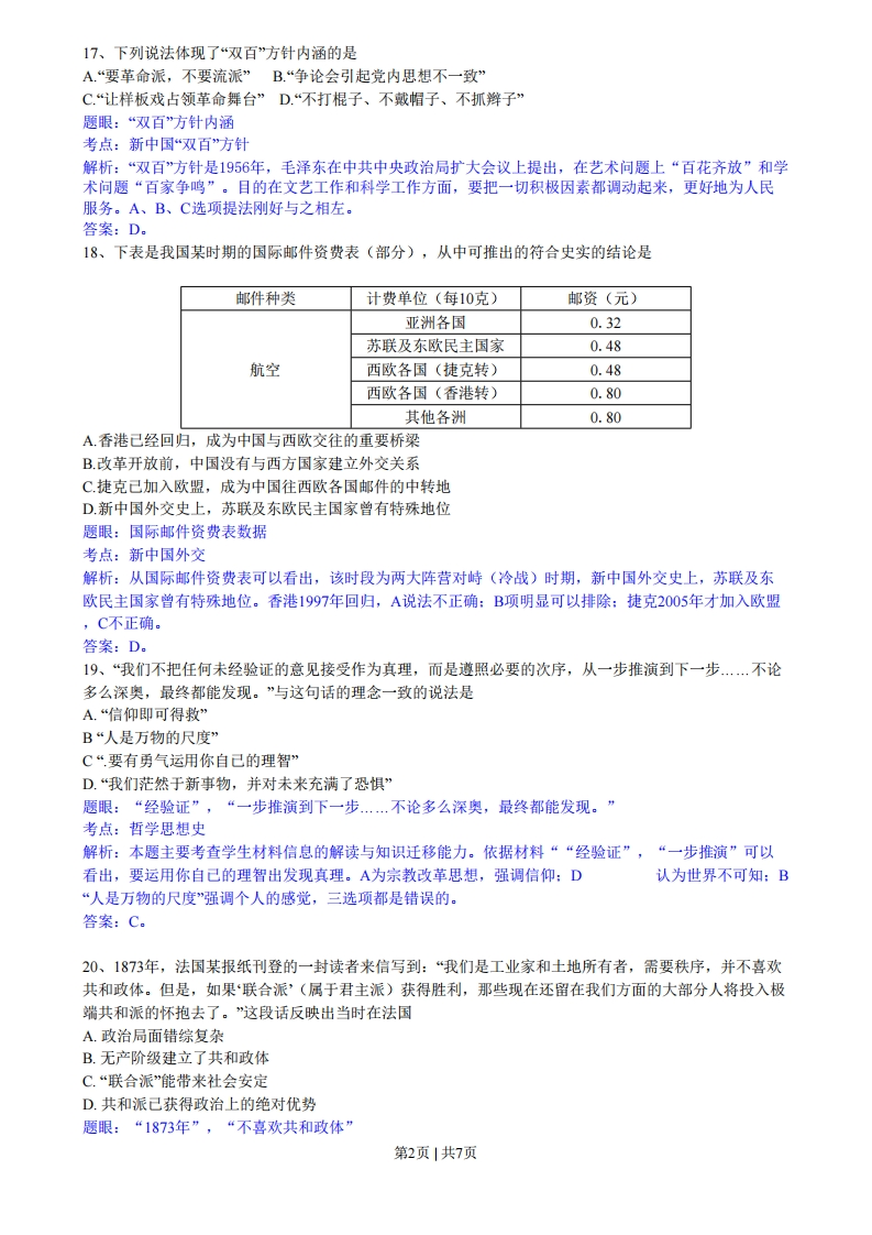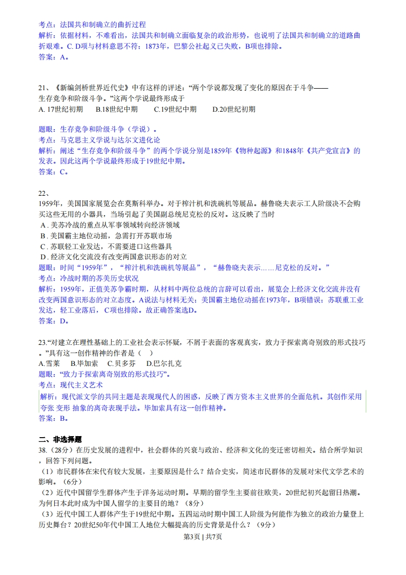 2010高考广东文综(历史)试题解析一、选择题12.在中国古代“家国一体的社会中,忠孝观念源远流长,其源头是A宗法制B郡县制C君主专制D中央集权制题眼:“家国一体考点:中国古代宗法制解析:古代宗法制是用父系血缘关系的亲疏来维系政治等级,它保证贵族的特权地位,有利于统治集团内部的稳定和团结:有利于凝聚宗族,“国”“家”结合起来,强化王权。答案:A.13.北魏均田制实行后,文献中出现了“庄园”一词,被指圈占的成片土地。唐代均田制实行后,“庄园”一词的使用更普遍。这反映了均田制实行后A.井田制得以恢复B.不存在土地私有现象C.仍存在土地集中现象D.庄园由中央集中管理题眼:均田制实行后,“庄园”一次的使用更普遍的原因。考点:均田制与“庄园”的关系一一土地兼并解析:庄园是一个自给自足程度相当高的经济、政治、文化单位。唐代均田制实行后,“庄园”一词的使用更普遍。这反映了均田制实行后,地主依旧圈占的成片土地,存在土地集中现象。答案:C14.唐代和宋代都有谏官。唐代谏官由宰相荐举,主要评议皇帝得失:宋代谏官由皇帝选拔,主要评议宰相是非。这说明:A.唐代君主的权力不受制约B.唐代以谏官削弱宰相的权力C.宋代谏官向宰相和皇帝负责D.宋代君主专制的程度高于唐代题眼:古代唐宋代谏官的职能变化。考点:古代皇权加强解析:唐代谏官主要评议皇帝得失到宋代主要评议宰相是非。这反映了君主专制的加强,即从某个侧面说明了宋代君主专制的程度高于唐代。A君权“不受制约”提法错误:宋代以谏官削弱宰相的权力,B排除:宋代谏官由皇帝选拔,向皇帝负责,C项也不对。答案:D。15.“人人自有定盘针,万化根源总在心。却笑从前颠倒见,枝枝叶叶外头寻。”这首诗反映了A孟子的“仁政”B.董仲舒的“独尊儒术”C.王阳明的“心学”D.顾炎武的“经世致用”题眼:“万化根源总在心。”考点:“心学”解析:这首诗出自王阳明之手,诗中认为人人都有自己的价值标准,而万物本源在于自己的心。反映了“心学”的理论观点。答案:C。16.“民众以为清室退位,即天下事大定,所谓民国共和则取得从来未有之名义而己。至其实质如何,都非所问。”这说明A.辛亥革命具有坚实的群众基础B.新文化运动具有历史必要性C.国民革命结束了君主专制制度D.君主立宪制得到民众的普遍支持题眼:“民众以为清‘民国共和则取得从来未有之名义而已。”考点:辛亥革命的影响解析:本题主要考查学生材料信息的解读能力。材料中可以看出民众把清室退位与民国共和'混为一谈,这说明唤醒国民民主意识的重要性,也体现了新文化运动解放人们思想具有历史必要性。答案:B。第1页1共7页
