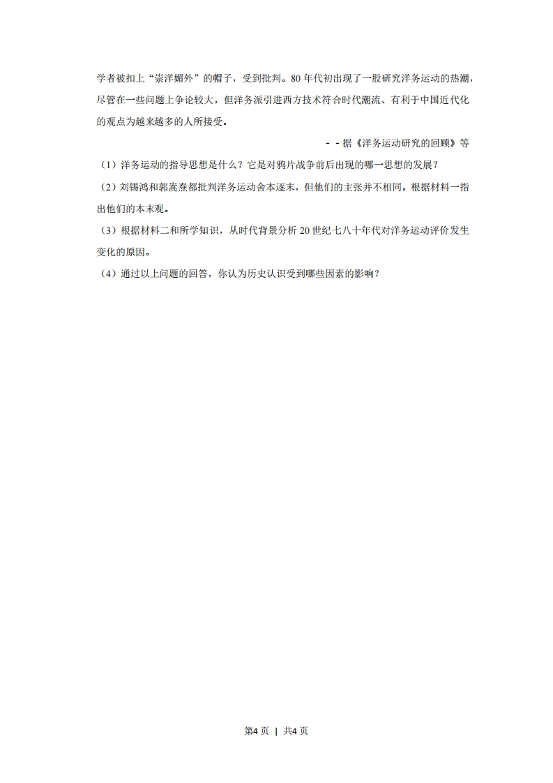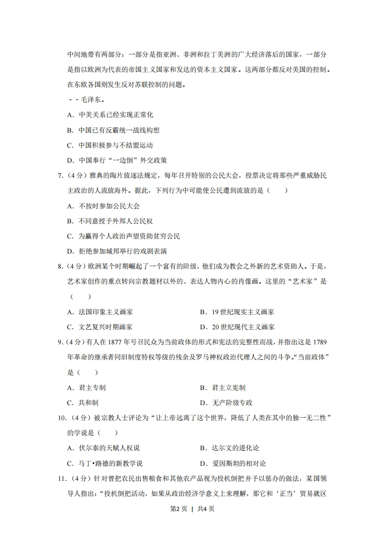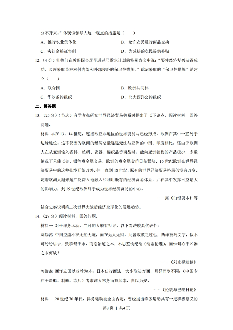 2013年广东省高考历史试卷一、选择题1.(4分)战国以前,“百姓”是对贵族的总称:战国以后,“百姓”成为民众的通称。导致这一变化的主要原因是()A.分封制的加强B.宗法制的衰落C.百家争鸣局面的出现D.井田制的推行2.(4分)东汉初年桓谭上书说:“(重本抑末)此所以抑并兼、长廉耻也。今富商大贾,多放钱货…收税与封君比入。”据此推论合理的是()A,东汉初年金融业繁荣,资本主义萌芽出现B.东汉初年商人与封君勾结,中央集权削弱C.东汉初年商人经济实力强,桓谭建议厉行重农抑商D.重农抑商是中国古代基本政策,桓谭描述的现象不存在3.(4分)有位古代思想家认为:通过读书等外在手段来明理自然是好,但“不识一个字,亦须还我堂堂地做个人”,重要的是先确立仁义这一根本。这位思想家可能是()A.孔子B.董仲舒C.朱熹D.陆九渊4.(4分)“革命,革命,剪掉辫子反朝廷:独立,独立,中国岂是鞑子的!”这首歌谣反映了当时()A.革命的主要目的是移风易俗B.民族主义思想已影响到民众C.民族区域自治思想深入人心D.反对帝国主义成为思想主流5.(4分)20世纪30年代前期,“左”倾错误领导人把反对资产阶级同反帝反封建并列,企图毕其功于一役,使中国革命遭受巨大损失。“左”倾错误的表现有()A.把民族资产阶级作为革命对象B.坚持国民革命路线C.放弃无产阶级对革命的领导权D.实行工农武装割据6.(4分)下示材料说明当时()第1页1共4页