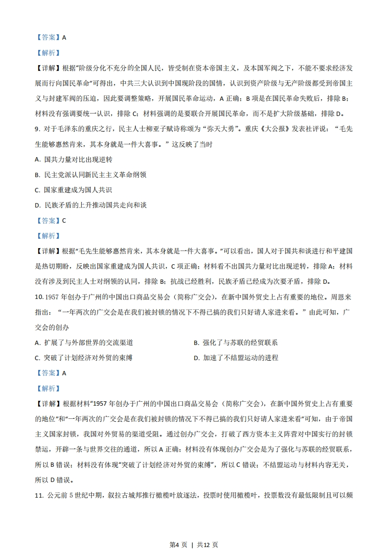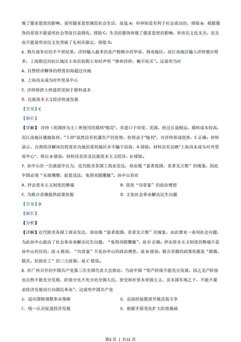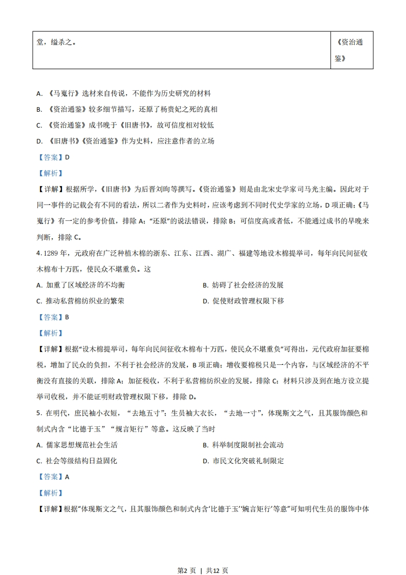 2021年广东省普通高中学业水平选择性考试历史一、选择题1.今河南平顶山应国墓地、陕西长安张家坡及普渡村墓地等处出土了一批具有长江中下游风格的西周青铜器。这说明西周时期A.中原文化向周边传播B.各诸侯国维护周礼C.宗法制度分崩离析D.南北文化相互交流【答案】D【解析】【详解】根据材料河南、陕西出土长江中下游风格的西周青铜器,结合史实河南、陕西属于黄河流域,属于北方,北方发现南方风格的青铜器,可知南北文化相互交流,故D正确:材料的内容是中原受到南方的影响,故A错误:材料与各诸侯国维护周礼无关,故B错误:材料与宗法制度无关,故C错误。2.汉代设尚书台,其首领是尚书令、尚书仆射。魏晋时期,“事无大小,咸归令、仆”。这一现象说明A.皇权旁落B.相权转移C.地方权力削弱D.行政效率降低【答案】B【解析】【详解】根据“事无大小,咸归令、仆”可得出国家大事都掌握在尚书令、尚书仆射,说明魏晋时期相权转移到尚书令、尚书仆射手中,故B项正确:材料中的现象是皇权加强的体现,排除A:材料没有体现中央与地方的关系,排除C:材料与效率无关,排除D。3.安史之乱时,唐玄宗逃奔成都,途中发生兵变,杨贵妃死于马嵬坡。以下为若干记载。有学生以下述材料探究杨贵妃之死,下列推论正确的是(唐)刘禹路边杨贵人,坟高三四尺。乃问里中儿,皆言幸蜀时…贵人饮金屑,倏忽舜英暮。平生服锡杏丹,颜色真如故。《马嵬行》(五代)刘上令高力士诘之,回奏曰:“诸将既诛国忠,以贵妃在宫,人情恐惧。”上即命力士赐贵妃昫等自尽。《旧唐书》上日:“贵妃常居深宫,安知国忠反谋?”高力士日:“贵妃诚无罪,然将士己杀国忠,而(宋)司马贵妃在陛下左右,岂敢自安!愿陛下审思之,将士安则陛下安矣。”上乃命力士引贵妃于佛光第1页|共12页