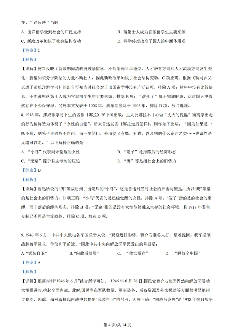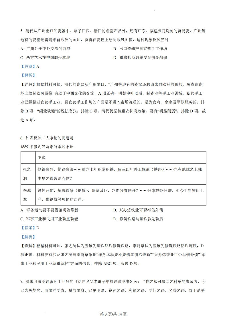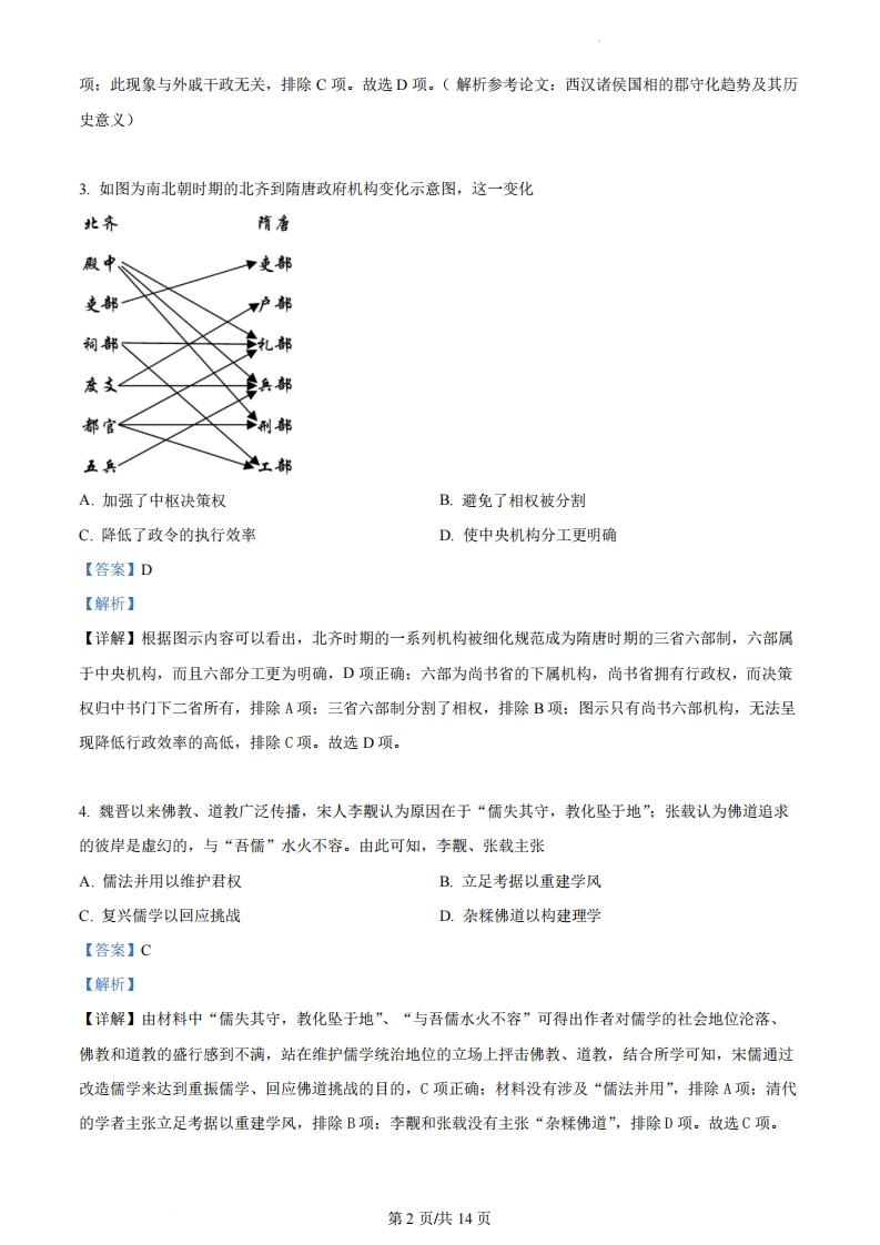 2022年广东省高考真题历史试题一、选择题1.考古材料是研究历史的重要依据。下列选项中,材料与结论之间逻辑关系正确的是材料结论内蒙古克什克腾旗出土商朝的青铜器商朝的统治范围到达内蒙古地区B山西晋国都邑遗址出土春秋早期的铁器残片春秋早期己经使用铁器C湖北大治铜矿治遗址出土东周时代的陶片大治铜矿的开采时间不早于东周D西安秦始皇陵兵马俑坑出上铁镞(箭头)秦朝军队主要使用铁制兵器A.AB.BC.CD.D【答案】B【解析】【详解】根据材料可知,B项材料与结论之间逻辑关系正确,山西晋国都邑遗址出土春秋早期的铁器残片,说明春秋早期己经使用铁器,B项正确:A项材料与结论之间逻辑关系不正确,内蒙古克什克腾旗出土商朝的青铜器可能是通过贸易等其他方式传入当地的,不一定属于商朝的统治范围,排除A项:C项材料与结论之间逻辑关系不正确,湖北大治铜矿治遗址出土东周时代的陶片,说明大治铜矿的开采时间不晚于东周,排除C项:D项材料与结论之间逻辑关系不正确,西安秦始皇陵兵马俑坑出上铁镞(箭头)不代表秦朝军队主要使用铁制兵器,排除D项。故选B项。2.“奉朝请”是两汉朝廷给子退休大臣和列侯、宗室、外戚的特殊待遇,被授予者特许参加朝会,地位也随之提高。东汉中叶以后,王、侯多不就国,而是以“奉朝请”的名义留驻京师,封国大权操于国相,这客观上A.有助于遏制地方豪强势力的扩张B.埋下了东汉末年军阀割据的隐患C.为外戚干政提供了便利的条件D.有利于朝廷对封国的直接控制【答案】D【解析】【详解】根据材料可知,东汉中叶以后,王、侯多不就国,封国的实际控制权到了中央派驻的国相的手里,客观上有利于朝廷对封国的直接控制,D项正确:遏制地方豪强势力扩张与材料主旨无关,除A项:国相是由中央派驻的,刚开始是作为朝廷的监督人员,此时开始郡守化,相当于“郡县长官”,排除B第1页供14页