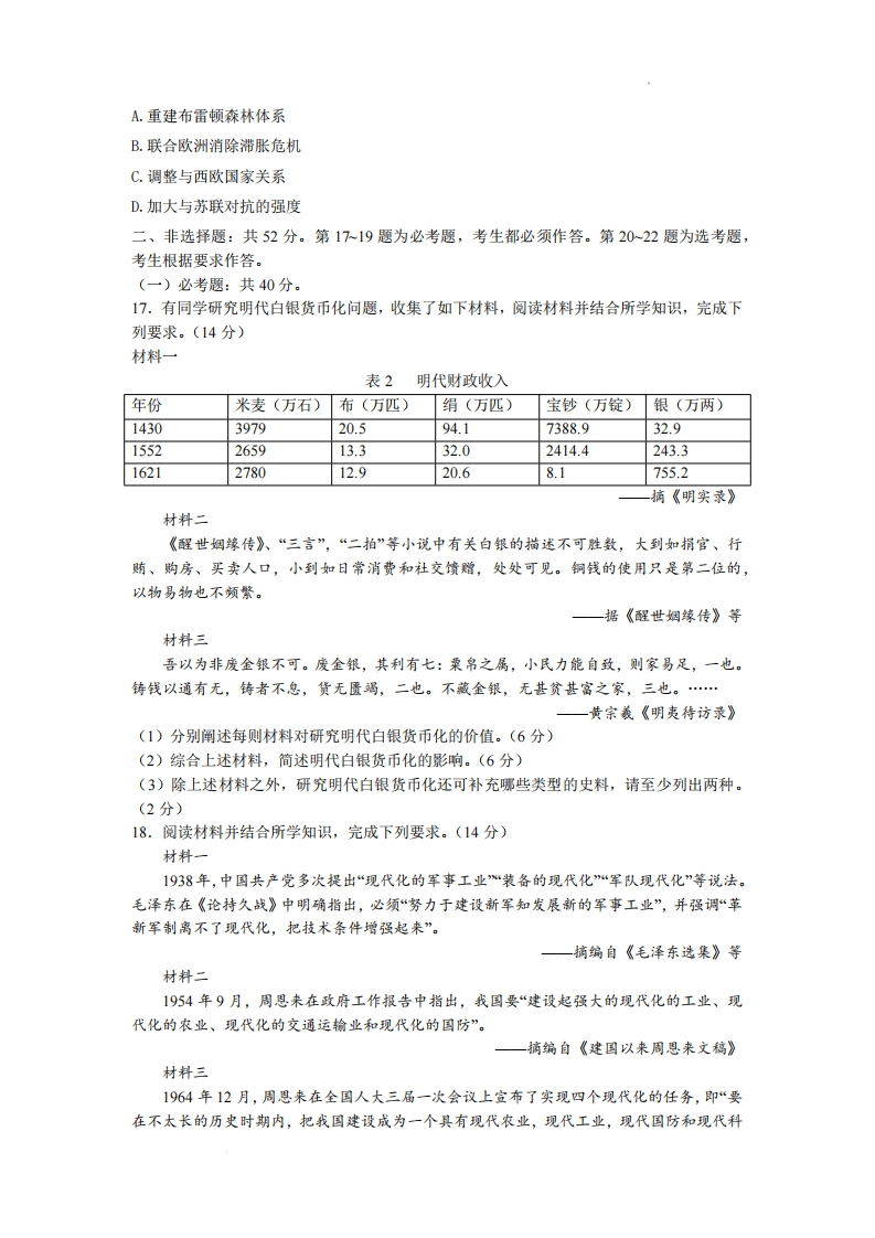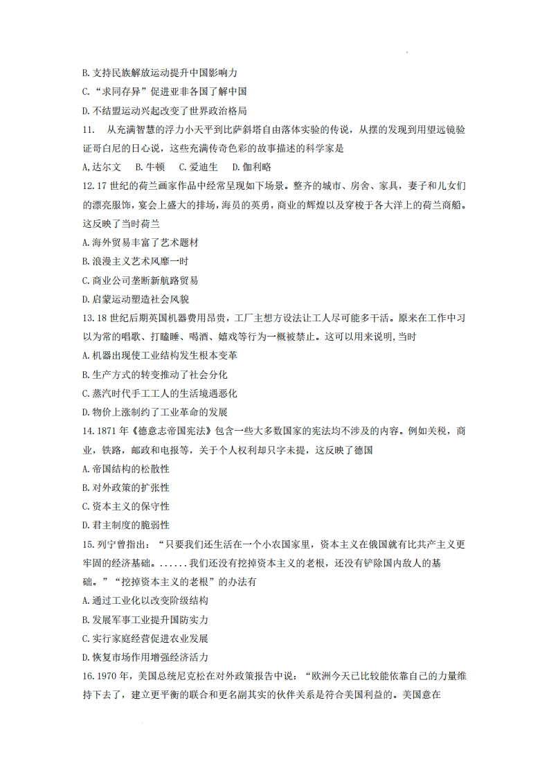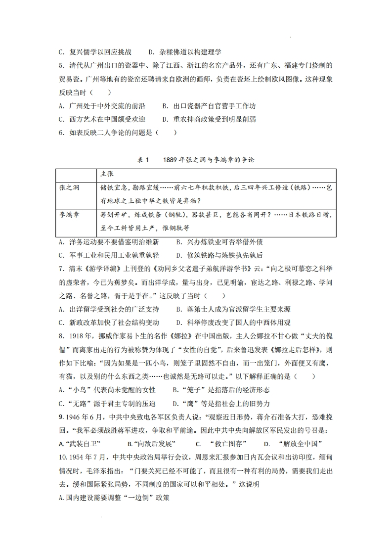 广东省2022年普通高中学业水平选择性考试历史1.考古材料是研究历史的重要依据。下列选项中,材料与结论之间逻辑关系正确的是(材料结论A内蒙古克什克腾旗出土商朝的青铜器商朝的统治范围到达内蒙古地区B山西晋国都邑遗址出土春秋早期的铁器残片春秋早期己经使用铁器C湖北大治铜矿治遗址出土东周时代的陶片大治铜矿的开采时间不早于东周D西安秦始皇陵兵马俑坑出上铁镞(箭头)秦朝军队主要使用铁制兵器A.AB.B C.C D.D2.“奉朝请”是两汉朝廷给子退休大臣和列侯、宗室、外戚的特殊待遇,被授予者特许参加朝会,地位也随之提高。东汉中叶以后,王、侯多不就国,而是以“奉朝请”的名义留驻京师,封国大权操于国相,这客观上()A.有助于遏制地方豪强势力的扩张B.埋下了东汉末年军阀割据的隐患C.为外戚干政提供了便利的条件D.有利于朝廷对封国的直接控制。3.图1为南北朝时期的北齐到隋唐政府机构变化示意图,这一变化()北齐情唐殿中吏部吏部户部祠部、扎郝度支兵部都官刑部五兵红部A.加强了中枢决策权B.避免了相权被分割C.降低了政令的执行效率D.使中央机构分工更明确4.魏晋以来佛教、道教广泛传播,宋人李觏认为原因在于“儒失其手,教化坠于地”:张载认为佛道追求的彼岸是虚幻的,与“吾儒”水火不容。由此可知,李觏,张载主张()A.儒法并用以维护君权B.立足考据以重建学风