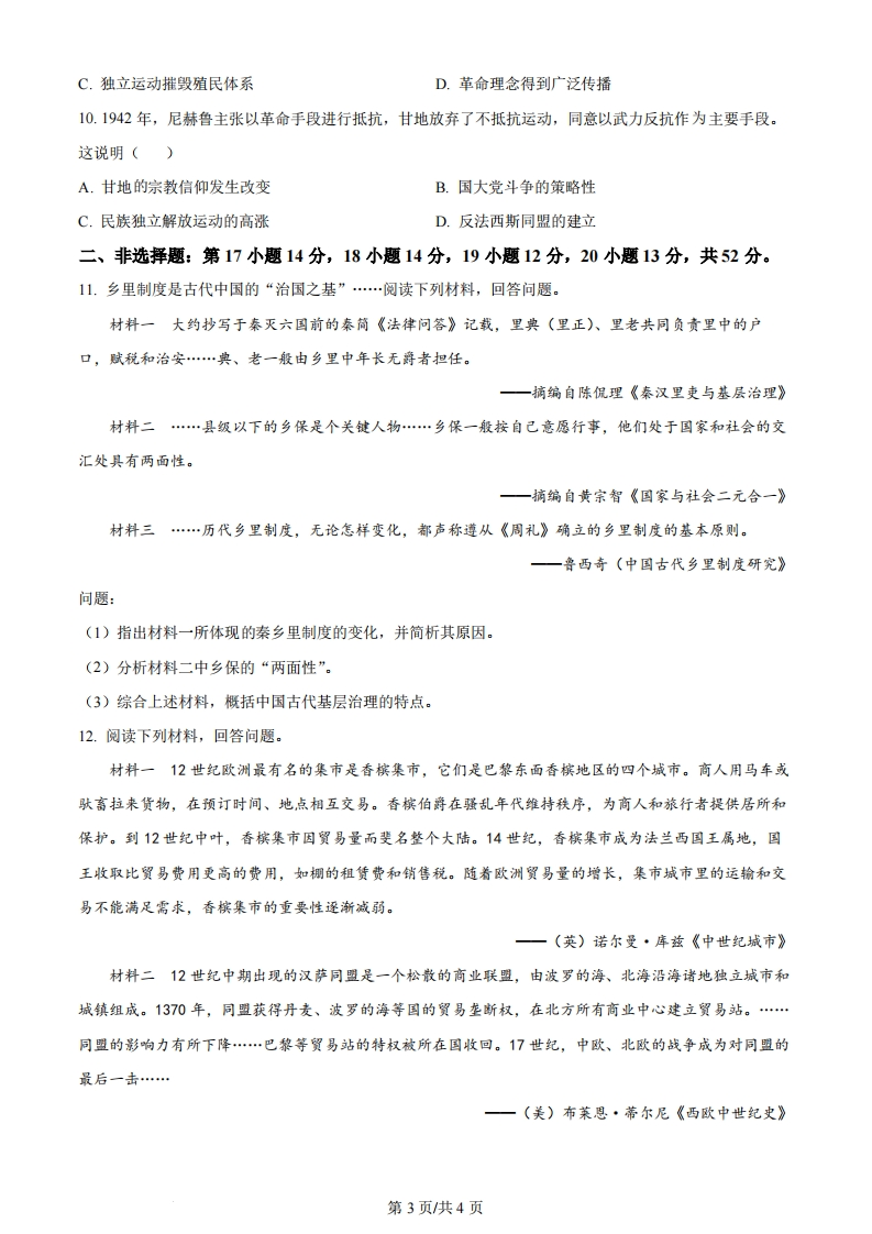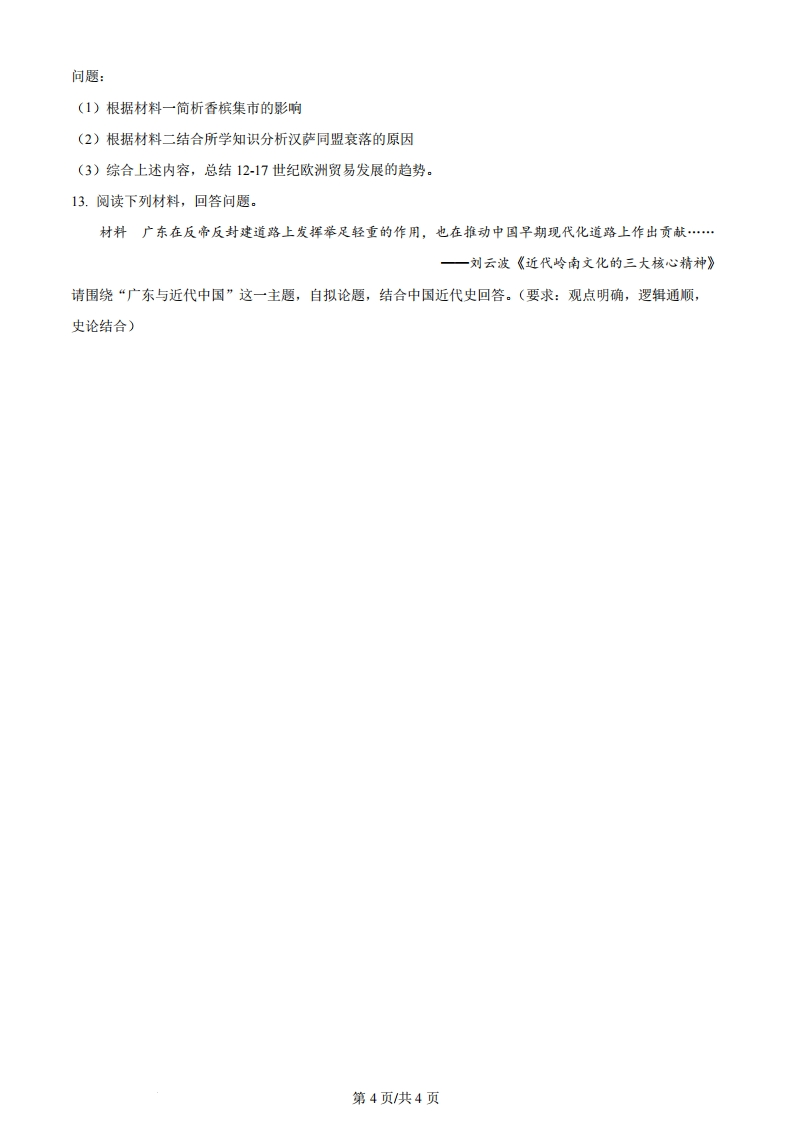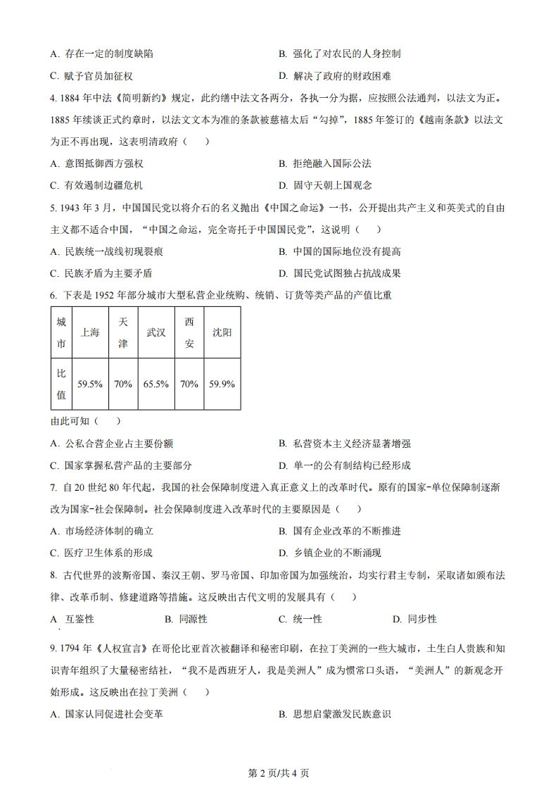 广东省2024年普通高中学业水平等级考试历史注意事项:1答卷前,考生务必用黑色字迹钢笔或答字笔将自己的姓名、考生号、考场号和座位号填写在答题卡上。用2B铅笔将试卷类型(A)填涂在答题卡相应位置上。将条形码横贴任答题卡右上角“条形码粘贴处”2.作答选择题时,选出每小题答案后,用2B铅笔把答题卡上对应题目选项的答案信息点涂黑;如需改动,用橡皮擦干净后,再选涂其他答案,案不能在试卷上。3.非选择题必须用黑色字迹钢笔或签字笔作答,答案必须写在答题卡各题目指定区域内相应位置上:如需改动,先划掉原来的答案,然后再写上新的答案:不准使用铅笔和涂改液。不按以上要求作答的答案无效。4.考生必须保持答题卡整洁。考试结束后,将试卷和答题卡一并交回。一、选释题:本题共16小题,每小题3分,共48分。在每小题列出的四个选项中,只有一项是最符合题目要求的。1.据研究,古代礼制记载的春秋时期酒器礼器,分为爵、觚、觯、角、散五种,称为“五爵”,其名来自于商、周时期的青铜酒器礼器。实际上,春秋时期的五爵为漆木酒器,其容量依次为一至五升,“宗庙祭祀,贵者献以爵、贱者献以散”。春秋时期礼器的变化反映出()A.礼器形制趋同说明礼崩乐坏B.宗庙祭祀遵循天人合一观念C.漆木酒器彰显人文关怀D.以小显贵维系封建等级秩序2.如表《魏书》记载的部分皇帝赏赐道武帝登国3年(388年)杂畜十余万…各有差明元帝永兴5年(413年)赏征还将士牛马、奴婢各有差太武帝始光4年(427年)留文武生口、缯帛、马牛各有差由此可知()A.北方游牧经济衰落B.封建等级制度森严C.鲜卑民族习俗的延续D.俸禄制改革不彻底3.两税法以田地、杂税等资产评定户等,但对杂税种类及其价值没有明确规定。唐文宗时,湖州刺史在其所属五县,“自立条制,自田地、奴婢,及竹、树、鹅、鸭等并估计税钱,差军人一千一百五十人散入乡村,检责剩征税钱4千9百余贯”结果被朝廷以扰人罪名贬官,这说明两税法()第1页共4页