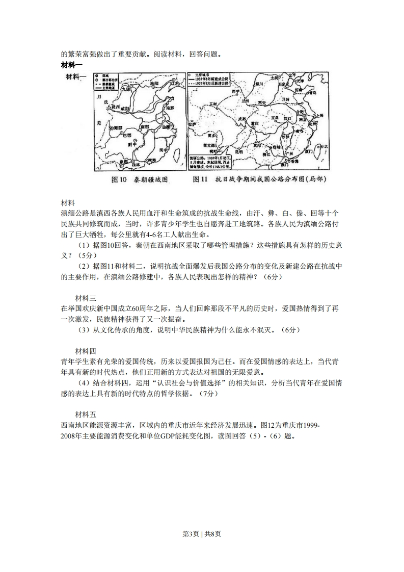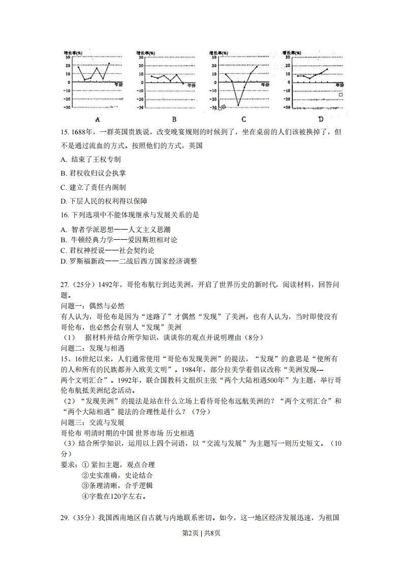 【2010年山东卷】9.“视人之国,若视其国:视人之家,若视其家:视人之身,若视其身。”这一主张属于A儒家“仁爱”思想B.墨家“兼爱”思想C.儒家“礼治”思想D.墨家“非攻”思想10.宋朝形成了“中书主民,枢密院主兵,三司主财,各不相知”的局面。这反映出A.宰相职权范围扩大B.专制皇权达到顶峰C.君权对相权的制约D.中央对地方控制加强11.图5为一位同学的课堂笔记,记录了对某一历史事件的不同评价。据此,推断他学习的内容是:A.太平天国运动B.义和团运动C.辛亥革命D.北伐战争基有创千中国边作你理由:0打击辽外风侵略格如本国扫滨统治且接出的试些思想县有边代化的因素斗阻糊了中边代化定由:以破坯了中国派先进省伤的生字力且提出的一些攻策吴历义的倒滨图512.清末民初山西有一首歌谣:破戏台,烂秀才,小足扳子洋烟袋:火车站,德律风(指电话),大足板子毕业生。这反映出当地口1、传统习俗受到冲击2、文化教育日渐衰落3、生活方式发生变化4、思想观念有了改变A.0B.▣C.aD.①③④13.1938年10月,毛泽东在中共中央六届六中全会上所作的政治报告中指出:没有抽象的马克思主义,只有具体的马克思主义。他在这里强调的是A.少谈些抽象的主义,多研究具体的问题B.马克思主义必须与中国革命的具体实践相结合C.必须研究马克思主义产生的具体历史条件D.马克思主义的立场和方法比基本原理更重要14.下列曲线图反映了我国1953~1958、1959~1964、1970~1975、1979~1984年四个时期国内生产总值(GDP)增长率的变化。其中与1959~1964年相对应的是第1页|共8页