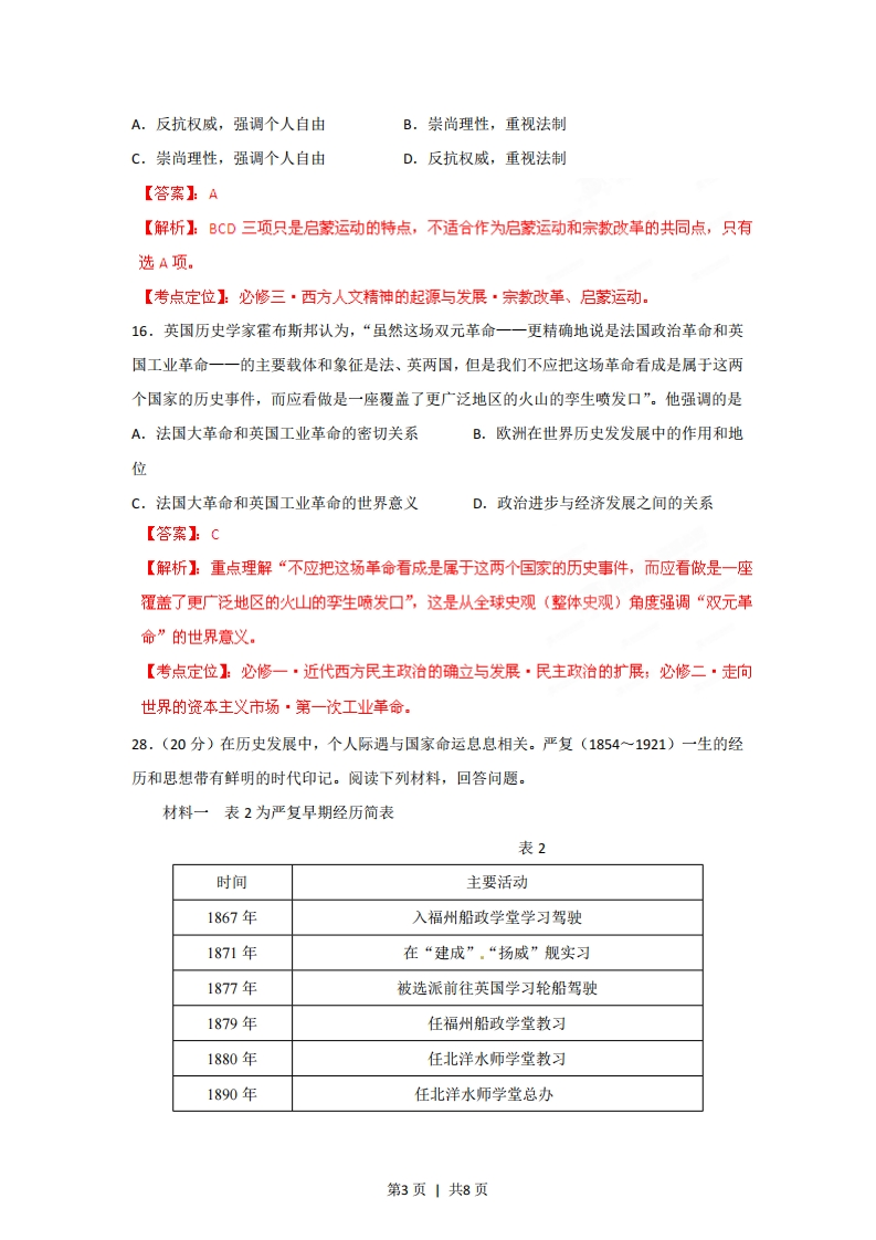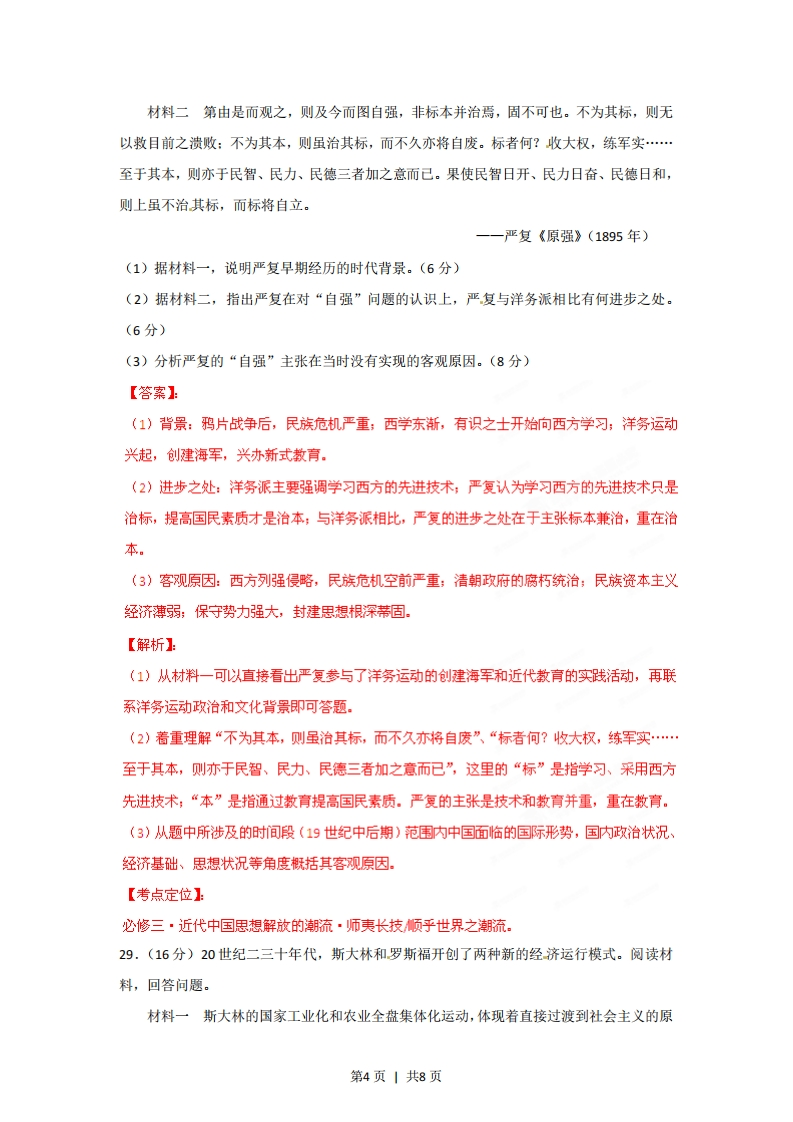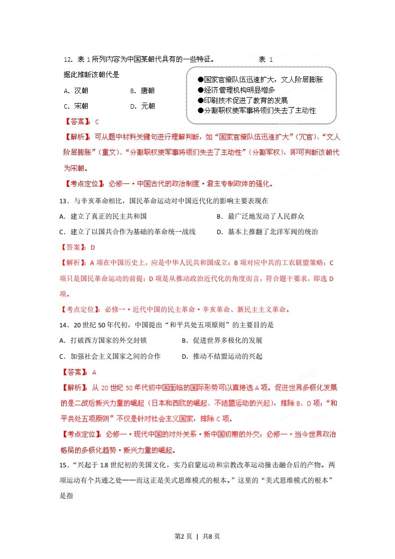 2012年高考山东文综历史试卷解析(精析word版教师版)【总评】:本套试题必修和选修兼顾考查。试题难度中等,基础性较强。部分选择题可用直选或排除法完成:非选择题突出考查了比较、联系、概括、开放探究等能力。9.有学者评论战国时期某学派说:“他们都是些注重实践的政治家…他们认为贵族的存在己不合时宜…他们把商人和学者看作是可有可无或多余的人。”这一学派是A.儒家B.道家C.墨家D.法家【答案1D【解析】注意题中的关键词及其理解,如“战国时期”、“注重实践”(因时而变)、“贵族的存在不合时宜”(法不阿贵)、“商人和学者看作是可有可无或多余”(重农抑商、文化高压),即可判断是指法家。【考点定位】必修三·中国传统主流思想的演变·百家争鸣。10.唐初以三省长官为宰相。高宗时,打破宰相任用资历限制,允许三省中四品以下官员以“同中书门下平章事”名义行宰相权,参预朝政。其目的是A.重用人才,推行科举取士B.分割相权,加强君主专制C.分工协作,提高行政效率。D.缓和矛盾,抑制朋党之争【答案】:B【解析】:题中,唐高宗时宰相资历门槛更低、数量更多,这是弱化相权、强化君权的反映。【考点定位】:必修一·中国古代的政治制度·君主专制政体的强化之中央官制变化。11.《登州府志》记载,“纺织花布,以自衣被。穷乡山陬(z0u,山脚),无问男妇为之,其织作须织工。勤有余布,亦兼鬻(心,卖)于乡市,复有布贾贩之城市”。这反映出当时登州①自然经济解体②家庭手工业发展③商品经济发展④出现经济区域分工A.①②B.②③C.③④D.①④【答案】B【解析】题中材料表明,登州乡村中织布首先自给自足,有余布再少量卖到乡市,再转卖到城市。依据题中材料得出①④两项结论,故排除。【考点定位】必修二·中国古代的经济结构·中国古代的手工业、商业。第1页1共8页