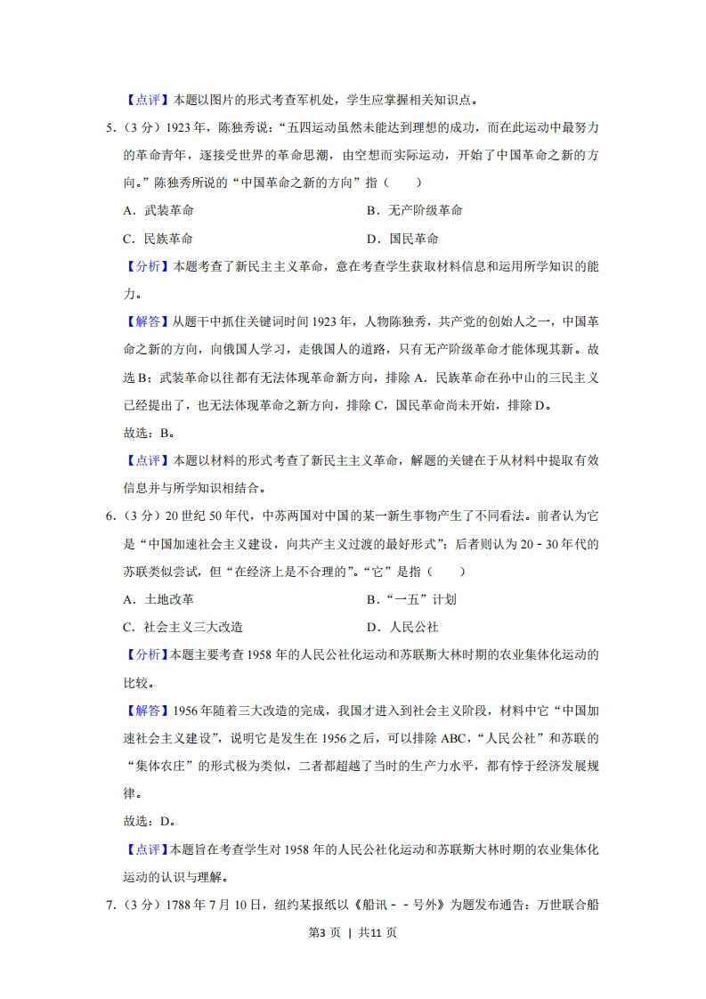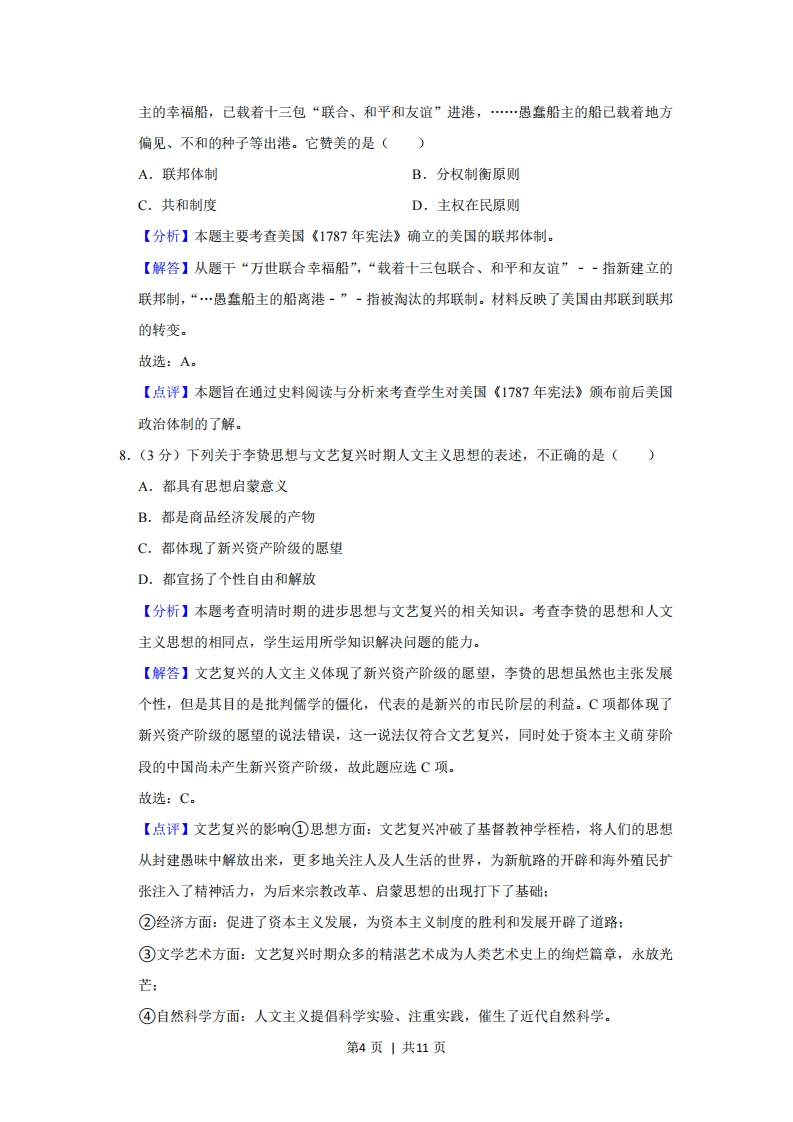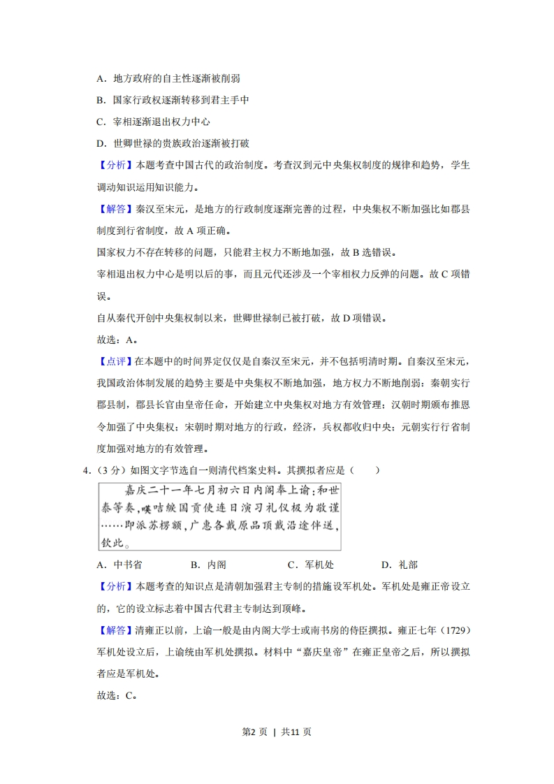 2013年山东省高考历史试卷事考答来与试想解析一、选择题(共8小题,每小题3分,满分24分)1.(3分)《周礼·考工记》载:建造王城,九里见方,四周各三门,南北和东西大道各九条,宫城之左为宗庙,右为社稷,前为朝,后为市。它体现的主要思想是()A.中央集权B.中正有序C.敬天法祖D.君权神授【分析】本题主要根据题干材料提取有效信息分析出建造的王城大小,形状,门,路和设置都清晰明确,体现中正有序。【解答】A.中央集权到秦朝才形成。B.从材料中提取有效解题信息,建造的王城大小,形状,门,路和设置都清晰明确,体现中正有序。C.材料中虽然有宗庙和社稷,但没有体现“法祖。D.材料仅仅是对王城的建造进行描述没有体现君权神授,明确的提出君权神授是董仲舒。故选:B。【点评】本题旨在考查学生对西周政治制度和封建政治制度的了解,需要学生一定史料阅读与分析的能力。2.(3分)《汉书·食货志》记载:“贾人有市籍,及家属,皆无得名田,以便农。敢犯令,没人田货。”该禁令的主要目的是()A.限制商人经营范围B.增加赋税收入C.加强商人户籍管理D.保护小农经济【分析】本题主要考查学生对中国古代“重农抑商”政策的理解掌握。【解答】商人不得购买土地(“名田”),是为了防止商人兼并土地,保护小农:违反禁令者,没收田地与财物。A项符合史实,但在材料中无从体现:材料体现对商人购买土地进行处罚,并不是加强商人户籍管理,排除C:B项也与材料含义无关。故选:D。【点评】本题旨在通过史料阅读与分析的形式考查学生对中国古代基本经济政策“重农抑商”政策的理解。3.(3分)自秦汉至宋元,中国政治制度变革的总体趋势是()第1页|共11页