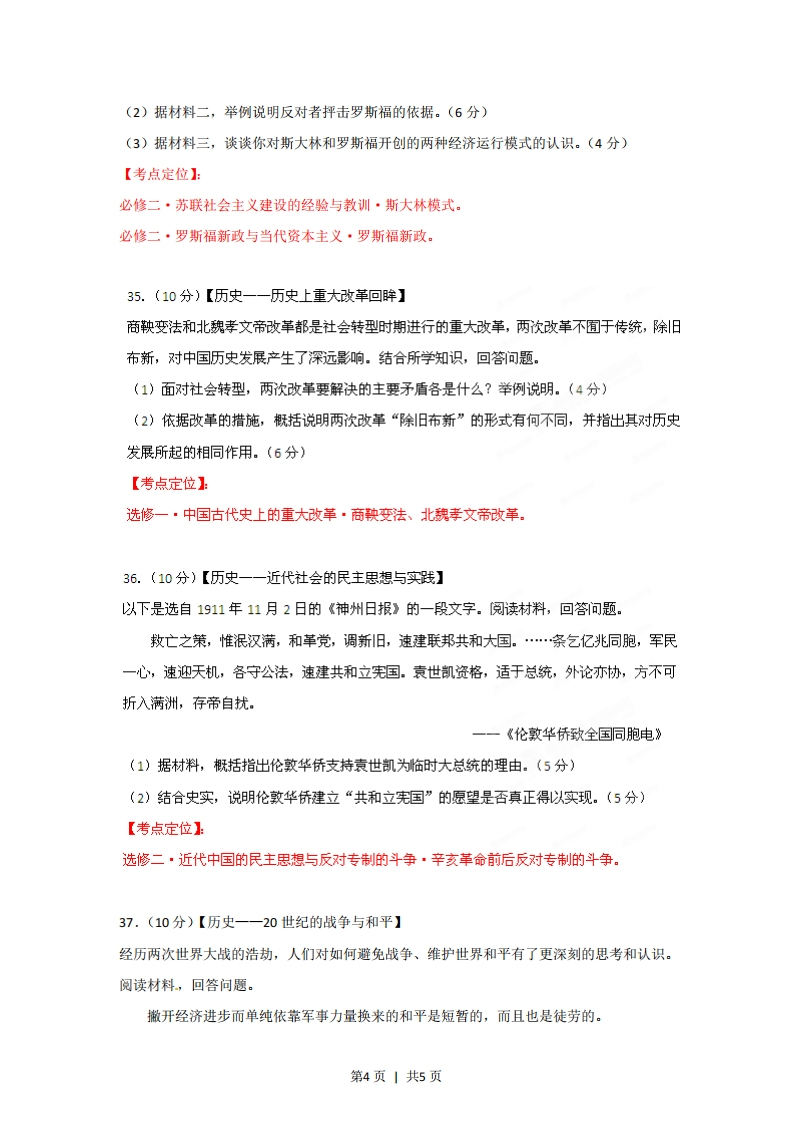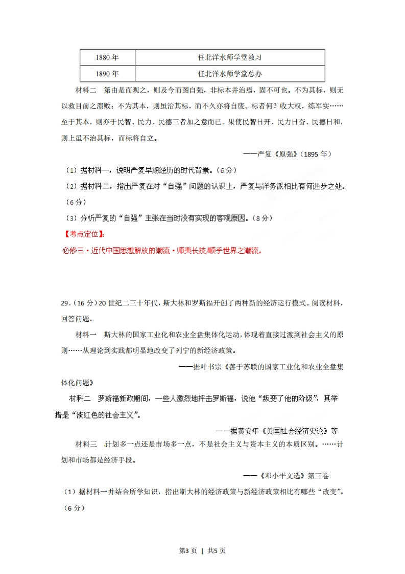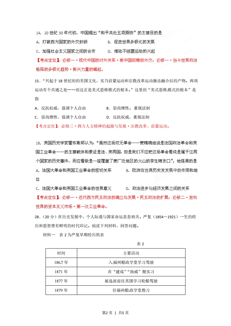 2012年高考山东文综历史试卷解析(精析word版学生版)(答案和解析见教师版)【总评】:本套试题必修和选修兼顾考查。试题难度中等,基础性较强。部分选择题可用直选或排除法完成:非选择题突出考查了比较、联系、概括、开放探究等能力。9.有学者评论战国时期某学派说:“他们都是些注重实践的政治家…他们认为贵族的存在已不合时宜…他们把商人和学者看作是可有可无或多余的人.”这一学派是A.儒家B.道家C.墨家D.法家【考点定位】必修三·中国传统主流思想的演变·百家争鸣。10.唐初以三省长官为宰相。高宗时,打破宰相任用资历限制,允许三省中四品以下官员以“同中书门下平章事”名义行宰相权,参预朝政。其目的是A.重用人才,推行科举取士B.分割相权,加强君主专制C.分工协作,提高行政效率D.缓和矛盾,抑制朋党之争【考点定位】:必修一·中国古代的政治制度·君主专制政体的强化之中央官制变化。11.《登州府志》记载,“纺织花布,以自衣被。穷乡山陬(z0u,山脚),无问男妇为之,其织作须织工。勤有余布,亦兼鬻(ù,卖)于乡市,复有布贾贩之城市”。这反映出当时登州①自然经济解体②家庭手工业发展③商品经济发展④出现经济区域分工A.①②B.②③c.③④.D.①④【考点定位】:必修二·中国古代的经济结构·中国古代的手工业、商业。12.表1所列内容为中国某朝代具有的一些特征.表1据此推断该朝代是●国家官僚队伍迅速扩大,文人阶层膨胀A.汉朝B.唐朝●经济管理机构明显增多●印刷技术促进了教育的发展C,宋朝D.元朝●分割职权使军事将领们失去了主动性【考点定位】必修一·中国古代的政治制度·君主专制政体的强化。13.与辛亥革命相比,国民革命运动对中国近代化的影响主要表现在A.建立了真正的民主共和国B.最广泛地发动了人民群众C,建立了以国共合作为基础的革命统一战线D.基本上推翻了北洋军阀的统治【考点定位】:必修一·近代中国的民主革命·辛亥革命、新民主主义革命。第1页1共5页