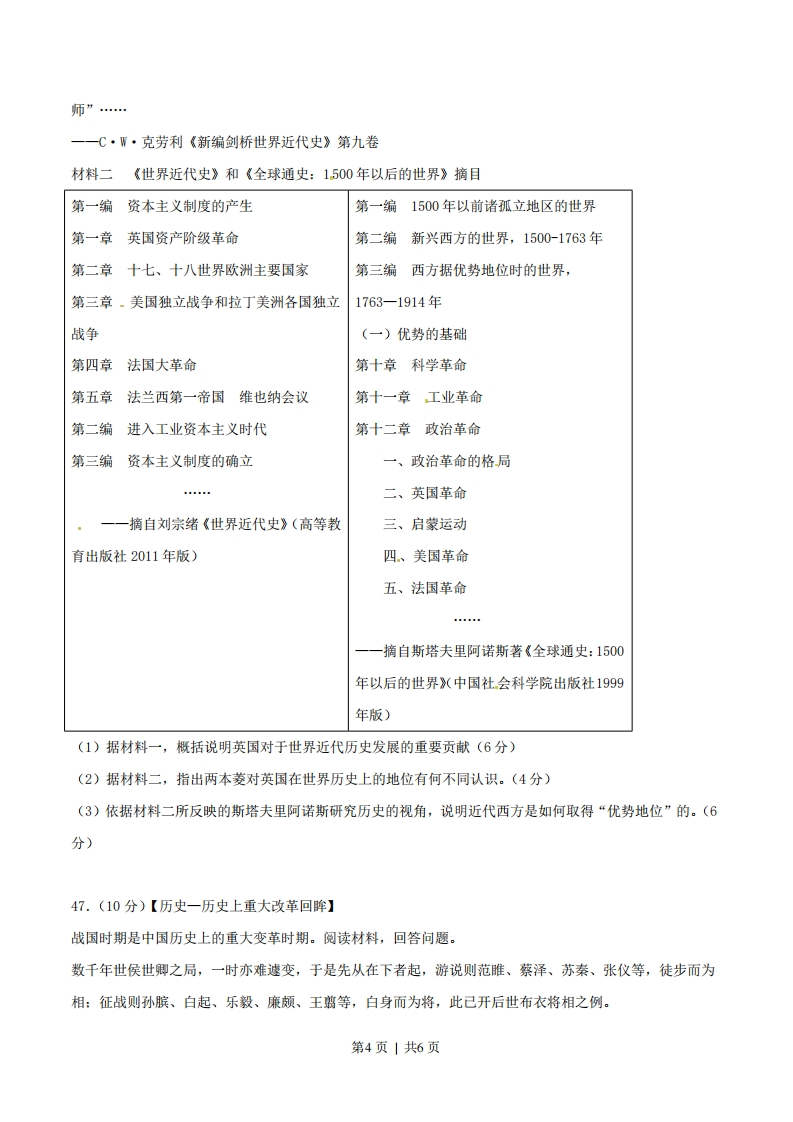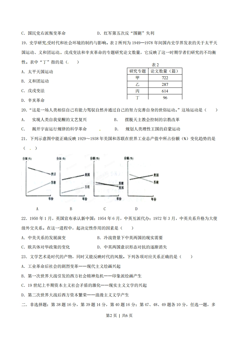 2015年山东高考文综历史解析(精编版)(学生版)一.选择题:共11小题,每题4分,共44分。每题只有一项符合题意,多选或错选均不得分。13.《尚书·酒借》云:“人无于水监(照镜子),当于民监。”这句话体现的思想是()A.兼爱尚贤B.主权在民C.以民为本D.道法自然14.唐宋时期,地方官任职避亲,避籍渐成定制。该制度旨在一()A.瓦解宗法体系B.防止地方势力膨胀C.健全地方行政机构D.完善地方监察制度15.“中国历史与西方历史的会合结束了中国的闭关自守,使它越来越多地介入世界事务,乃至于到今天,在中国或西方发生的事情都会即时产生相互的影响。”这强调的是()A.中国近代历史发展中西方的主导性B.近代中国和世界的碰撞与融合C.中国按照西方模式向近代社会演变D.中国近代史是西学东渐的过程16.下列四项为中国近代不同时期的考题,其中19世纪70年代初洋务学堂使用的考题应是()A.“蒸汽有力可用,由何而生B.“论吾国银行失信用之可惧。”C.“试比较英、美、法、瑞士、中国行政机关元首之产生方法。”D.“法国大革命对于欧洲民族主义之发展,有何影响?试举例明之。”比重(保)30201g7113:19110119111921年份图517.图5是英、德、俄、日四国中的某一国在中国出口贸易总额所占比重.(%)变化示意图,这一国家是()A.英国B.德国C.俄国D.日本18.1925年,苏联建立了为中国革命培养干部的莫斯科中山大学。1928年9月,苏联将莫斯科中山大学与莫斯科东方大学中国部合并,改名为“中国劳动者共产主义大学”。苏联更改校名是基于中国()A.革命统一战线建立B.北洋军阀统治基本被推翻第1页|共6页