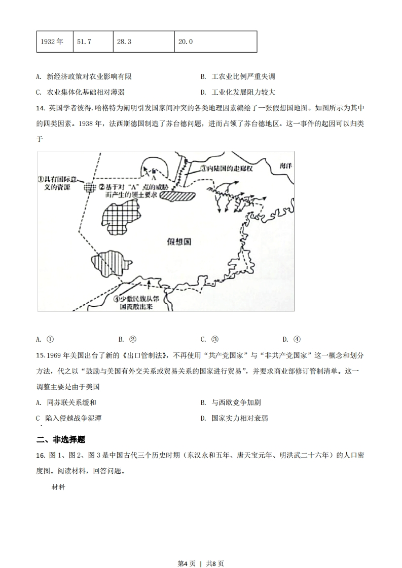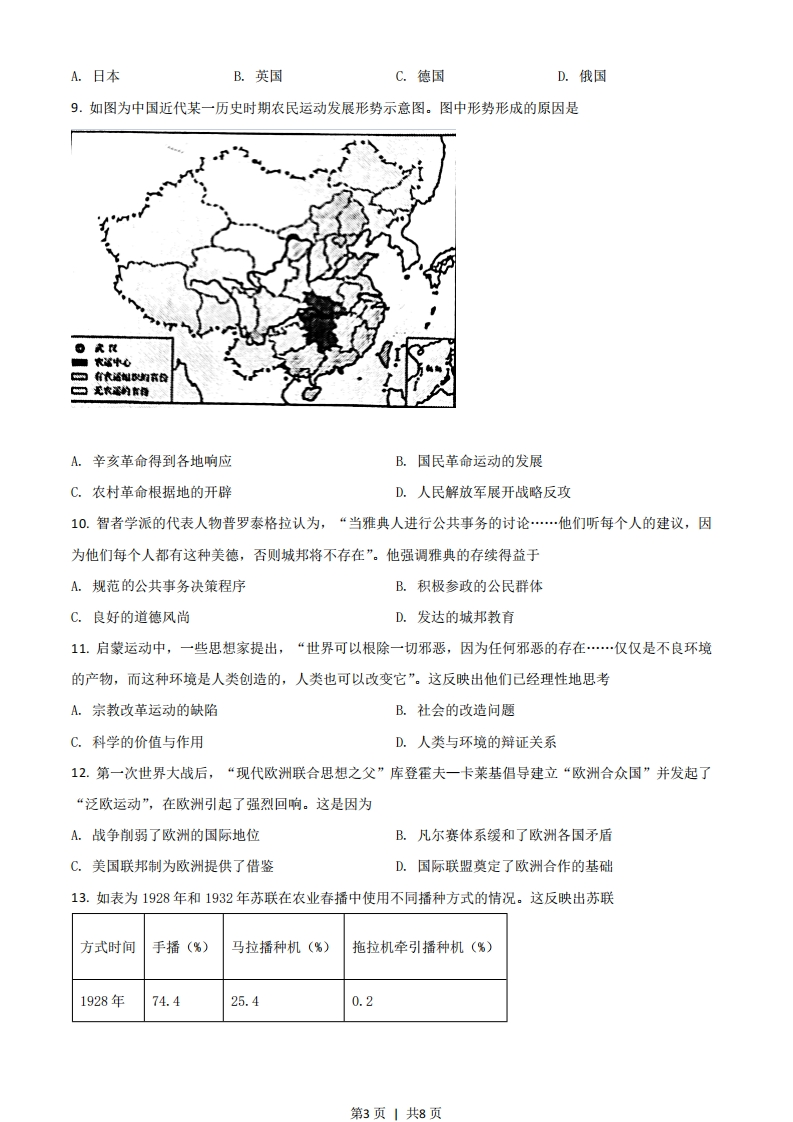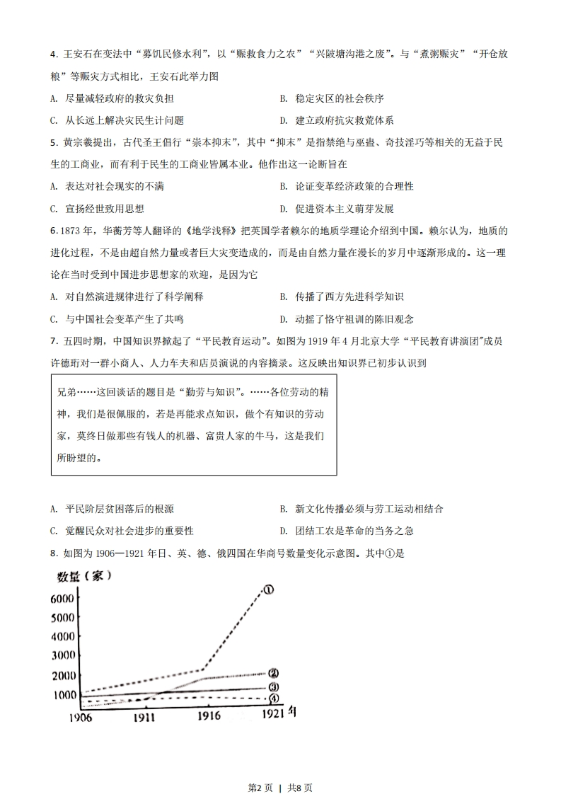 山东省2020年普通高中学业水平等级考试历史注意事项:1.答卷前,考生务必将自己的姓名、考生号等填写在答题卡和试卷指定位置。2。回答选择题时,选出每小题答案后,用铅笔把答题卡上对应题目的答案标号涂黑。如需改动,用橡皮擦干净后,再选涂其他答案标号。回答非选择题时,将答案写在答题卡上。写在本试卷上无效。3。考试结束后,将本试卷和答题卡一并交回。一、选择题1.战国时期,孟子认为“无礼义,则上下乱”,韩非子认为“义者,君臣上下之事”。他们所说“义”的实质是A.中央集权政治的准则B.衡量道德修养的标准C.统治阶层的行为规范D.维护等级秩序的工具2.先秦至西汉前期,山东东部地区得“鱼盐之利”,总体上是商业活跃的地方。西汉中期以后,这一地区的商人活动开始步入低谷。这是由于西汉政府A重视关中地区经济发展B.强化了经济控制C.开通了丝路贸易D.以儒家义利观教化百姓3.如表为唐代瀚林学士的起源和演进概况。它反映了唐代时期概况高祖、太宗时设立文学馆,弘文馆等学士,备君主顾问期高宗、武后时学士开始参与决策事务期开开元初,设翰林待诏,后改为翰林学士,建立学士院,专掌最机密的诏令起草,正玄宗时期式参与朝政决策A.翰林学士逐渐控制了决策权B.文官地位日益提高C.三省六部制渐趋成熟D.朝廷内部权力的再分配第1页1共8页