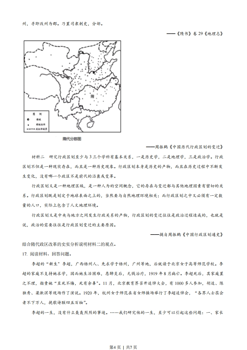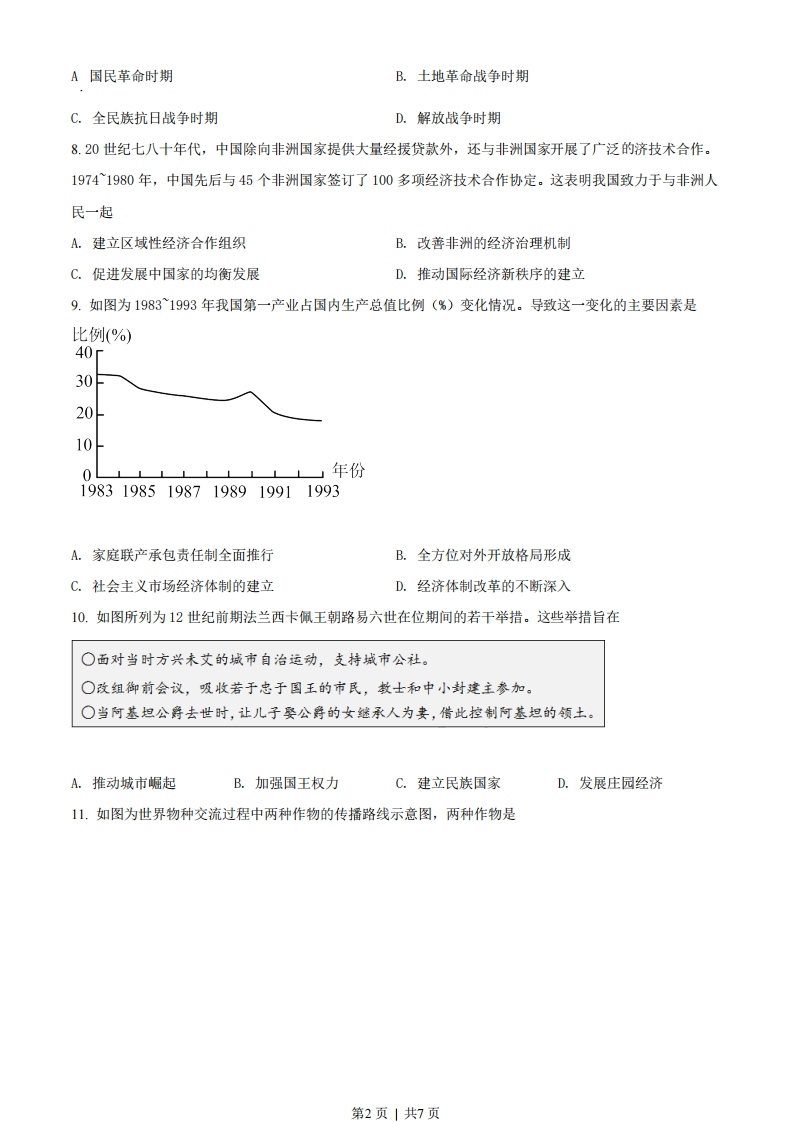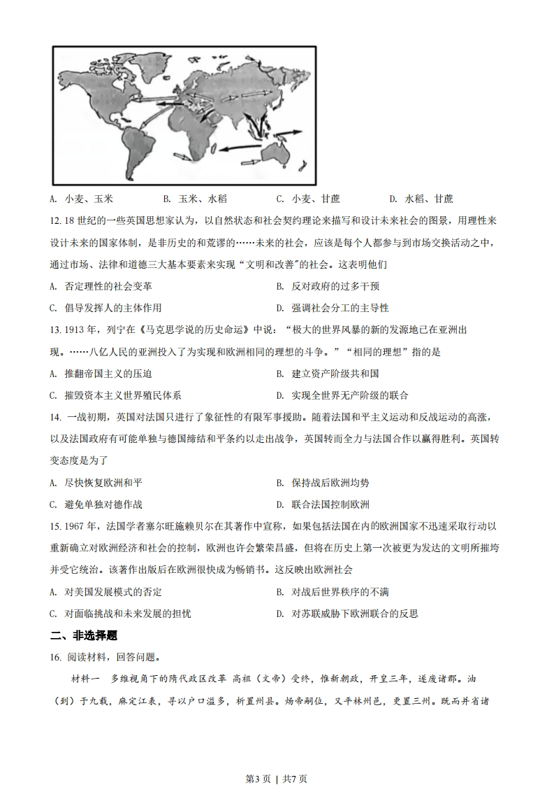 山东省2022年普通高中学业水平等级考试历史试题一、选择题1.战国时期,法家两大派之一的田齐法家主张“君臣上下贵贱皆从法”“君臣不用礼仪教训则不详。”这反映其思想特点是A.尚法存礼B.尊法敬天C.崇德重法D.外儒内法2.云梦秦简《日书》对选择善马的标准有严格规定,汉代官府内有专门学习相马理论者,相马术己成为专门技术自设一科,与书数、射御等同。这一时期相马术的发展主要服务于A.农耕技术的推广B.商业交往的便利C.军事战争的需要D.礼乐制度的重建3.目前考古发现的宋代纺织品,主要有福建福州黄异墓的纺织品和衣物300余件,江苏金坛周璃墓的衣物50余件,江苏武进宋墓衣物残片。湖南南阳宋墓和宁夏西夏陵区108号墓丝麻织品,赣江兰溪南宋墓棉毯,江西德安南宋周氏墓丝织衣裙,浙江台州南宋赵泊湮墓纺织品60余件等。据此我们可以推断,宋代A海上丝绸贸易兴盛B.纺织业中心位于南方C.衣料材质发生明显变化D.南方纺织技艺己超过北方4.明朝时期,朝廷除对各地的监察御史进行考核外,还要求地方按察使司按时据实上报御史巡按地方时有无铺张浪费以劳州县等情况。这些规定旨在A.保证监察规范有效B.限制监察御史权力C.协调中央与地方的关系D.拓宽对地方的监察渠道5.1863年,学者张斯桂在为《万国公法》所作的序言中说:“间尝观天下大局,中华为首善之区、四海会同、万国来王,遐最勿可及己,此外诸国,一春秋时大列国也。一今美利坚教师丁匙良器译此书,其望我中华之曲体其情而俯从其议也。一则是书亦大有裨于中华用。储之以备筹边之一助云尔。”这反映了当时部分中国人A.否定传统宗藩体制B.力主融入国际社会C.倡导采用西方外交制度D.主张选择性吸收国际法原则6.19世纪6090年代,清政府推行洋务新政,创办一批近代企业:1901年清政府开始实行“新政”,积极振兴商务,奖励实业。这些举措表明两次“新政“在目的上的相同之处是A.求富救国B.实业救国C.以商救国D.富民救国7.新民主主义革命时期,中共中央曾就土地政策作出决定:“在处理农村纠纷中,党与政府的工作人员,不是站在农民或地主的某一方面”“一切有关土地及债务的契约的缔结须依双方自愿。契约期满,任何一方有解约之自由”。作出这一决定的时间是第1页」共7页