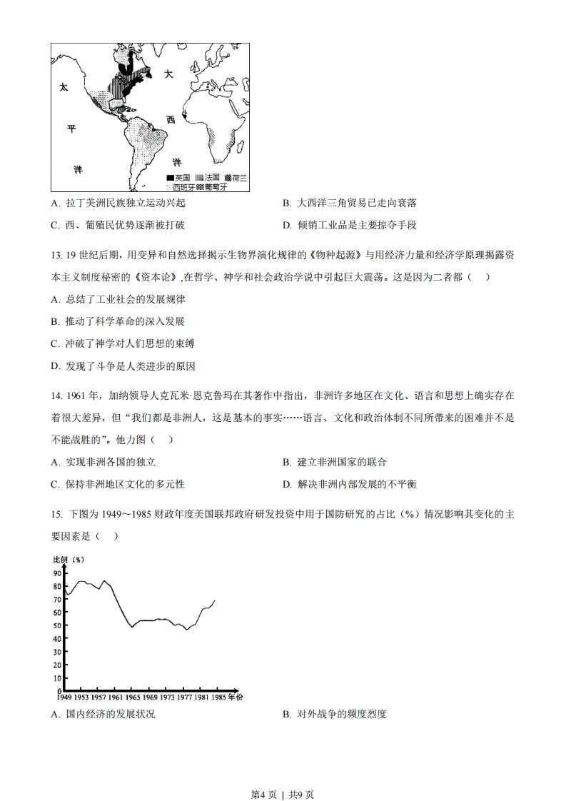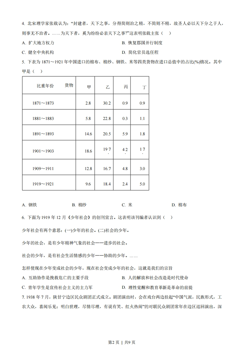 机密★启用前2023年全省普通高中学业水平等级考试历史注意事项1答卷前、考生务必将自己的姓名、考生号等填写在答题卡和试卷指定位置。2.回答选释题时,选出每小题答案后,用铅笔把答题卡上对应题目的答案标号涂黑如需改动,用橡皮擦干净后,再选涂其他答案标号。回答非选择题时,将答案写在答题卡上写在本试卷上无效。3.考试结束后,将本试卷和答题卡一并交回。一、选择题:本题共15小题,每小题3分,共45分。每小题只有一个选项符合题目要求。1.私有财产是生产力发展到一定程度的产物。下列与陶器相关的考古发现中,可以用来作为私有财产己出现证据的是()A.遗址出土有陶器和较多陶器碎片B.多人合葬墓随葬品有陶体、陶罐、骨器等C.单人墓随葬品有陶器、石磬、玉钺等百余件D.陶器上绘有丰官多彩的几何图案和动植物纹样2.先秦贵族尚马车,贱牛车,此风秦汉犹存。及至东汉晚期,天子至士因牛车慢、稳、宽敞、严密,可障帷设几、任意坐卧而竞相乘坐,出行乘牛车遂成为一种风尚。这种“风尚”反映了()A.政治衰颓的时代景象B.戒奢尚俭的社会风气C.重农崇耕的思想观念D.豪强势重的政治现实3.下图为西汉与隋京畿区示意图。与西汉相比,隋京畿区的变动是为了()西汉京鬱区□厢京抠A.减少制度变革阻力B.拓宽财政收入来源C.促进中原地区民族交融D.缓解关中地区经济压力第1页|共9页
