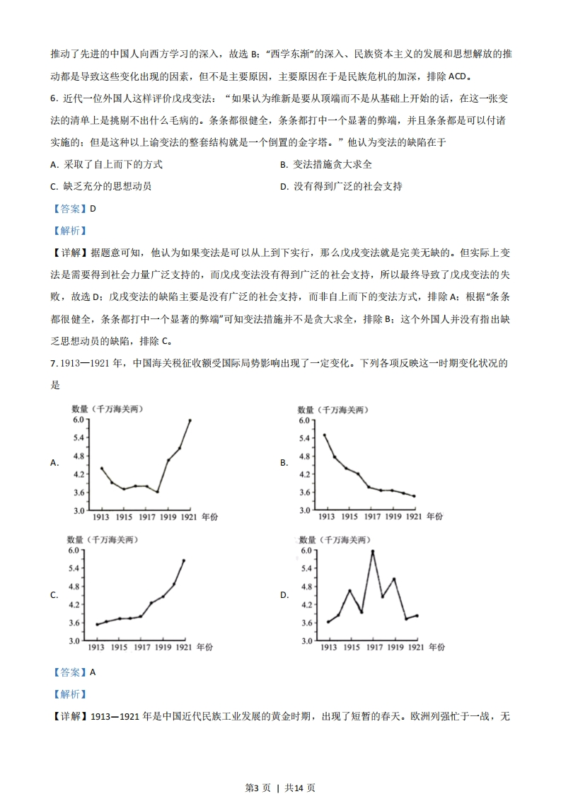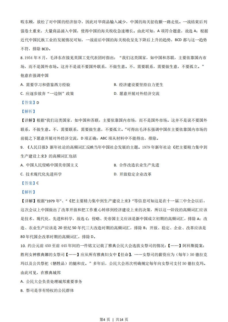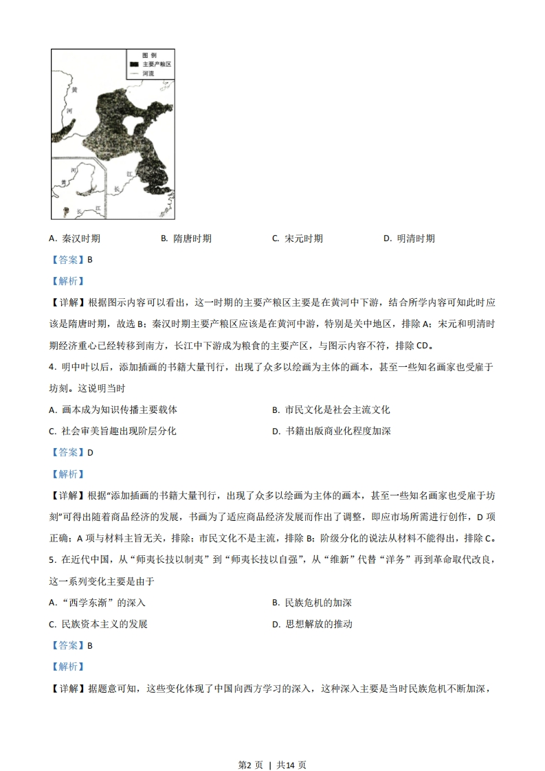 2021年山东省学业水平等级考试历史试题一、选择题1.儒家学派重视礼乐,宣扬“乐文同则上下和”:墨家学派人为乐“与君子听之,废君子听治”“与贱人听之,废贱人之从事”。这反映了两者A.文化取向的迥异B.政治立场的不同C.学术观点的分歧D.生活态度的差异【答案】B【解析】【详解】儒家学者认为礼乐能够促成社会和谐,而墨家认为礼乐不利于国家治理,反映了两者代表不同的阶级立场,政治立场不同,B正确:两者的差异不是文化取向上的差异,排除A:C是表象,排除:D与题无关,排除。2.汉高祖时期,王国职官设置与朝廷基本一致。如表为此后西汉统治者对王国职官的调整概况,这些调整的出发点是时期调整概况汉景帝时期改丞相为相:裁撤御史大夫、廷尉等汉武帝时期郎中令减秩为千石:改太仆(秩两千石)为仆(秩千石)汉成帝时期裁撤内史:令相治民,与郡太守无异A.精简地方行政机构B.节约中央财政开支C.维护国家政治统一D.废除郡国并行体制【答案】C【解析】【详解】汉代裁撤王国机构,降低王国官员的品轶,这是打击诸侯国的举措,目的在于加强中央集权,维护国家政治统一,C正确:地方机构还有郡县,但是西汉主要针对的是王国机构,因此A不是出发点,排除:王国官员的俸禄由王国支出而非中央,排除B:D不符合史实,排除。3.如图是中国古代某一历史时期主要产粮区示意图。该时期是第1页1共14页