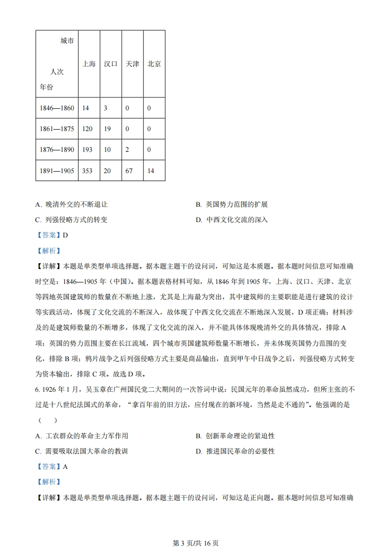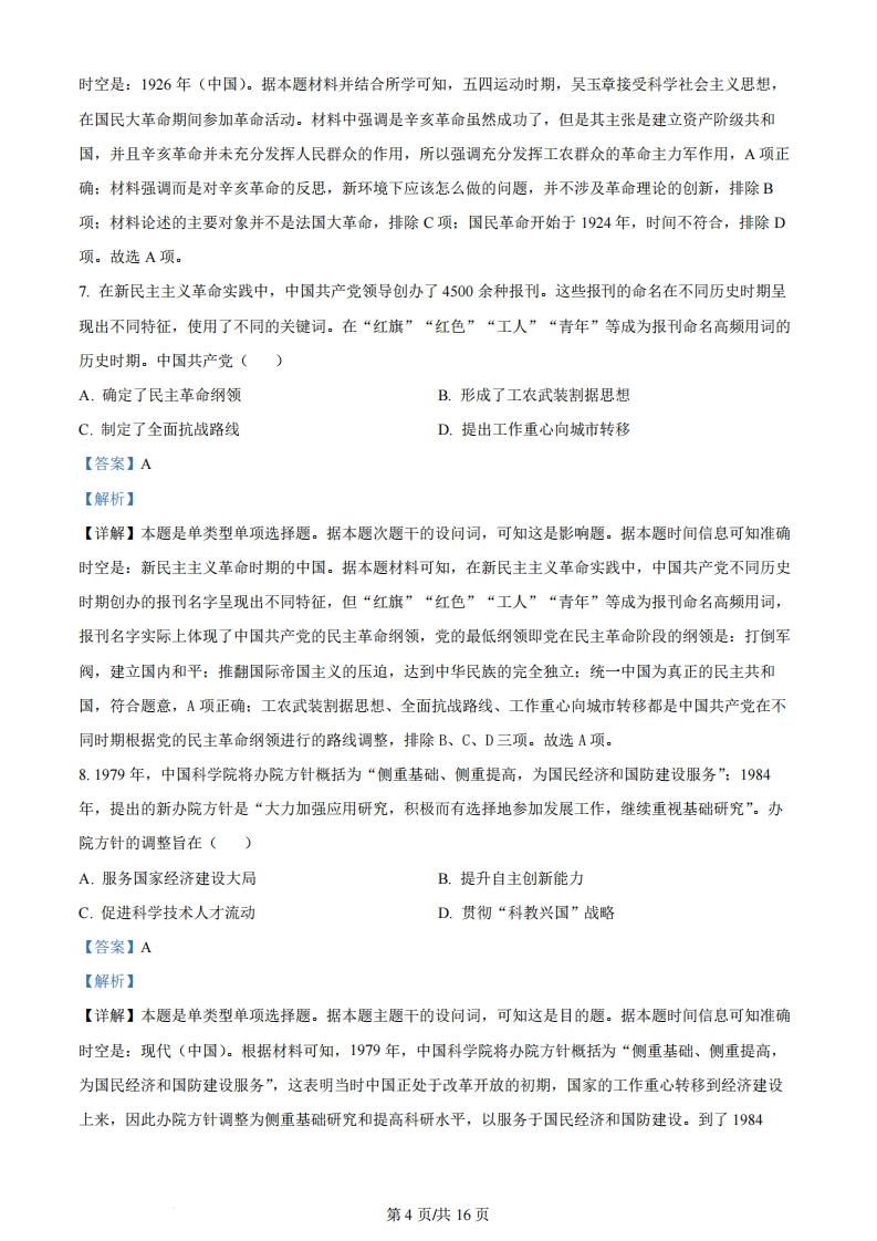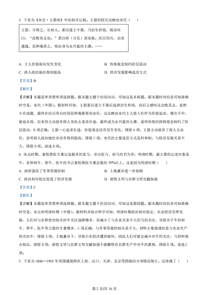 山东省2024年普通高中学业水平等级考试历史一、选择题:本题共15小题,每小题3分,共45分。每小题只有一个选项符合题目要求。1.商业是社会发展到一定阶段的产物。下列四处考古遗址所出土器物能表明商业己有较高程度发展的是()A.陶釜、蚌器、骨角器等B.指环、牙器、臂玉环等C.石斧、石磨棒、石磨盘等D.骨贝、青铜贝、包金贝等【答案】D【解析】【详解】本题是单类型单项选择题。据本题主题干的设问词,可知这是本质题。据本题时间信息可知准确时空是:石器时代(中国)。据材料并结合所学可知,骨贝、青铜贝、包金贝等都是早期的货币形式,货币的出现和发展是商业发展到较高程度的重要标志。有了专门用于交换的媒介(货币),说明商品交换更加频繁和复杂,商业活动更加活跃和成熟,D项正确:陶釜、蚌器、骨角器等主要是生活用品和生产工具,不能直接体现商业的较高程度发展,排除A项:指环、牙器、臂玉环等更多是装饰品,与商业的高度发展关联不大,排除B项:石斧、石磨棒、石磨盘等主要是用于农业生产的工具,不能表明商业的较高程度,排除C项。故选D项。2.西周时期,诸侯国在奉行周礼的同时,多尊重当地原有的风俗:春秋战国时期,诸侯国变革礼制,移风易俗,成为一种普遍现象。诸侯国转变做法主要是为了()A重构统治秩序B.限制贵族特权C.以德行教化民众D.打破宗法血缘关系【答案】A【解析】【详解】本题是单类型单项选择题。据本题主题干的设问词,可知这是目的题。据本题时间信息可知准确时空是:西周和春秋战国(中国)。据材料可知,西周时期,社会秩序相对稳定,诸侯国在遵循周礼的同时尊重当地风俗。而到了春秋战国时期,社会动荡,诸侯争霸,各国为了在激烈的竞争中胜出,需要重构统治秩序以增强自身实力,变革礼制、移风易俗就是重要手段,通过这种方式来适应新的形势和需求,建立起更有利于自己统治的秩序,A项正确:限制贵族特权不是主要目的,主要目的是从整体上构建有利于自身的统治秩序,排除B项:以德行教化民众只是其中一个方面,不是主要出发点,排除C项:宗法血缘关系在中国古代社会中具有重要地位,变革礼制,移风易俗并不能打破宗法血缘关系,排除D项。故选A项。第1页供16页