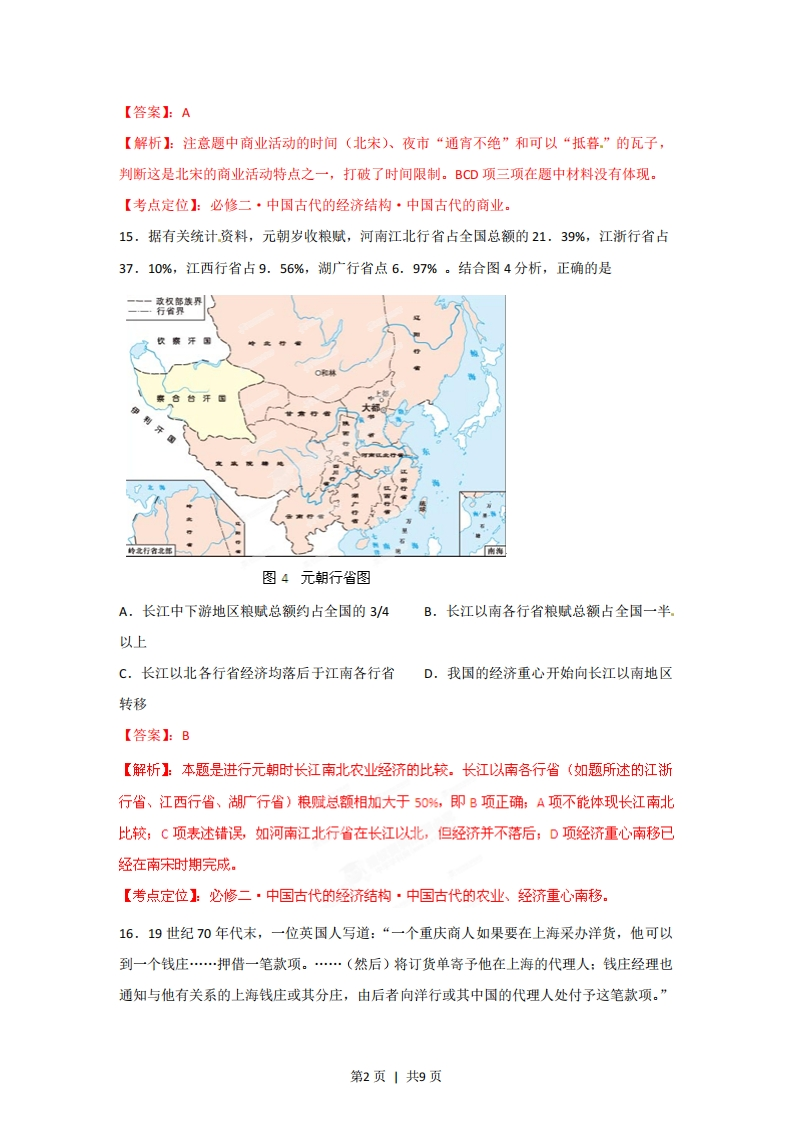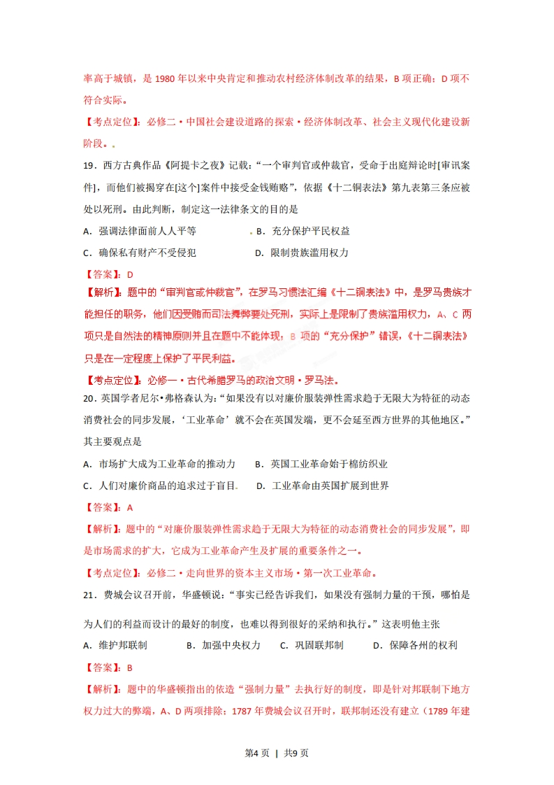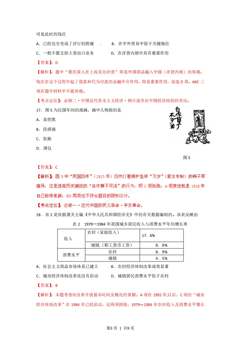 2012年高考安徽文综历史试卷解析(精析word版教师版)【总评】:本套试题图文并茂,考查面广,对认知、理解、归纳、概括、论证等不同能力层次的考查较为全面。但未涉及对中国近现代思想科技文化、世界近代以来科学技术与文学艺术的考查。12.2010年发行的首套宣纸材质的邮票《中国古代书法一一行书》,被称为国家名片与国宝艺术的完美结合,彰显了宣纸千年,墨润万变的独特魅力。图3中属于该套邮票的是:中国邮CHNA囊事食2020中国政D【答案】:C【解析】:按照中国古代书法常识,A项为隶书:B项为楷书:D项为草书。只有C项是行书。【考点定位】:必修三·中国古代的科技文化·中国古代的书法艺术。13.唐太宗曾对吏部尚书杜如晦说:“今专以言辞刀笔取人,而不悉其行,至后败职,虽刑戮之,而民己敝矣。”这句话意在强调A.应严刑处罚失职官员B.选官须注重才学C.官员失职会危害民生D.选官应注重品行【答案1:D【解析】:题中材料指出选官标准中片面注重言辞刀笔(语言、文章)的而不注重品行(道德)的弊端是害己害民,即D项所述。【考点定位】:必修一·中国古代政治制度·中国古代选官制度的演变。14.北宋东京(今开封)“通宵不绝”的夜市和“终日居此,不觉抵暮”的瓦子(文娱场所)里,随处可见流连忘返的市民身影。这一生活图景表明A.商业活动不受时间限制。B.市己经遍布城内各处C.文娱场所多由官府经营D.坊和市己没有区别第1页1共9页