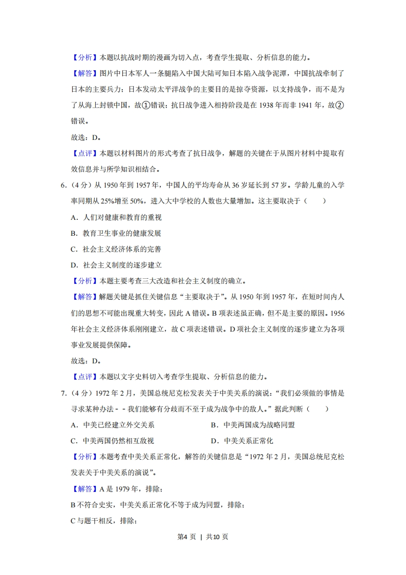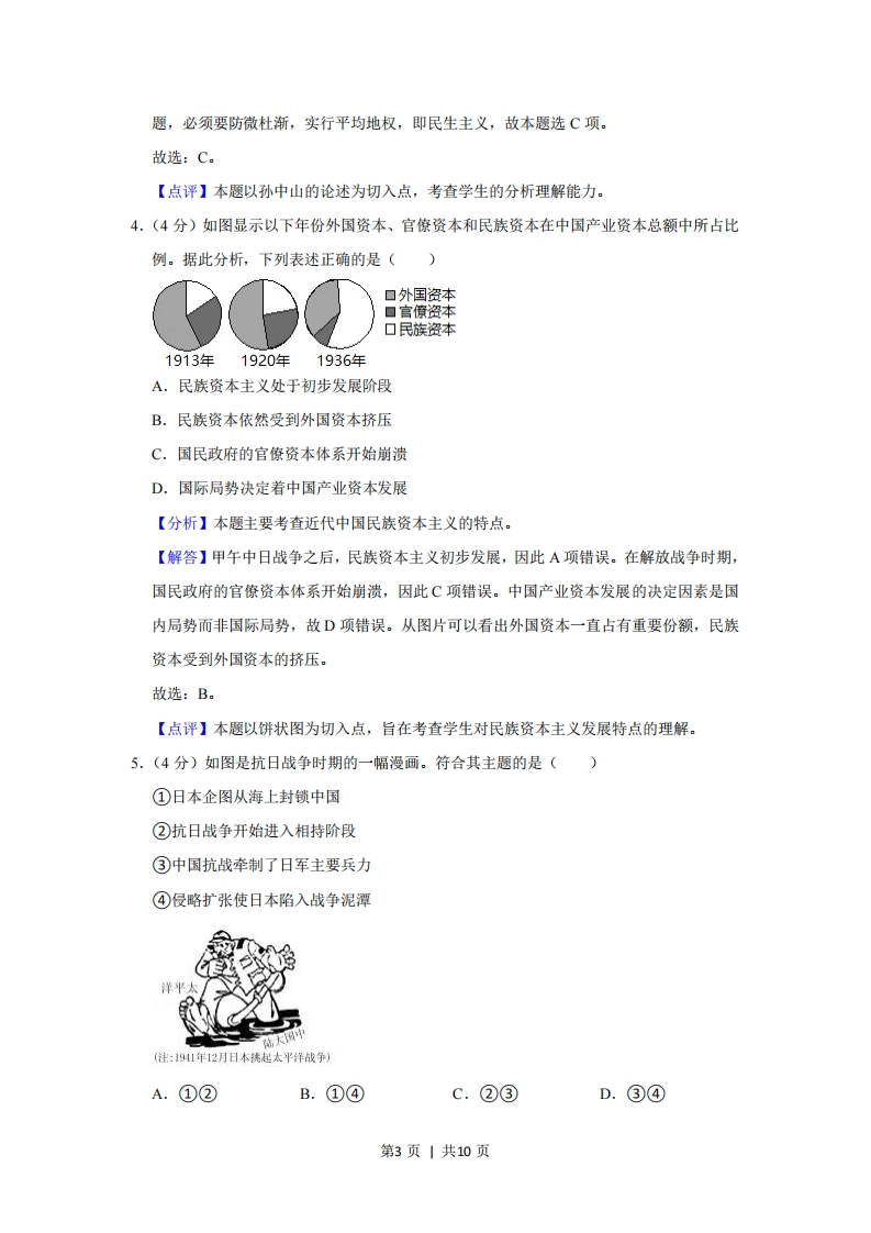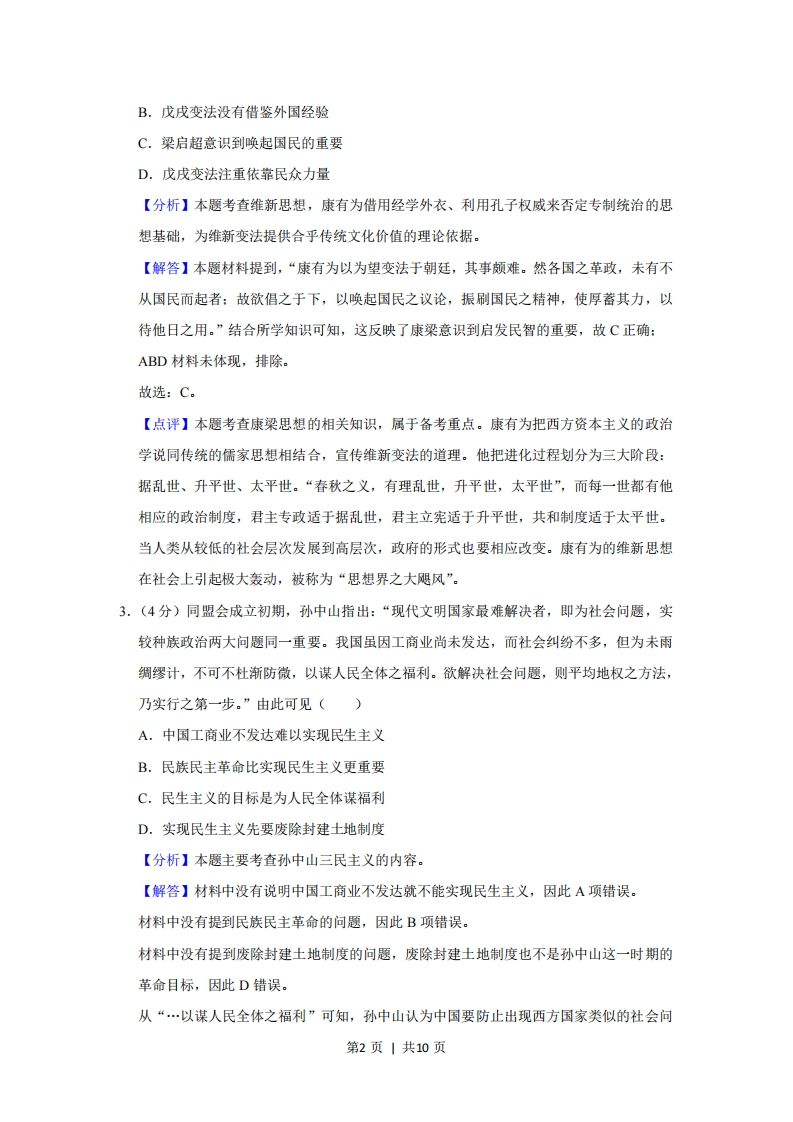 2013年安徽省高考历史试卷考答来与试题解析一、选择题1.(4分)如图是据有关资料绘制的汉唐间安徽境内水利兴修统计示意图。它反映了这一时期()15图110■次数0两汉三国两晋南北朝隋唐A.安徽农业生产总体呈上升趋势B.安徽农业生产规模与产值较高C.长江流域为农业生产重要区域D.我国经济重心己经完成南移【分析】本题主要考查中国古代的小农经济,试题难度一般,解题关键在于对材料和相关知识的准确把握。【解答】根据材料数据可知,汉唐间安徽境内水利兴修数量呈现增加的趋势,说明安徽农业生产总体呈上升趋势,A选项符合题意。材料不能得出安徽农业生产规模和产值的数量,B选项排除。仅从安徽一地生产不能进而推出整个长江流域,C选项排除。我国经济重心南移完成是在南宋,D选项排除。故选:A。【点评】本题侧重对材料分析和知识迁移能力的考查,解题关键在于对中国古代小农经济的准确把握。2.(4分)梁启超在《戊戌政变记》中写到:“康有为以为望变法于朝廷,其事颇难。然各国之革政,未有不从国民而起者,故欲倡之于下,以唤起国民之议论,振奋国民之精神,使厚蓄其力,以待他日之用。”这说明()A,康、梁认为变法不能依靠朝廷第1页|共10页