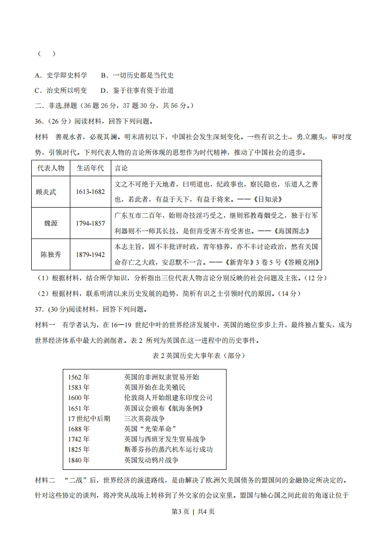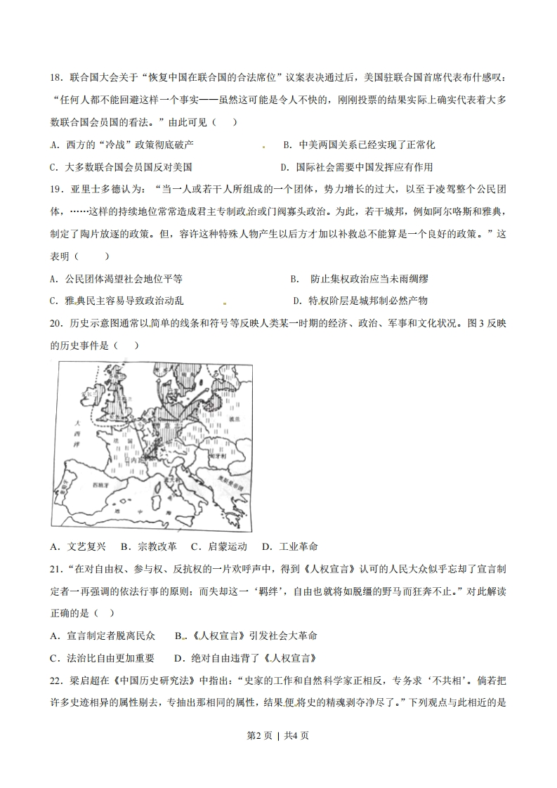 2015年安徽高考文综历史解析(精编版)一、选择题(本大题共11小题,每小题4分,共计44分)12.据《史记》载:一日,魏太子下车,向一位新贵一一宫廷文士田子方致意,竞未得到回礼。太子问:“究竞富贵者还是贫贱者应当骄傲?”田子方答:“贫贱者。”并解释,他随时都能在别国宫廷上被派上用场。这反映了()A.士人为诸侯国所重用B.士人轻视功名利禄C.诸侯国内部等级森严D,忠君思想己经形成13.河南尹田歆的外甥王谌,以知人出名,田歆对他说:“如今应推举六名孝廉,多有贵戚书信相命,又不好违背,我想自己选一名名士以报效国家,你助我求之。”这体现了(·)A.地方无选举权B.选拔官吏以品评为主C.察举制的弊端D.自上而下的选官方式14.北宋仁宗年间,贩卖婺州罗帛的沈赞沿路偷税,在富阳境内被县民蒋泽等人捉到。经杭州官府裁决,没收其货物182匹,蒋泽等人因此获得赏钱。这说明()A.官府重视商税收入B.杭州丝织业比婺州发达C.江南商业环境恶劣D.农本商末观念根深蒂固15.传教士郎怀仁等上书拿破仑三世:“现在我们能够自由地深入久闭的中国内地,在那里可以讲道、设堂、建设慈善机构。取得这个自由应当归功于陛下的大力保护,归功于北京的密切注视条约执行的公使。”据此判断,该不平等“条约”是()A.《南京条约》B.《北京条约》C.《马关条约》D.《辛丑条约》16.辛亥革命三十周年之际,《中央关于纪念今年双十节的决定》指出:“我们共产党人和全国一切真诚的革命志士,都是辛亥革命最忠实的继承者。我们共产党人誓与全国一切革命真诚志士一道,誓与全国人民一道,继续奋斗,不达目的,决不休止。”中共中央发表该决定,旨在()A、维护国共合作,坚持抗战到底B、推动国民大革命C、完成土地革命,争取民权自由D、实现人民民主专政17.有学者评价:“它凝结了毛泽东为代表的中国共产党人、民主党派和无党派民主人士的心血,又经过反复讨论、修改,所以得到了全国各方面人士的一致拥护。”据此判断,“它”是指()A.《双十协定》B.《论联合政府》C.《共同纲领》D.《论十大关系》第1页|共4页