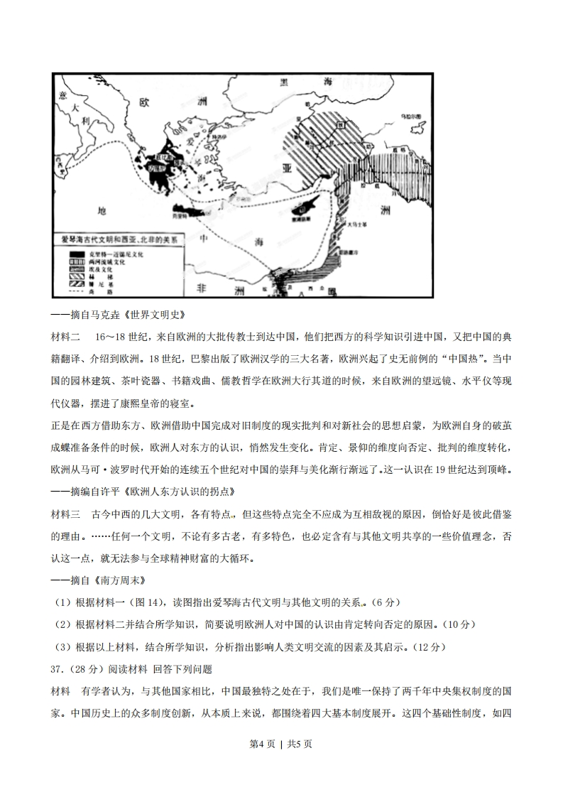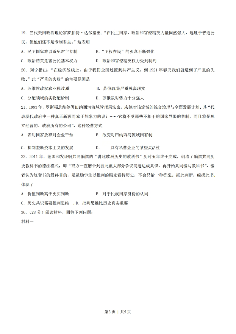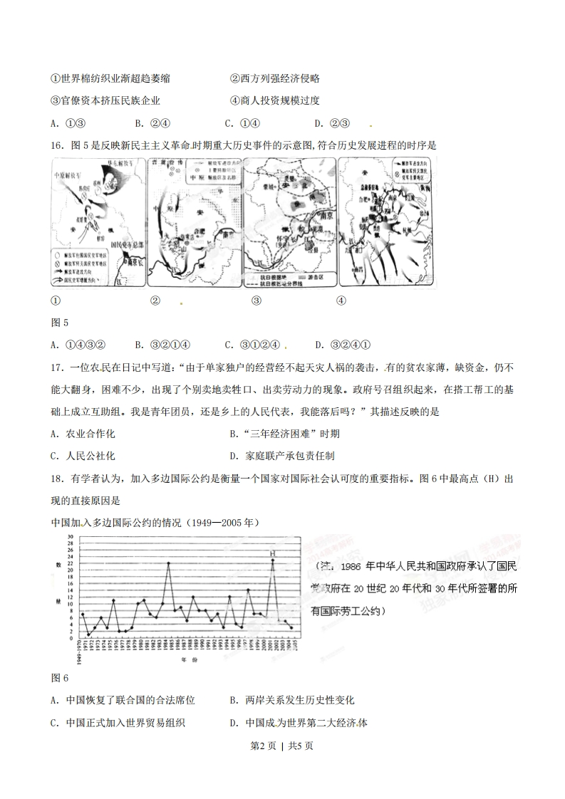 2014年普通高等学校招生全国统-考试(安敬卷)文科综合历史部分试题(原卷版)12.下列变法措施与结果对应,符合史实的是变法措施结果商鞅变法:户籍什伍制、连坐法、奖“行之十年,秦民大悦,道不拾遗,山无盗贼,家给人足。励耕织和奖励军功民勇于公战,怯于私斗,乡邑大治。”B王安石变法:市易法。“市易之起,自为细民久困,以抑兼并尔,于官何利焉。”C戊戌变法:设立农工商总局促进民族资本主义迅速发展明治维新:殖产兴业没有实现传统产业的现代化和工业化13.1912年4月22日《申报》刊载《西装叹》:“更有西装新少年,短衣窄袖娇自怜。足踏黄革履,鼻架金丝边。自诩开通世莫敌,爱皮西地口头禅。醉心争购舶来品,金钱浪掷轻利权。”这表明A.国人对西方文化认识过于肤浅B.着西装己成为当时普遍现象C.西方生活方式己成为都市主流D.大众传媒理性看待社会时尚14.博物、物理、化学等自然科学课程从清末开始列入中学课程。图4显示中学自然科学课程比重的演变情况。据此,下列表述正确的是自然科学课程比重趋势图2015总时数百分比10190219041909191119121922192919321936年份(注:1922年始专指高级中学自然科学课程)图4A.1902年自然科学课程的设置标志着中国教育近代化的启动B.1922年自然科学课程比重体现了“五四”时期科学思潮兴起C.1929一1936年自然科学课程比重表明国民政府重视科学教育D.自然科学课程比重的变化反映了清末民国时期轻视人文教育15.“吾国纱厂事业,自欧战起后,获利甚厚,国人鉴于利之所在,均争相投资,设厂增锭,大有风起云涌之概。迨欧战造终,本纱之输出杜绝,外纱复纷至沓来,遂致连年市价,一蹶不振。”据此判断,第一次世界大战后中国棉纺织业“一蹶不振”的原因有第1页|共5页