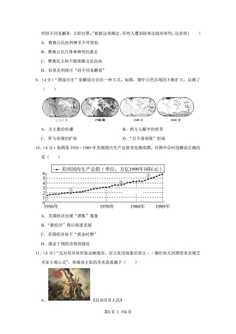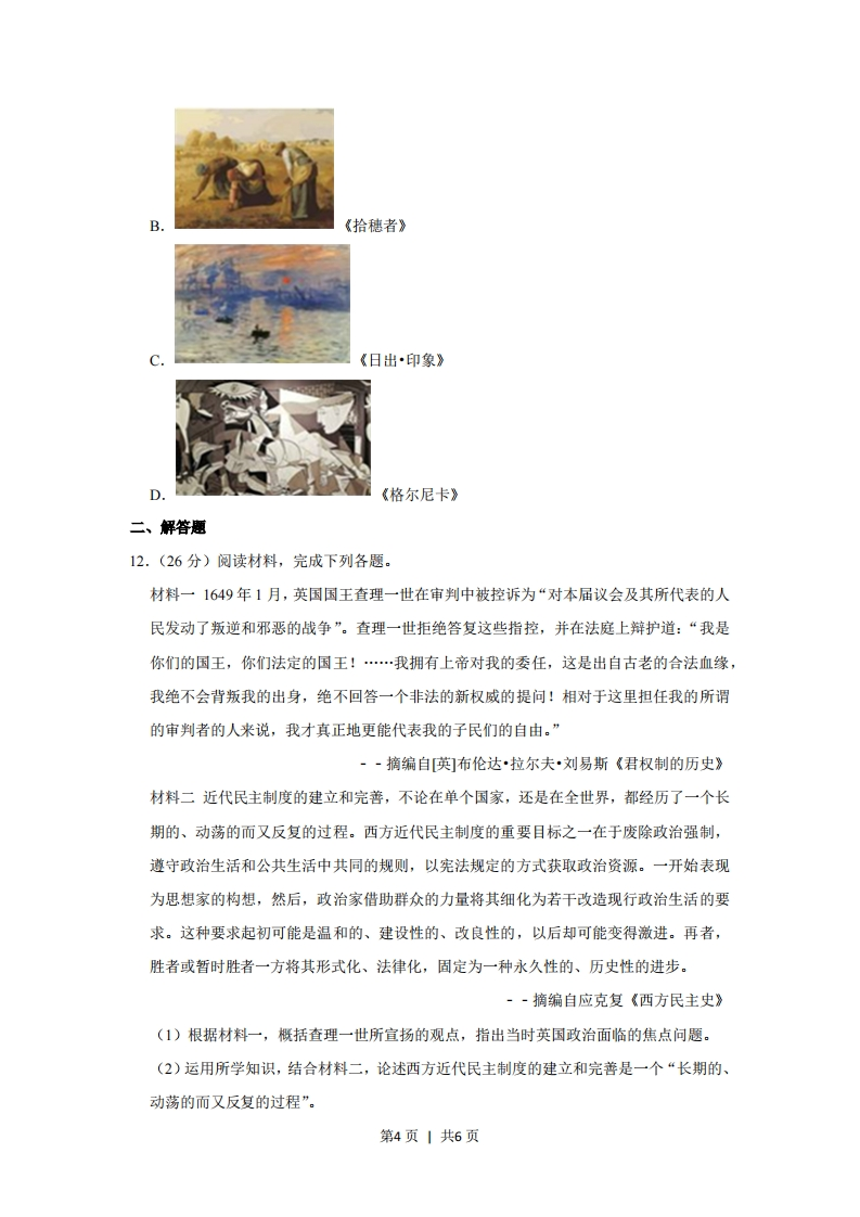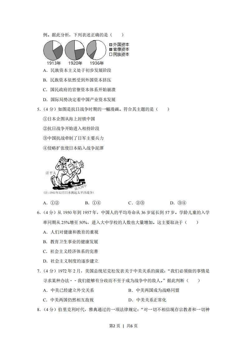 2013年安徽省高考历史试卷一、选择题1.(4分)如图是据有关资料绘制的汉唐间安徽境内水利兴修统计示意图。它反映了这一时期()15图110■次数0两汉三国两晋南北朝隋唐A.安徽农业生产总体呈上升趋势B.安徽农业生产规模与产值较高C.长江流域为农业生产重要区域D.我国经济重心己经完成南移2.(4分)梁启超在《戊戌政变记》中写到:“康有为以为望变法于朝廷,其事颇难。然各国之革政,未有不从国民而起者,故欲倡之于下,以唤起国民之议论,振奋国民之精神,使厚蓄其力,以待他日之用。”这说明()A.康、梁认为变法不能依靠朝廷B.戊戌变法没有借鉴外国经验C.梁启超意识到唤起国民的重要D.戊戌变法注重依靠民众力量3.(4分)同盟会成立初期,孙中山指出:“现代文明国家最难解决者,即为社会问题,实较种族政治两大问题同一重要。我国虽因工商业尚未发达,而社会纠纷不多,但为未雨绸缪计,不可不杜渐防微,以谋人民全体之福利。欲解决社会问题,则平均地权之方法,乃实行之第一步。”由此可见()A,中国工商业不发达难以实现民生主义B.民族民主革命比实现民生主义更重要C.民生主义的目标是为人民全体谋福利D.实现民生主义先要废除封建土地制度4.(4分)如图显示以下年份外国资本、官僚资本和民族资本在中国产业资本总额中所占比第1页1共6页