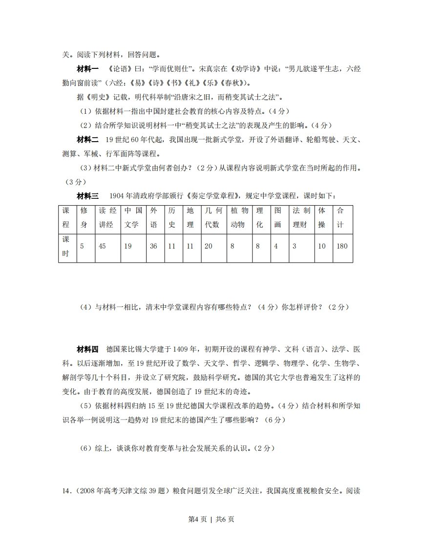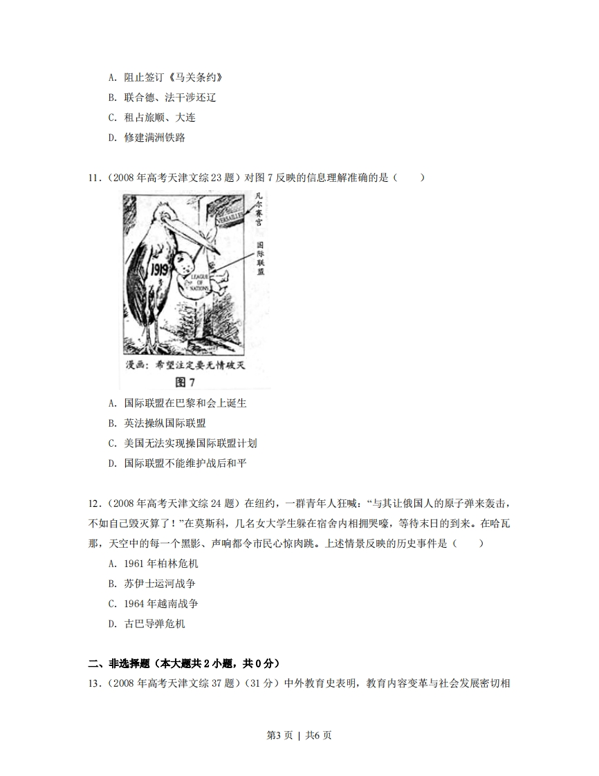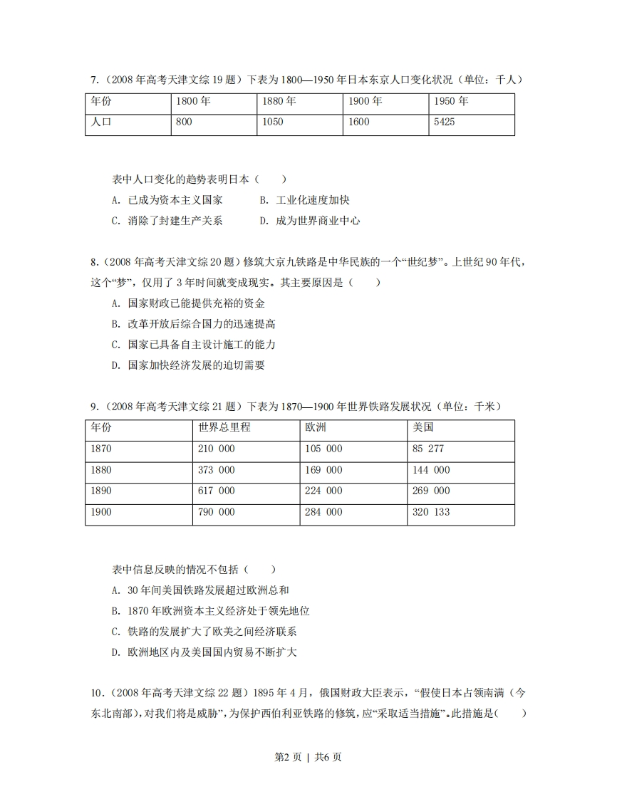2008年高考天津文综卷(历史部分)一、选释题(本大题共12小题,共0分)1.(2008年高考天津文综13题)我国古代中央机构不断变革,曾出现三公九卿、三省六部、内阁、军机处等制度。这些变革反映的趋势是不断强化()A.专制皇权B.中央集权C.检察权力D.对农民的控制2.(2008年高考天津文综14题)王安石变法解决“积贫的指导思想是,“因天下之力,以生天下之财,取天下之财,以供天下之费”。为此他制定的新法是()①清苗法②募役法③免役收庸法④方田均税法A.①②③B.②③④C.①③④D.①②④3.(2008年高考天津文综15题)抗战时期,中国共产党在根据地实行地主减租减息、农民交租交息的土地政策。这一政策的特点是()A.限制封建剥削B.解放广大农民C.保护封建剥削D.废除封建剥削4.(2008年高考天津文综16题)隋唐时期民族大融合导致了社会观念的诸多变化,在社会生活方面的表现是()①贵人御馔,尽供胡食②饮茶之风开始盛行③喜吃胡瓜、核桃、甘薯④妇女盛行穿男装A.①③B.②③C.①④D.②④5.(2008年高考天津文综17题)中国读书人历来“耻于言商,耻于言利”,而清末状元实业家”张謇却放弃仕途,投身于近代工商业。这里反映出的观念意识是()A.实业救国B.工商皆本C.重利轻义D.重商轻农【答案】A6.(2008年高考天津文综18题)1900年以后在天津老城南门外(南市一带)出现了租界与天津地方当局均不实施管理并一度畸形繁荣的地区,俗称“三不管”。这本质上反映出近代天津城市的()A.封建落后性B.治安管理的不合理性C.半殖民地半封建性D.建设的散乱随意性第1页1共6页