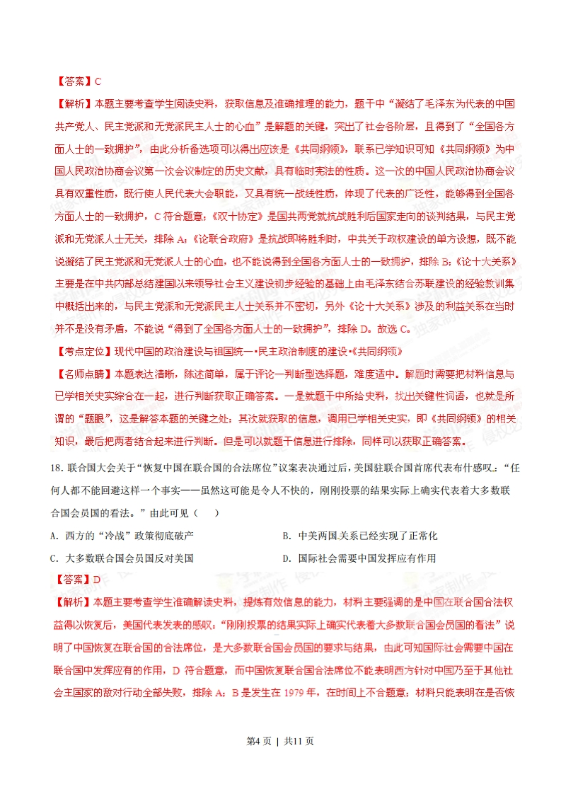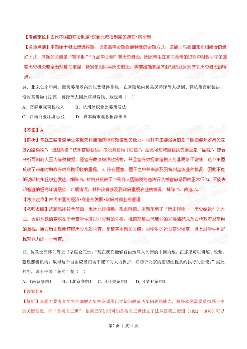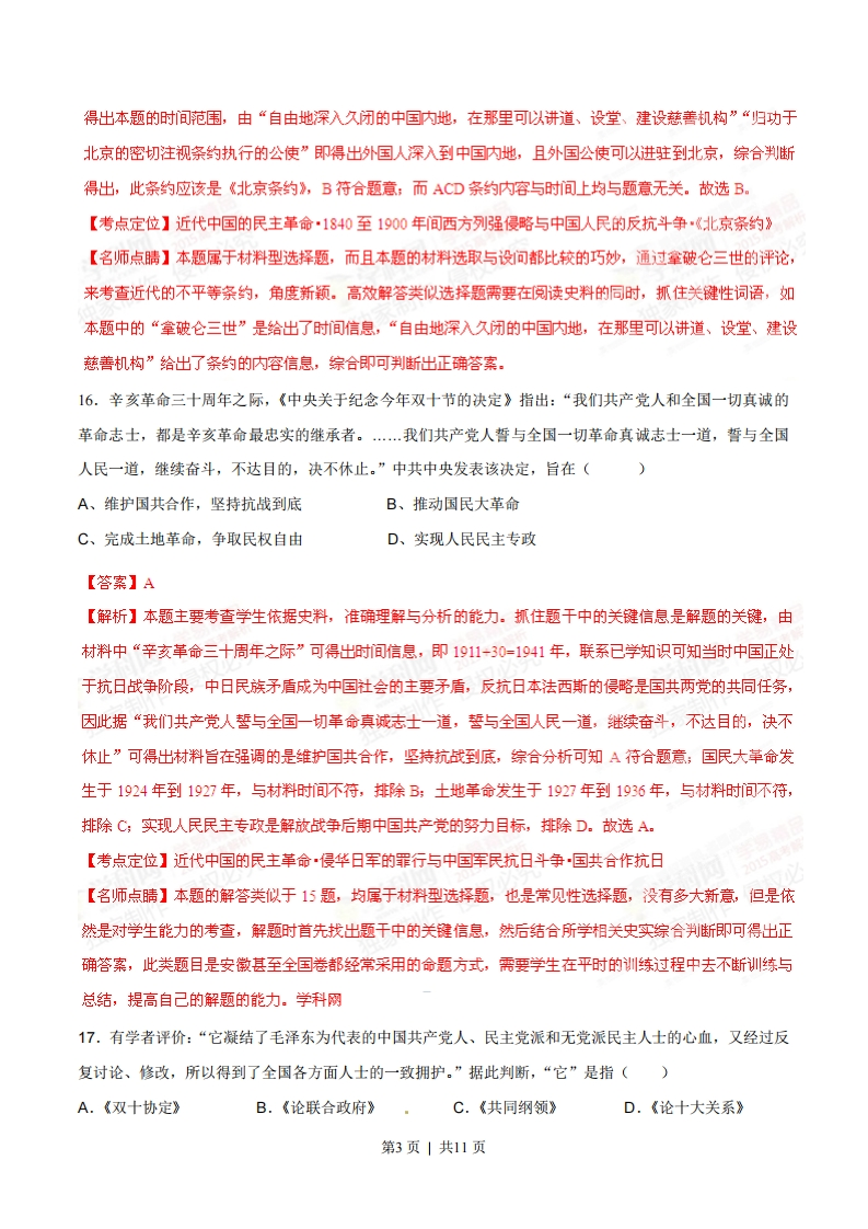 2015年安徽高考文综历史解析(精编版)一、选择题(本大题共11小题,每小题4分,共计44分)12.据《史记》载:一日,魏太子下车,向一位新贵一一宫廷文士田子方致意,竞未得到回礼。太子问:“究竞富贵者还是贫贱者应当骄傲?”田子方答:“贫贱者。”并解释,他随时都能在别国宫廷上被派上用场。这反映了()A.士人为诸侯国所重用B.士人轻视功名利禄C.诸侯国内部等级森严D.忠君思想己经形成【答案】A【解析】本题主要考查学生通过历史现象分析历史本质的能力,对材料现象的准确分析是解题的关键,由材料中的“魏太子下车”可以判断是战国时期,“向一位新贵一一宫廷文士田子方致意”“他随时都能在别国宫廷上被派上用场”等信息可以得出士阶层的不断煜起以及受到各诸侯国的重用,A符合题意;B在材料中无体现;“他随时都能够再别国宫廷上被派上用场”说明忠君思想并不浓厚,再加上魏太子致意竟不回礼等,排除C、D。故选A【考点定位】中国传统文化主流思想的演变·春秋战国时期的百家争鸣·背景一一士阶层的崛起【名师点睛】本题以情景史料的方式命题,角度比较新颖,突显了高考试题的人文化的特点,重在对学生能力的考查,有一定的难度。能够高效解答此类试题的关键是首先通过阅读史料,提炼出有效信息,然后结合已学知识综合判断即可。因此在备考复习过程中,需要考生加强在史料解读方面的训练,不断总结归纳,提升解题的能力。13.河南尹田歆的外甥王湛,以知人出名,田歆对他说:“如今应推举六名孝廉,多有贵戚书信相命,又不好违背,我想自己选一名名士以报效国家,你助我求之。”这体现了()A.地方无选举权B.选拔官吏以品评为主C.察举制的弊端D.自上而下的选官方式【答案】C【解析】本题主要考查学生阅读史料,提炼有效信息的能力,由“推举六名孝廉”可直接判断是汉朝推行的察举制,但材料中“多有贵戚书信相命,又不好违背”说明了察举制存在的一些弊端,即重门第,据此分析可知C符合题意;依据已学知识可知察举制是自下而上的地方举荐制度,排除A、D;B是九品中正制,不合题意,故选C。第1页|共11页
