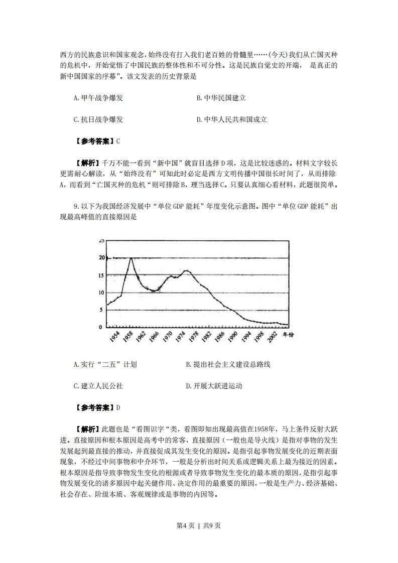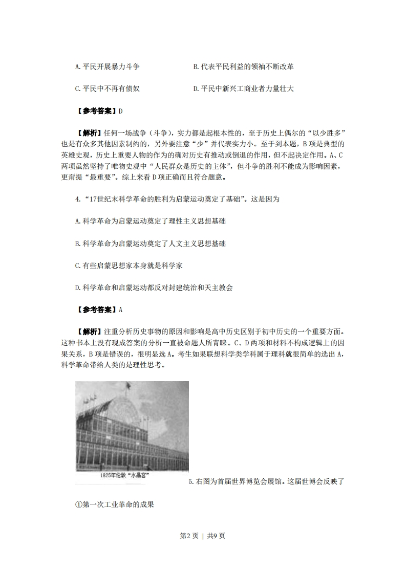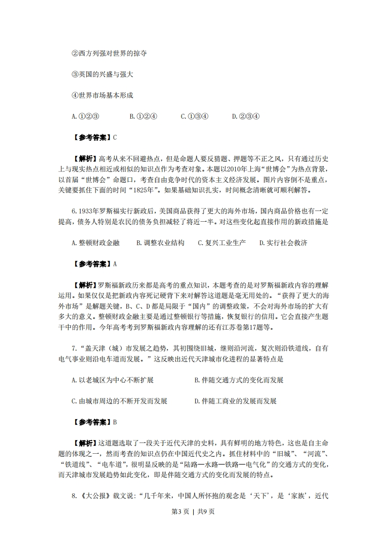 2010年高考(天津卷)历史试题解析第I卷(本卷共11题,每题4分,共44分。在每题列出的四个选项中,只有一项是最符合题目要求)1.图1到图2的变化,反映我国古代农业生产中图1图2A.铁力牛耕的出现B.耕犁技术的成熟C.精耕细作的开始D.单位亩产量提高【参考答案】B【解析】这道题放在高考历史第一题这个位置是很适合的,难度小给紧张高考气氛下的紧张考生吃了一颗“定心丸”,舒缓了一口气:原来高考题也不过如此。这是道老题目了,即使没有做过,这次也算是小学生“看图识字”了(而且图片出自课本,应该很熟悉)。由图片可知:耕田从蓄力到人力,从复杂到简单,反映的是我国古代耕犁技术走向成熟。A项是图一所反映的内容,却不能反映图一到图二这种变化:C项和D项虽然也是我国古代农业的变化,但是不能直接读图获得信息。2.《史记》载:汉武帝时,“公孙弘以《春秋》白衣为天子三公,封以平津侯。天下之学士靡然乡风矣”。该材料主要表明A.汉武帝广泛吸纳人才B.平民将相大量涌现C.儒学在民间开始兴起D.儒学地位显著提高【参考答案】D【解析】看到“汉武帝”,会马上反映到时间信息,看到“《春秋》”自然也能联想到汉武帝时“罢黜百家,独尊儒术”,儒学从此成为正统,地位空前提高。当然,这些都是课内所学知识,解题还是先要读懂材料的意思。从材料看,D项也是直接符合题意的。B项明显是西汉初年的现象,A、C都不能从材料中得出。3.古代雅典城邦平民能在反对贵族的斗争中取得胜利,最重要的社会因素是第1页|共9页