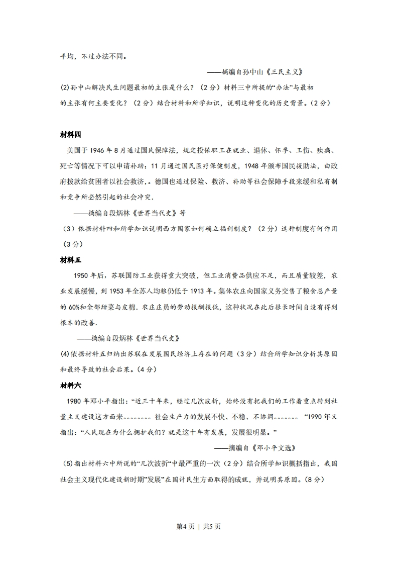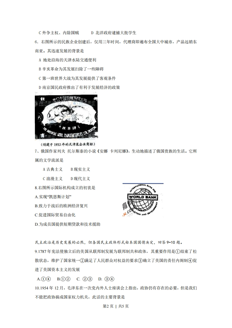 2009年普通高等学校招生全国统一考试(天津卷)文科综合历史部分第1卷1.下列史实符合西周确立的宗法制继承原则的是A.唐太宗通过玄武门之变继位B.宋太宗继承兄长宋太祖职位C.明太祖因太子亡制定嫡长孙继位D.清康熙帝死后皇四子继位2.对右图所示内容认识正确的是A.政府奖励垦荒地数量增加的状况B地主兼并农民土地的记录C农村土地专业化经营的情况D.国家确定土地所有权和征收赋税的依据3、希脯历史学家希罗多德说,克利斯提尼“领着人民参与政治”。克利斯提尼改革中符合这一评述的是①按财产多寡划分社会等级②用10个地域部落取代原来4个血缘部落③设立五百人会议④向公民发放“喜剧津贴”A①②B②③C③④D①④4、胡适评价19世纪末的梁启超为“革命第一大功臣,其功在革新吾国之思想界”。这主要是因为梁启超宣传了A民生科学,自由平等B民主共和,主权在民C托古改制,变革维新D开设议院,变法图存5、1919年5月5日,天津《大公报》刊登“北京特约通讯”,标题为《北京学界之大举动-一昨日之游街大会/曹汝霖宅之焚烧/青岛问题之力争/章宗祥大受夷伤》。从上述标题中能获得的信息是A京津两地工人罢工游行B学生爱国浪潮遍及全国第1页|共5页