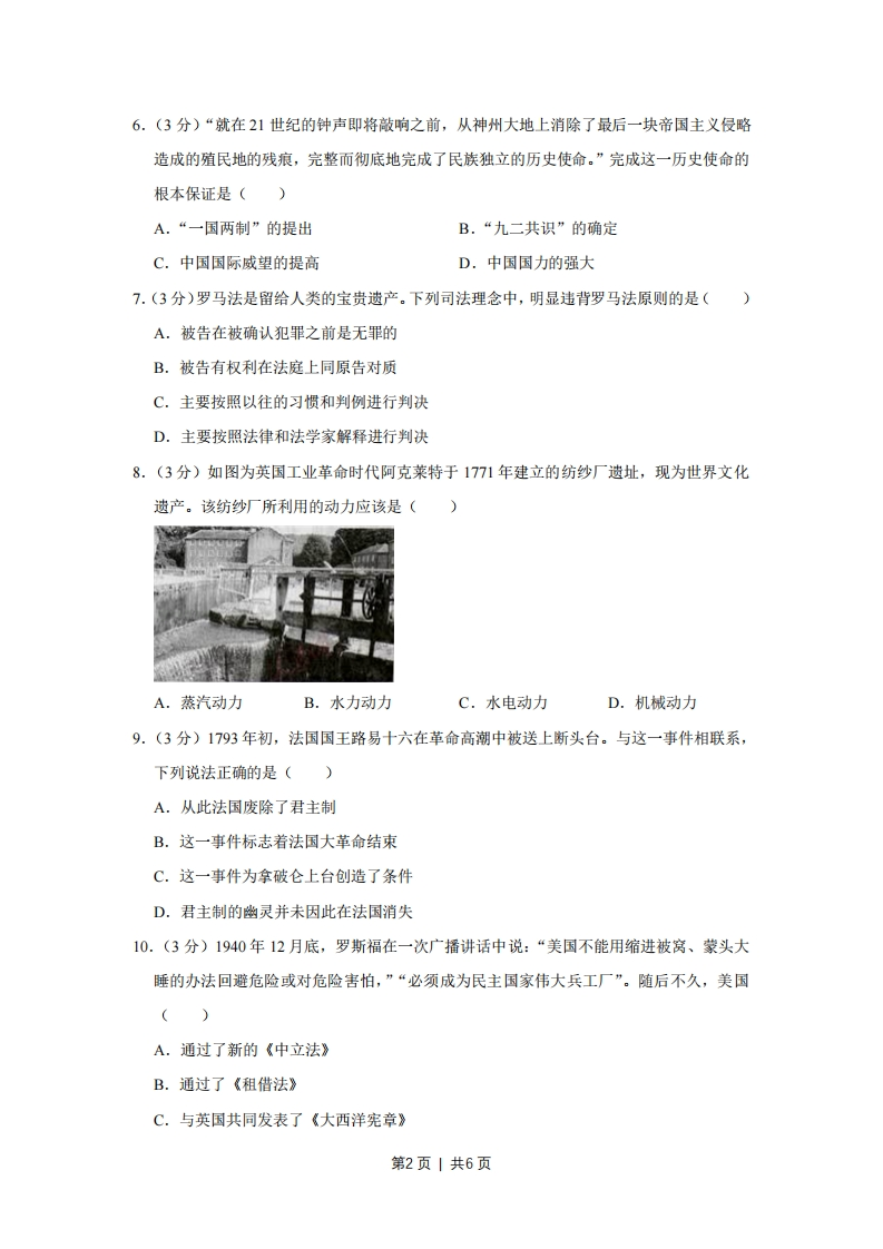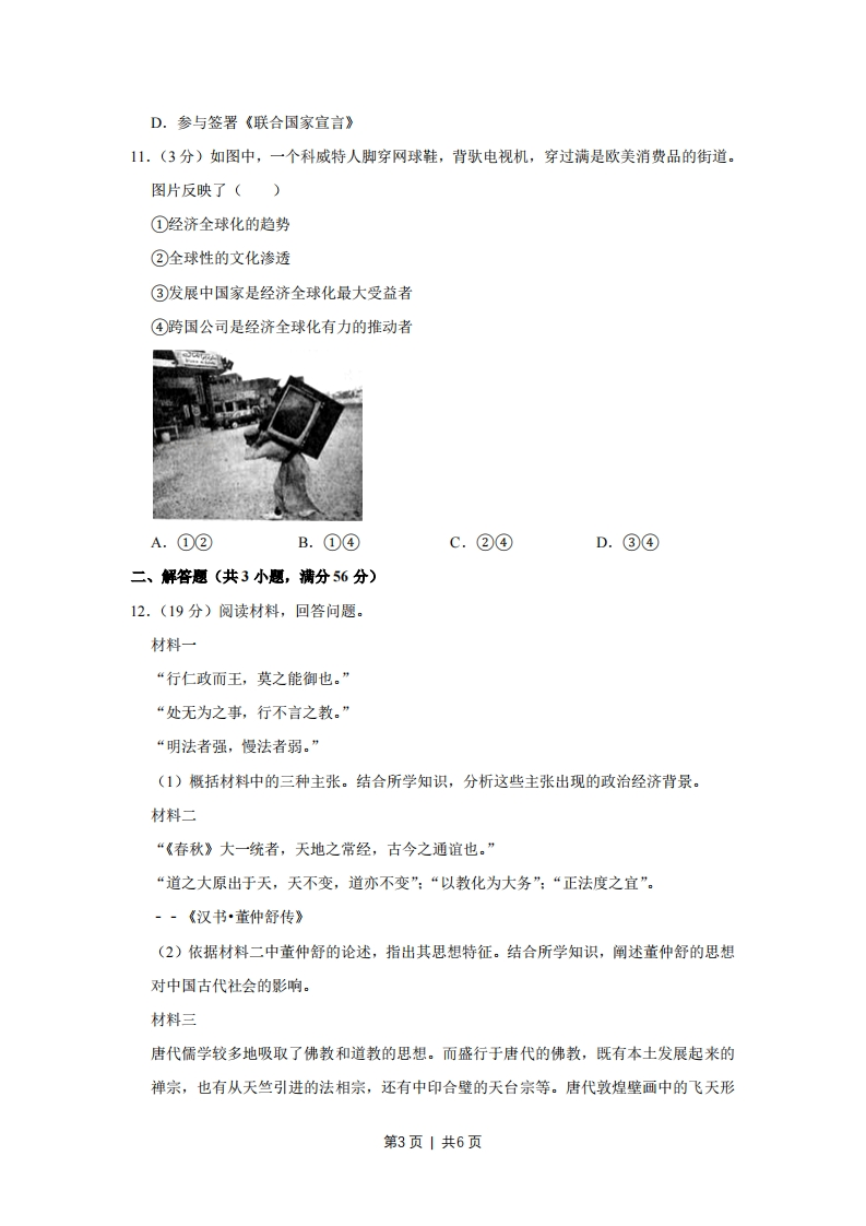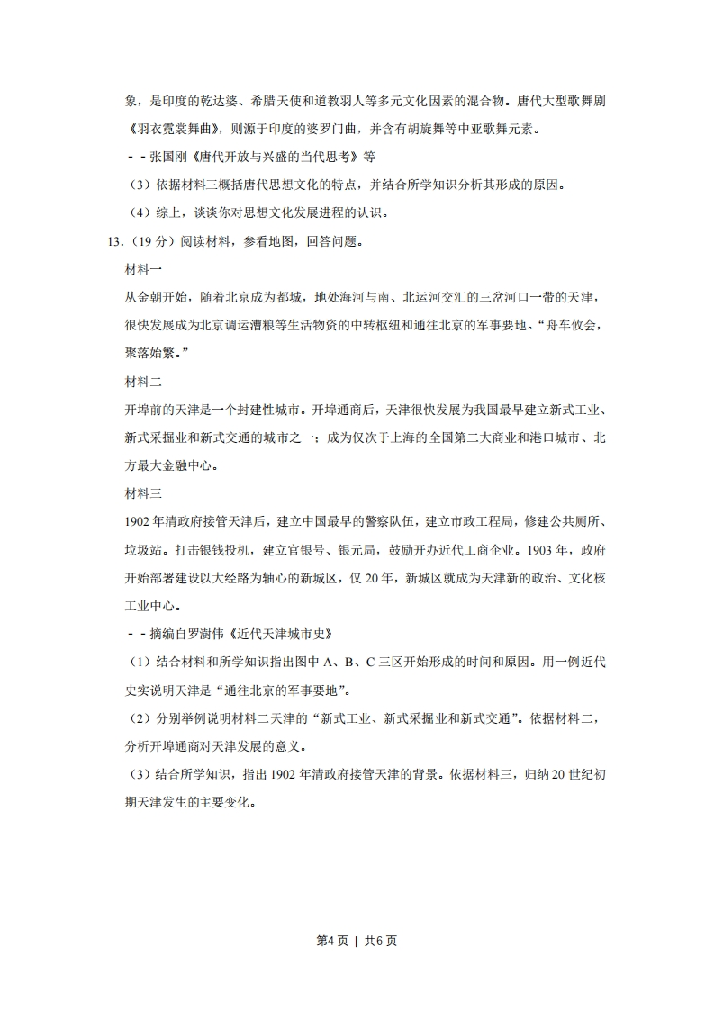 2012年天津市高考历史试卷一、选择题(共11小题,每小题3分,满分33分)1.(3分)马可·波罗在描述中国某港口时说:“亚历山大或他港运载胡椒一船赴诸基督教国,乃至此刺桐港者,则有船舶百余。”“刺桐”是指()A.泉州B.广州C.扬州D.庆元2.(3分)清雍正年间,军机处设在皇宫内,与皇帝日常生活办公地毗邻。军机大臣多从“亲臣重臣”中遴选,任命谕旨通常说,命某人“在军机大臣上行走”或“在军机大臣上学习行走”。材料中未能体现出()A.在军机处办理要务易于保密B.军机处官员便于皇帝宣召C.军机处官员按才德标准遴选D.军机大臣多为临时差遣性质3.(3分)戊戌变法期间,湖南《湘报》发表了《醒世歌》:“若把地球来参详,中国并不在中央,地球本来是浑圆物,谁是中央谁四旁。”这首诗歌所表达的主要思想是()A.提倡维新变法B.鼓励人们向西方学习C.宣传科学救国D.劝导国人放弃天朝观念4.(3分)如图介绍内容所反映的实质是(介绍信兹有本校胡世厚同志因返里事去河南洛阳,携带通用粮票20斤,希沿途军警查验放行是荷。此致敬礼(限2月5日作废)中共中央高级党校(印章)1963年1月10日A.国内粮食供应比较紧张B.中国实行计划经济体制C.国家实行粮食凭票供应D.国家工作人遵纪守法5.(3分)在中美关系的发展中,台湾问题是一大障碍,在扫除这一障碍的过程中,取得突破性进展的事件包括()①中国恢复联合国席位②尼克松总统访华③中美两国正式建交④邓小平访问美国。A.①②B.①③C.②③D.③④第1页|共6页
