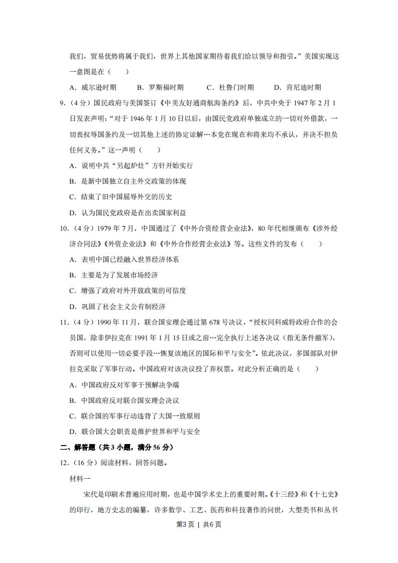 2016年天津市高考历史试卷一、选挥题(每题4分,共44分.在每题给出的四个选项中,只有一项是最符合题目要求的.)1.(4分)司马迁说:“居今之世,志古之道,所以自镜也,未必尽同。”下列选项中,与司马迁观点相符的是()A.历史可以重演,应当以史为鉴B.历史不会重演,不能以史为鉴C.一切历史都是当代史,无须学习古人D.历史事实情同而势异,不能照搬历史经验2.(4分)如图是北宋纸币铜版拓片,其上文字为:“除四川外,许于诸路州县公私从便…流转行使。”这一铜版()①证实了宋代纸币的发行②反映了宋代的印刷技术③是纸币交子的文物材料④是商品经济发展的见证②@网倒A.①②③B.①②④C.①③④D.②③④3.(4分)孟德斯鸠曾说:“意大利各民族成为罗马的公民以后,每一个城市便表现了它自己的特色…既然人们不过是由于一种特殊的法律上的规定才成为罗马公民的…因此人们就不再用和先前相同的眼光看待罗马…对罗马的依恋之情也不复存在了。”在孟德斯鸠看来,更多意大利人成为罗马公民()A.加剧了罗马社会矛盾B.扩大了罗马统治基础第1页1共6页