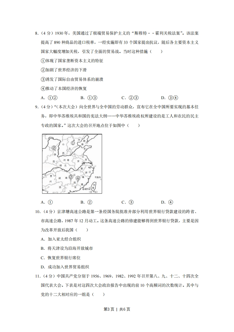 2018年天津市高考历史试卷一、选释题:本卷共11题,每题4分,共44分。在每题给出的四个选项中,只有一项是最符合题目要求的。1.(4分)朱熹在《四书章句集注》中说:“盖国以民为本,社稷亦为民而立,而君之尊又系于二者之存亡,故其轻重如此。”这一说法()A.强调了君主至尊的观念B.体现了儒家传统的民本思想C.呼应了“存天理,灭人欲”的主张D.推动了儒家思想的新发展2.(4分)元朝在地方实行行省制度。行省“掌国庶务,统郡县,镇边鄙…凡钱粮、兵甲、屯种、漕运、军国重事,无不领之”,但地方官吏的选用主要由中书省和吏部负责,调动行省所属军队须皇帝批准。这表明元朝()A.地方拥有适度权力B.地方缺乏实际权力C.行省权力集中专断D.君主专制得以加强3.(4分)16世纪,西班牙医生塞尔维特因解剖人体进行血液循环研究,被宗教裁判所火刑处死。而达尔文在19世纪中期相继发表《物种起源》《人类的由来》,虽遭教会激烈反对,但并未受到教会的人身迫害,其原因在于()A.进化论己被人们普遍接受B.教会失去原有权威C.进化论被证明是科学理论D.教会实行宽容政策4.(4分)1830年,剑桥大学数学教授查尔斯·巴比奇出版《论英国科学的衰退》一书,分析了欧洲各国的科学状况,指出英国的业余科研传统正在使英国丧失曾经拥有的优势。他呼吁英国人必须将科学作为一项事业来加以关注,科学家应受到良好的培养和教育,并成为一种职业。这反映出(A,欧洲其他国家科学水平超越英国B.英国丧失原有优势地位C.英国科学家普遍缺乏培养和教育D.工业革命的不断扩展第1页|共6页