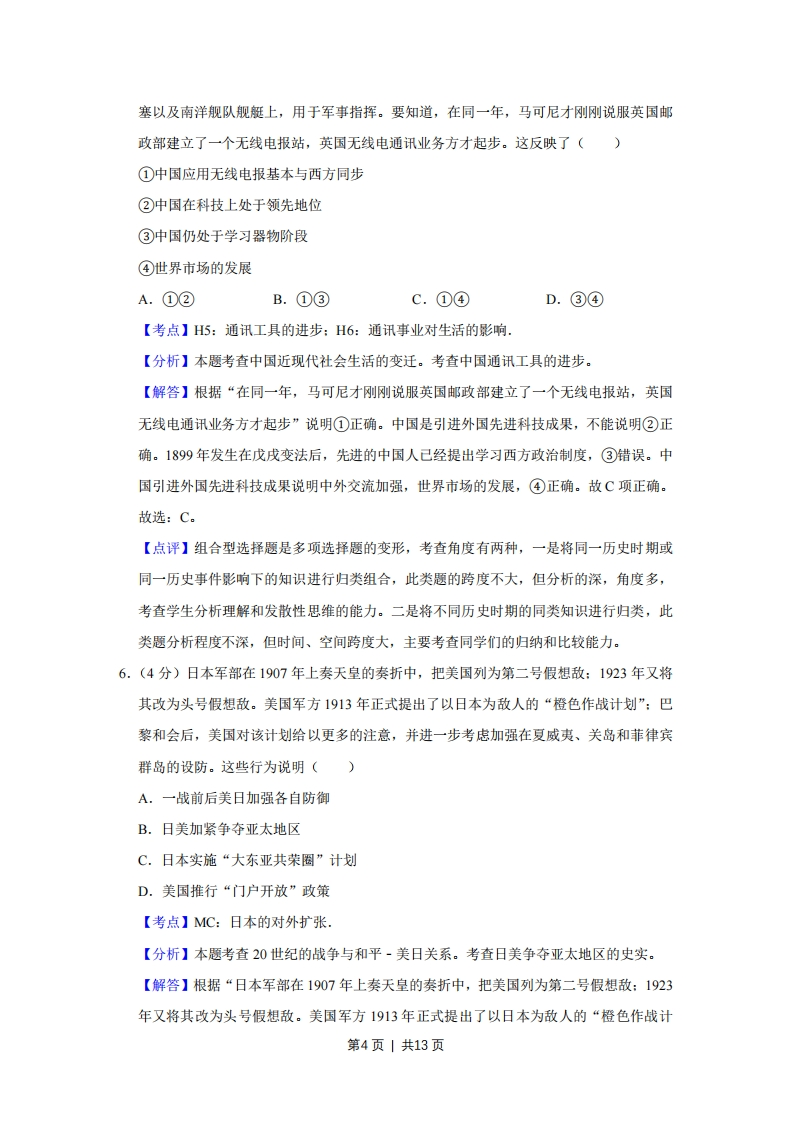 2016年天津市高考历史试卷解析版事考答案与试题佩折一、选释题(每题4分,共44分。在每题给出的四个选项中,只有一项是最符合愿目要求的.)1.(4分)司马迁说:“居今之世,志古之道,所以自镜也,未必尽同。”下列选项中,与司马迁观点相符的是()A.历史可以重演,应当以史为鉴B.历史不会重演,不能以史为鉴C.一切历史都是当代史,无须学习古人D.历史事实情同而势异,不能照搬历史经验【考点】ZA:历史文化常识【分析】本题考查司马迁和《史记》,要求了解司马迁的严谨的史实态度和观点。【解答】材料中司马迁的观点意思“生活在现代的人,应该记住以前的道理,用它来做借鉴,但不是要一定与古人一样”即借鉴历史,但不盲从古人的意思。故D项符合。ABC项与题干不符,且表述错误,故排除。故选:D。【点评】本题考查解读史料获取有效信息的能力,注意了解《史记》的史学观点和文学价值。2.(4分)如图是北宋纸币铜版拓片,其上文字为:“除四川外,许于诸路州县公私从便…流转行使。”这一铜版()①证实了宋代纸币的发行②反映了宋代的印刷技术③是纸币交子的文物材料④是商品经济发展的见证第1页1共13页