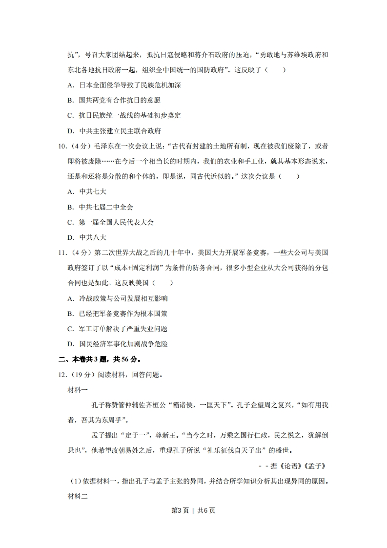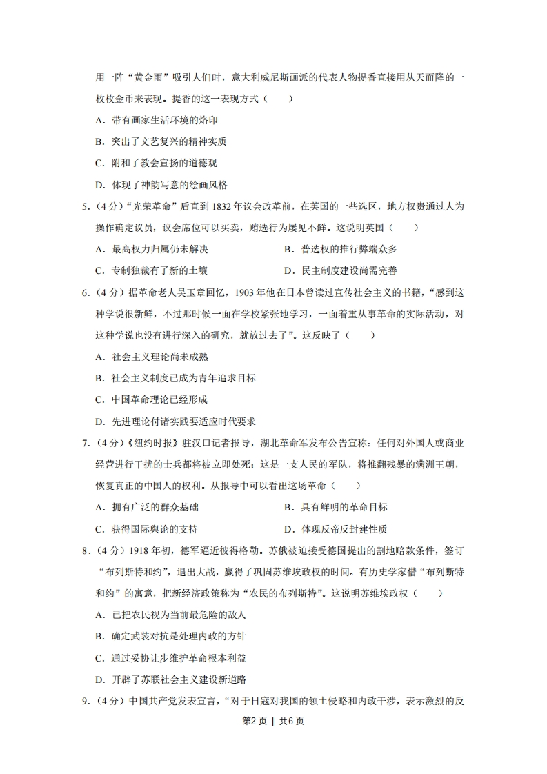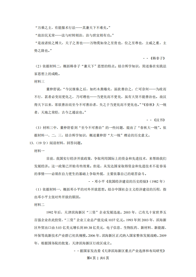 2019年天津市高考历史试卷一、本卷共11题,每题4分,共44分。在每题给出的四个选项中,只有一项是最符合题目要求的。1.(4分)中国很多地区出土了大量青铜器,它们包含着丰富的历史文化内容。图片中的两件青铜器出土于同一地点,该地点位于地图中()A.①B.②c.③D.④2.(4分)明朝嘉靖年间,山西武城县县令鉴于该县“集日寡而旷多”,每逢集日,便组织“歌舞剧戏之徒,各呈其技于要街”,结果“众且观且市,远近毕至,喧声沸腾…粟米丝麻布帛,禽而鸡鹜,兽而牛羊,食而鱼肉果菰,与夫南北水陆之产,可以供民生所需者,错然填街溢巷”。从史料可知,当时武城县()A.农村集市贸易从无到有B.文化与商业结合活跃经济C.居民日常文化活动丰富D.乡村城镇化发展比较迅速3.(4分)公元58年,驻守耶路撒冷的罗马军队指挥官下令对一名犹太人执行鞭刑。犹太人对指挥官说:“你难道可以合法地鞭打一位没有犯罪的罗马公民吗?”指挥官有些诧异:“我花了许多银子才获得了罗马公民身份。”对方说:“我生来就是。”这表明此时罗马公民()A.身份的获得有不同途径B.必须具有较强的经济实力C.来自共和国内各个地区D.拥有免受法律处罚的权利4.(4分)文艺复兴时期,很多画家以希腊神话中的情节为素材进行创作。在描绘天神宙斯第1页|共6页
