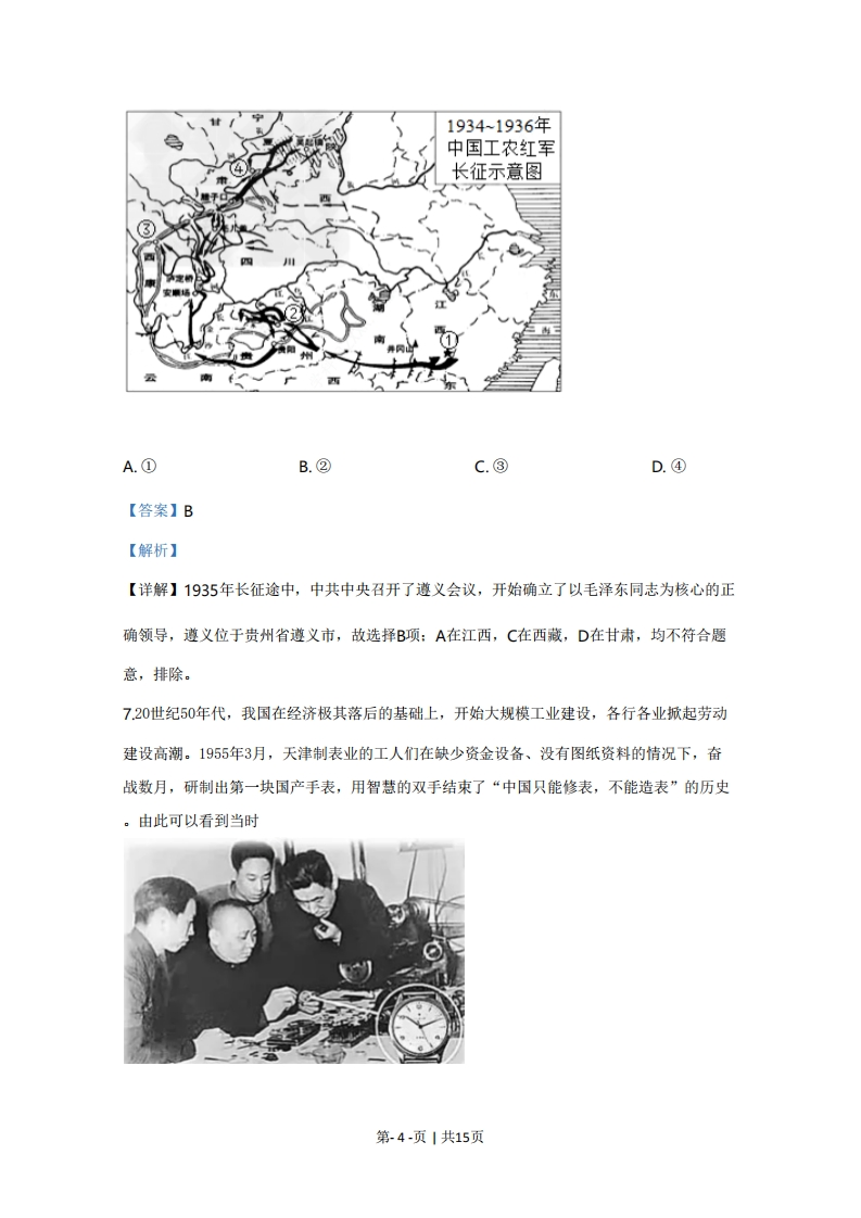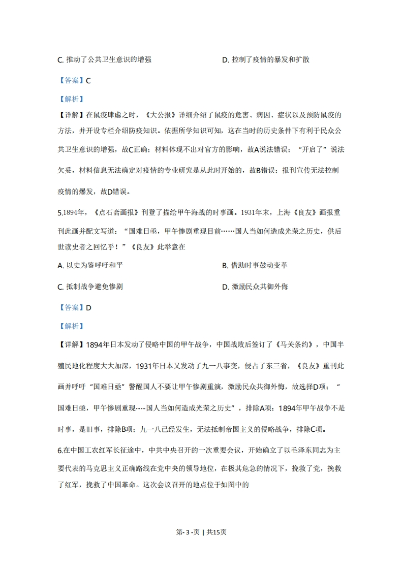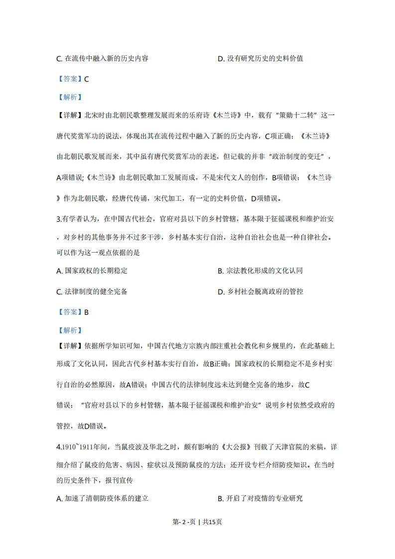 2020年天津市普通高中学业水平等级性考试历史本试卷分为第I卷(选择题)和第II卷(非选择题)两部分,共100分,考试用时60分钟。第I卷1至4页,第II卷5至7页。答卷前,考生务必将自己的姓名、考生号、考场号和座位号填写在答题卡上,并在规定位置粘贴考试用条形码。答卷时,考生务必将答案涂写在答题卡,答在试卷上的无效。考试结束后,将本卡一并交回。祝各位考生考试顺利1第I卷1.井田制下,村社内的土地分为公田和私田,私田是分给村社成员的份地,按制度定期交换,村社成员要随份地变动而迁居,即“三年一换土易居”。这意味着私田A.可以进行交易买卖B.收获全部上缴国家C.属于小农经济范畴D.所有权归国家所有【答案】D【解析】【详解】井田制下,村社成员要随着份地的定期交换而变动住所,“三年一换土易居”意味着村社成员只是份地(私田)的临时使用者,没有所有权,私田的所有权归国家所有,D项正确:井田制下无论公田、私田(土地)都不能买卖,A项错误;村社成员随着份田变动而更换居所,并不意味着要将全部收获物上缴国家,B项错误:村社成员耕种的份地并不固定,不是份地的主人,私田与传统的自耕农经济不同,不属于小农经济范畴,C项错误。2北朝民歌《木兰诗》在北宋时被收入《乐府诗集》。诗中描写木兰“归来见天子,天子坐明堂。策勋十二转,赏赐百千强”,其中“策勋十二转”是唐代对军功的奖赏。由此能够确定《木兰诗》A.记载了古代政治制度的变迁B.属于宋代文人创作的诗歌第-1-页1共15页