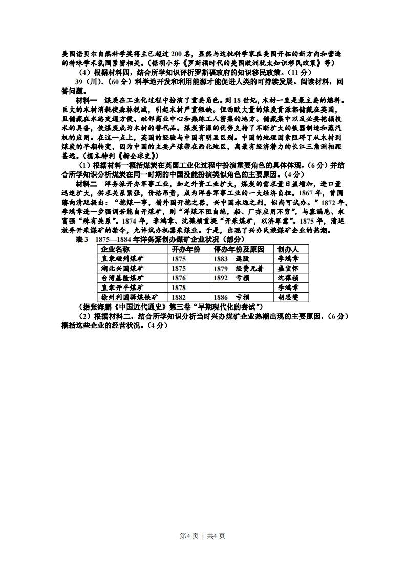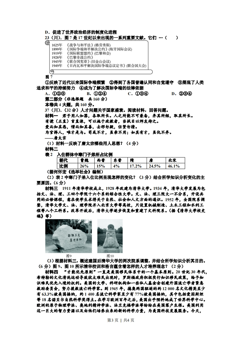 2011年四川高考文综试题(历史部分)第一部分(选择题共140分)本卷共35小题,每小题4分,共140分。在每小题给出的四个选项中,只有一项是最符合题目要求的。12(川).下列水利工程中,把中原腹地与中国最南方连接起来的是()流关水利工程水利工程B阳通济成阳江都似沟江余杭#水利工程口水利工程13(川)。清代史学家赵真据西汉初“其君既起自布衣,其臣亦自多亡命无赖之徒”的现象,认为“秦、汉间为天地一大变局”。下列主张体现了这种“大变局”的是()A.废除苛政,休养生息B.罢地百家,独儒术C。王侯将相,宁有种乎D。以法为教,以吏为师14(川).白银成为主要流通货币是我国古代经济史上的重大变化。下列赋役制度适应了这一变化的是()A,相地而衰征B.租庸调制C.方田均税法D.一条鞭法15(川).史学家麦迪森《世界经济千年史》统计,1820年中国国内生产总值(GDP)占世界经济总量的32.9%,西欧各国的总和占23.6%,美国和日本分别占1.8%和3%。上述统计表明当时的中国()A,仍是世界经济文化中心B,是世界上最先进的国家C.资本主义经济发展迅速D.经济总量远超欧美各国16(川).1898年8月,清廷颁布上谕:“现当海禁洞开,强邻环同,欲图商务流通,隐杜觊觎,惟有广开口岸之一法。”清廷的意图不包括()A,收回通商口岸B。发展民族经济C,维护国家主权D,挽救国家危亡17(川).图5是一幅驳斥清末“民智未开”观点的漫画。它试图传达的观念是()第1页|共4页