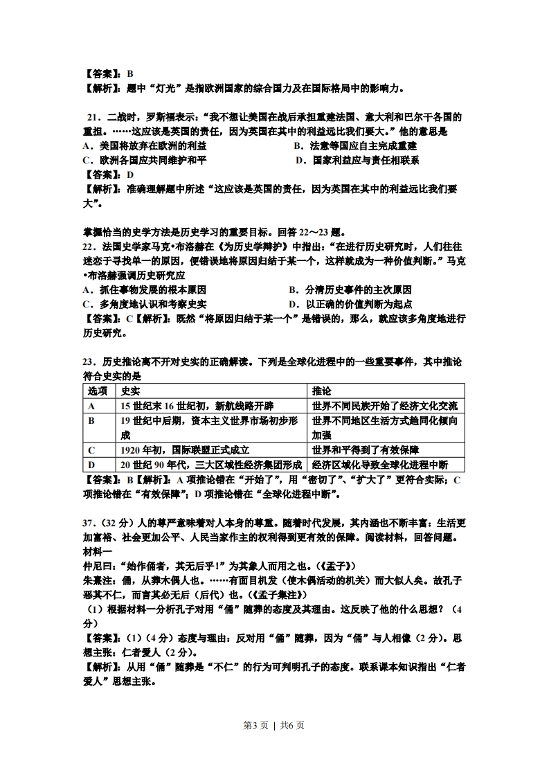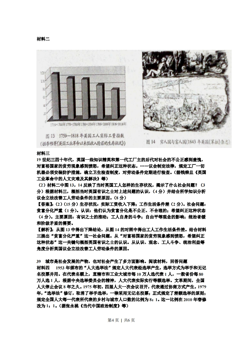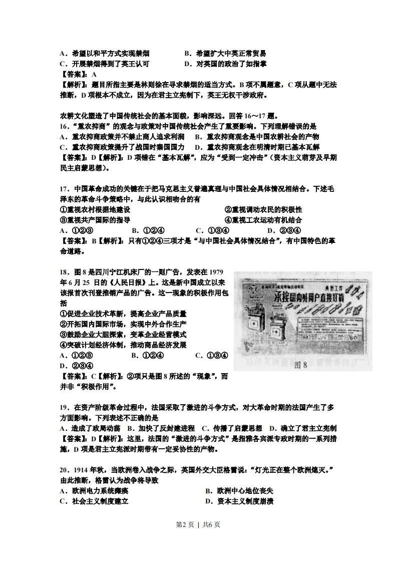 2010年四川高考文综试题(历史部分)12,丝绸之路是汉代中外交流的见证。图7中①所示中国通往南亚、中亚的交通要冲是大月氏身潘然锡之路图7A.葱岭B.玉门关C.大宛D.安息【答案:A【解析】:从于阗往西出国境应是“葱岭”,而玉门关在阳关以北,C、D两项在国外。13.隋唐时,中印交流促进了双方文化的发展。下列人物中为此做出了重大贡献的是A.甘英B.玄奘C.一行D.鉴真【客案:B【解析】:甘使出使大素(东罗马):一行主要贡献是天文历法,鉴真东波日本。14.历史学家陈真恪指出:“华夏民族之文化,历数千载之演进,造极于赵宋之世。”下列史实可以佐证这一观点的是①完普科举程序②创立行省制度⑧强化文化政治④世俗文学兴起A.①②8B.①②④C.①⑧④D.②8④【答案C【解析】本题关键词是“数千载发展,在宋元到达一个新高度”,只有②项是元胡的创新,不合题意。科举制从俯朝产生,到宋朝在程序上分乡试、省试、殿试三级,并实行糊名法防舞弊。“文化政治”是指儒家思想作统治思想及“文人治国”,从西汉武帝以来就有这种趋势。世俗文学是指从从唐代传奇到宋元话本、宋词等。15。鸦片战争前夕,林则徐致信英国女王,表示相信英国政府是受到英驻华商务监督义律的欺骗而走上歧途,恳请她制止鸦片贸易。这表明林则徐第1页|共6页