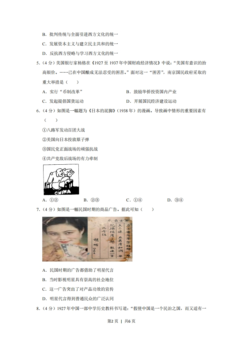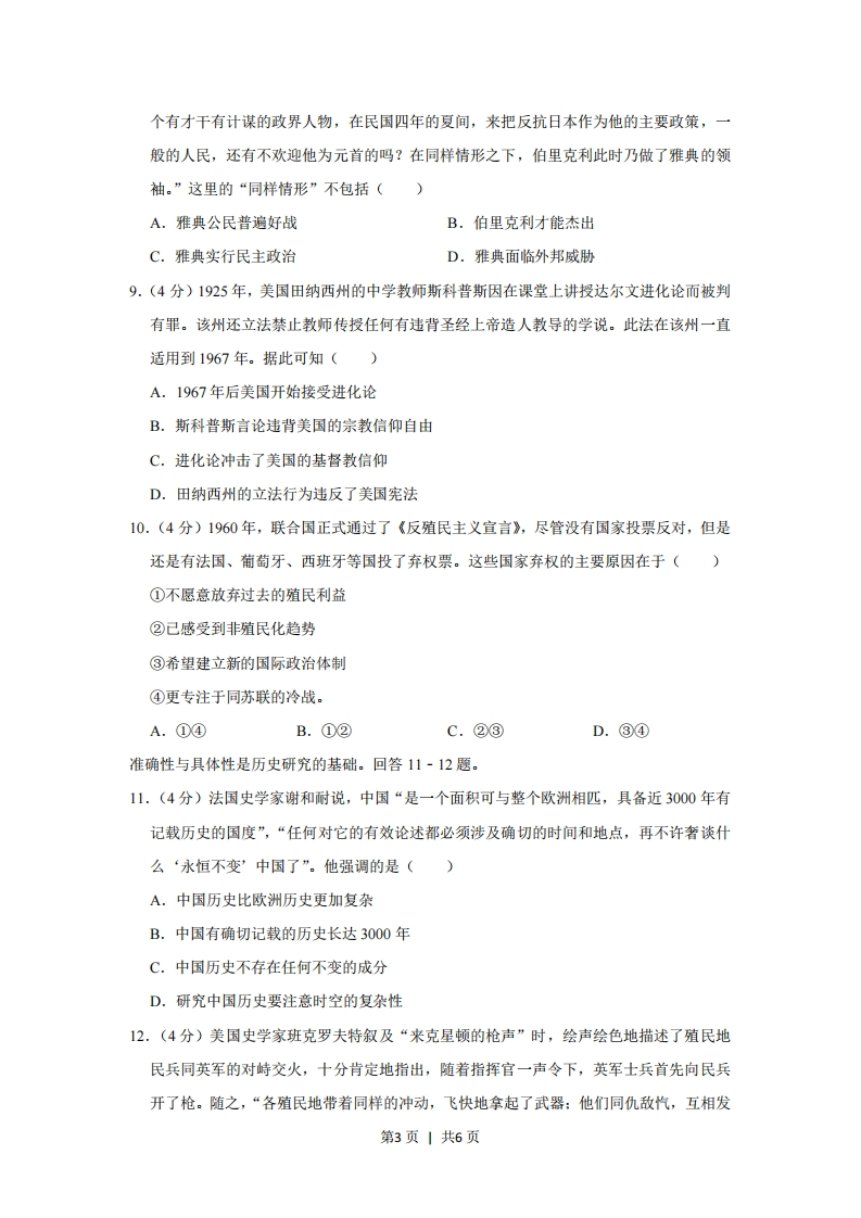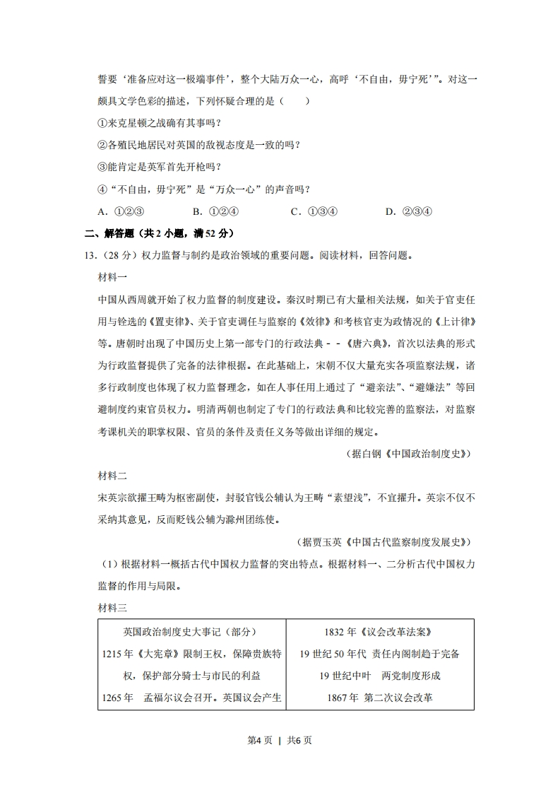 2013年四川省高考历史试卷一、选择思1.(4分)书法以自由多样的线条艺术表现情感和意境。下列作品把书法的写意性发挥到极致的是(格永和北年君流辅盖妥灤基跃世专角二节州于超且教A.B识修季已得坐符个将天:不空所。含有静浮C.D.2.(4分)纺织业在商代经济中占有重要地位,下列选项中可以支持这一判断的是()A.马王堆出土的素纱禅衣B.纺织家黄道婆创立的新式纺车C.甲骨文中关于祭祀蚕神的内容D.《说文解字》中有关纺织产品的字3.(4分)如表是1620年和1850年江南八府州城乡人口统计。据此判断,这一时段该地区年代城镇人口(万人)农村人口(万人)1620300170018507202880A.基本实现了城市化B.城市经济规模扩大C.农业经济日益调敝D.人口增速全国领先4.(4分)史学家陈旭麓指出,19世纪40年代、60年代和90年代是中国社会从古代到近代变革过程中前后相接的三个历史环节。贯穿这三个历史环节的主题是()A.反抗封建专制与建立君主立宪的统一第1页1共6页