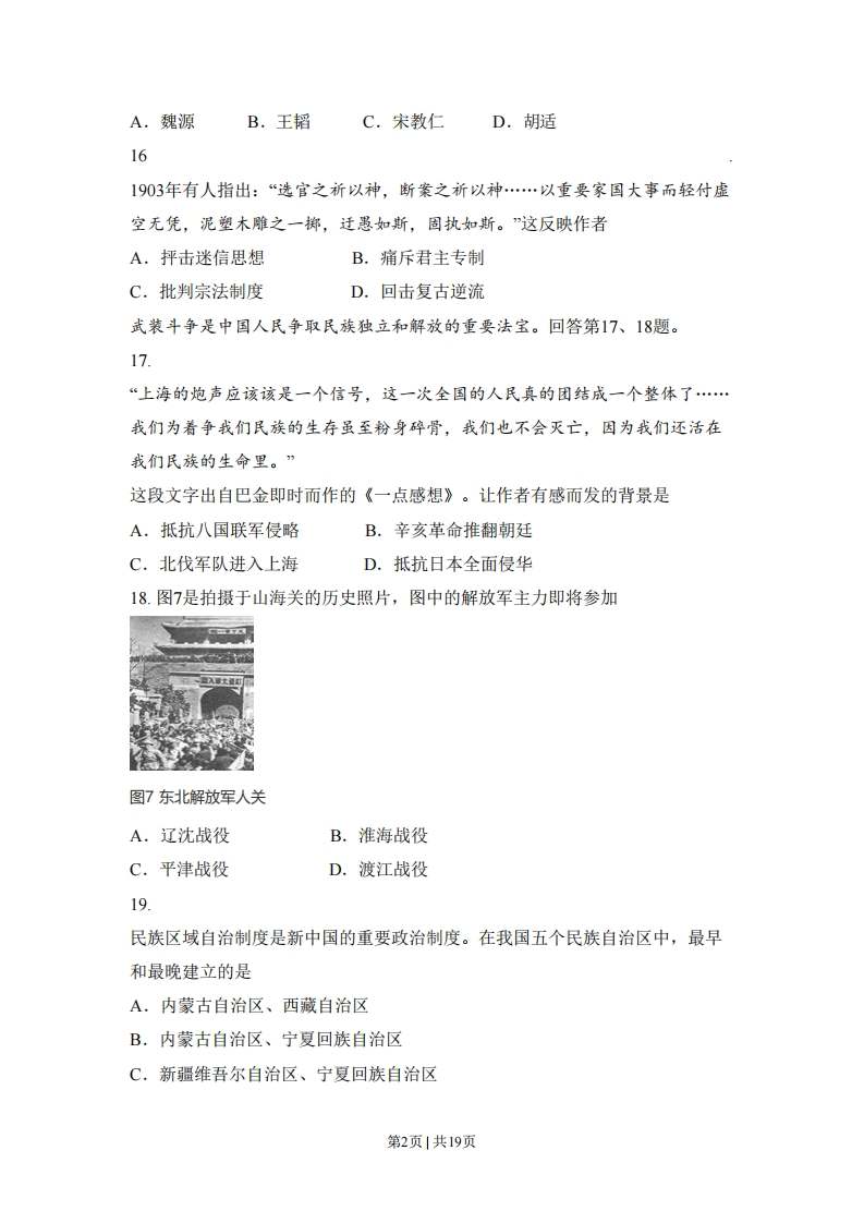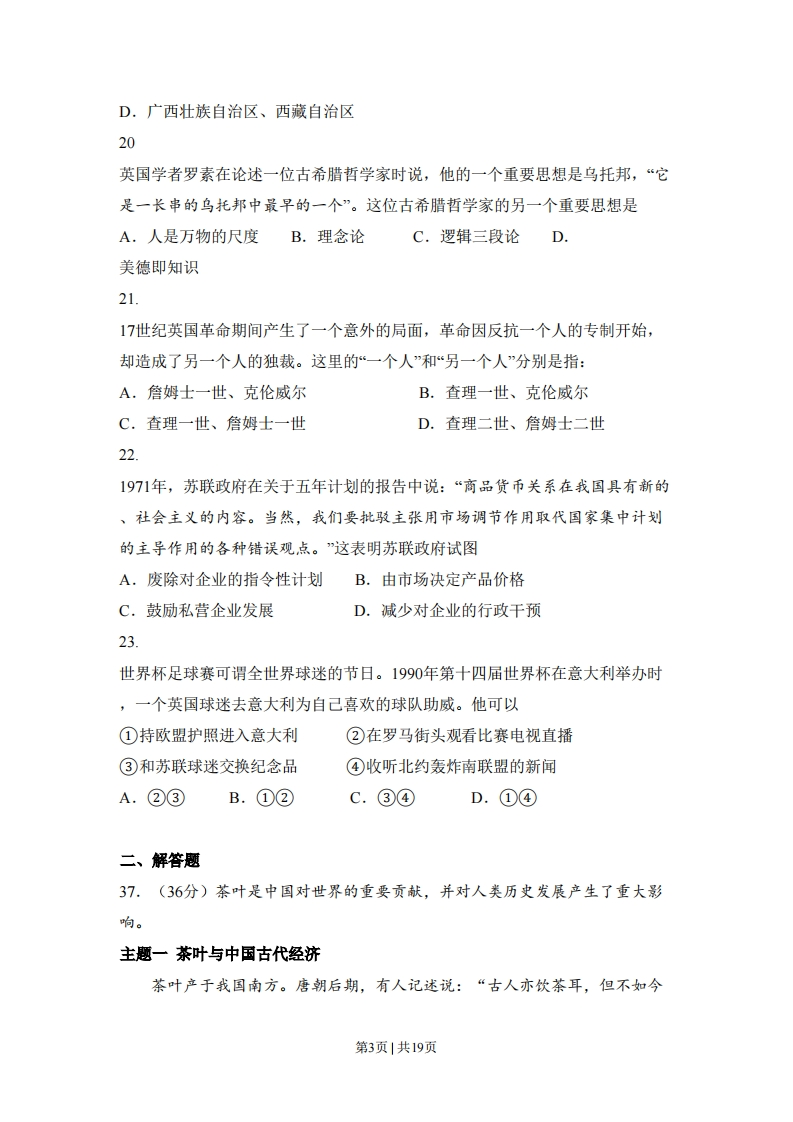 2010年北京市高考历史试卷一、选择题专制集权的不断加强是中国古代政治制度的一大特征。回答第12、13题。12.图6是一副古代北京地区的政区示意图。图中反映的地方行政制度实行于:今之京行校风代图6A.西周B.秦朝C.汉朝D.唐朝13.有人认为,中国古代君主专制理论由先秦法家奠定,经汉朝儒生发展而成。这两个阶段的代表人物分别是A.荀子、董仲舒B.荀子、孟子C.商鞅、孟子D.韩非子、董仲舒14.元代《富春山居图》残卷分藏于海峡两岸。2010年初,两岸均有意联合展出该作品。下列作品与《富春山居图》同属于一个朝代的是A.顾恺之《洛神赋图》B.吴道子《送子天王图》C.王祯《农书》D.李贽《焚书》15“君为主,则必尧舜之君在上,而后可久安长治:民为主,则法制多纷更,心志难专一。究其极,不为流弊。惟君民共治,上下相通,民隐得以上达,君惠亦得以下逮”。根据材料和所学,判断这段文字的作者是第1页1共19页
