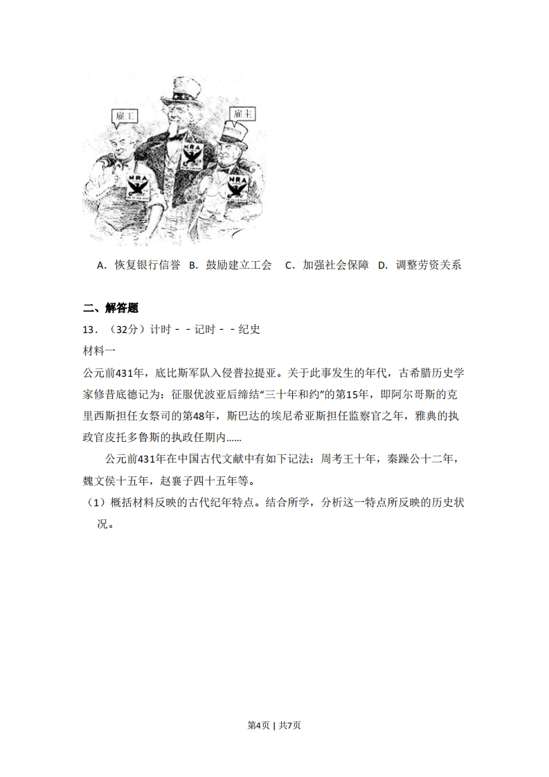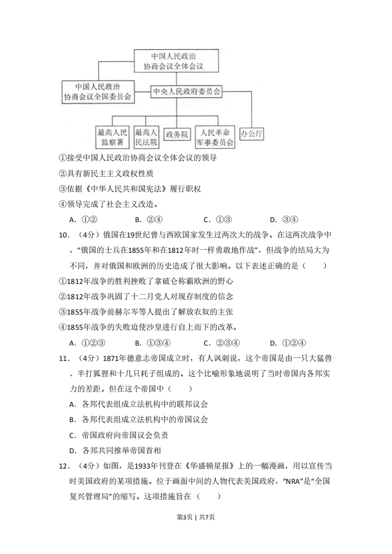 2013年北京市高考历史试卷一、选择题1.(4分)四川省博物馆藏有一块文字残缺的《九域守令图》石碑,其中一段碑文是:“至于国,天下分而为七。口并四海,变易古制,始为口县,更口、口分裂,至口灭陈,天下方合为一。”“口处缺失的文字应该是()A.周B.秦C.汉D.唐2.(4分)如图,判断下列各项表述正确的是()】洛中国古代都分都城示意图A.汉武帝在②颁布推恩令B.北魏孝文帝从③迁都到②C.②和④先后是两宋的都城D.明太祖在①废除了丞相制度3.(4分)1985年,一艘荷兰东印度公司的沉船被发现,船上载有景德镇生产的青花瓷。该船沉没的时间最早应为()A.北宋中期B.元末明初C.明末清初D.鸦片战争时期4.(4分)秦汉以来儒家思想不断发展。下列属于吸收外来文化因素、阐释儒家思想的著作是()①《春秋繁露》②《四书章句集注》③《儒林外史》④《孔子改制考》A.①②B.②④c.①③D.③④5.(4分)下列各项史实与结论之间逻辑关系正确的是()史实结论A宋代发明了活字印刷术宋代以后雕版印制技术基本不第1页1共7页