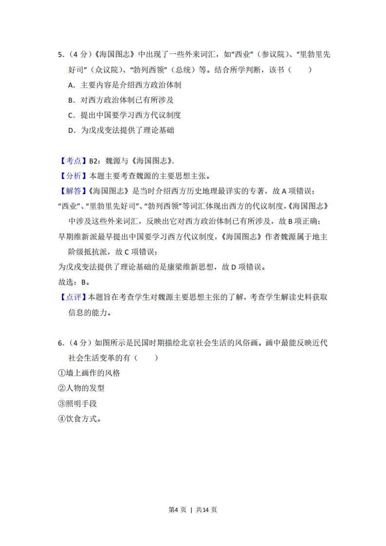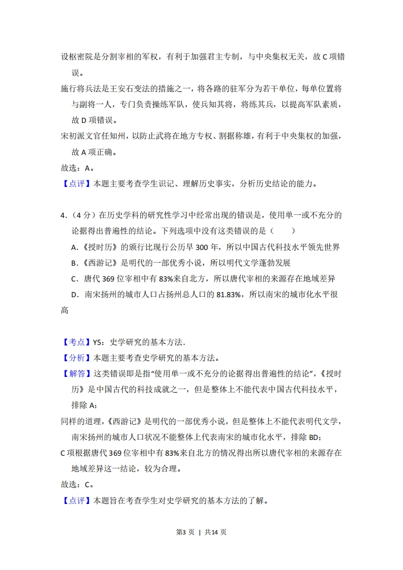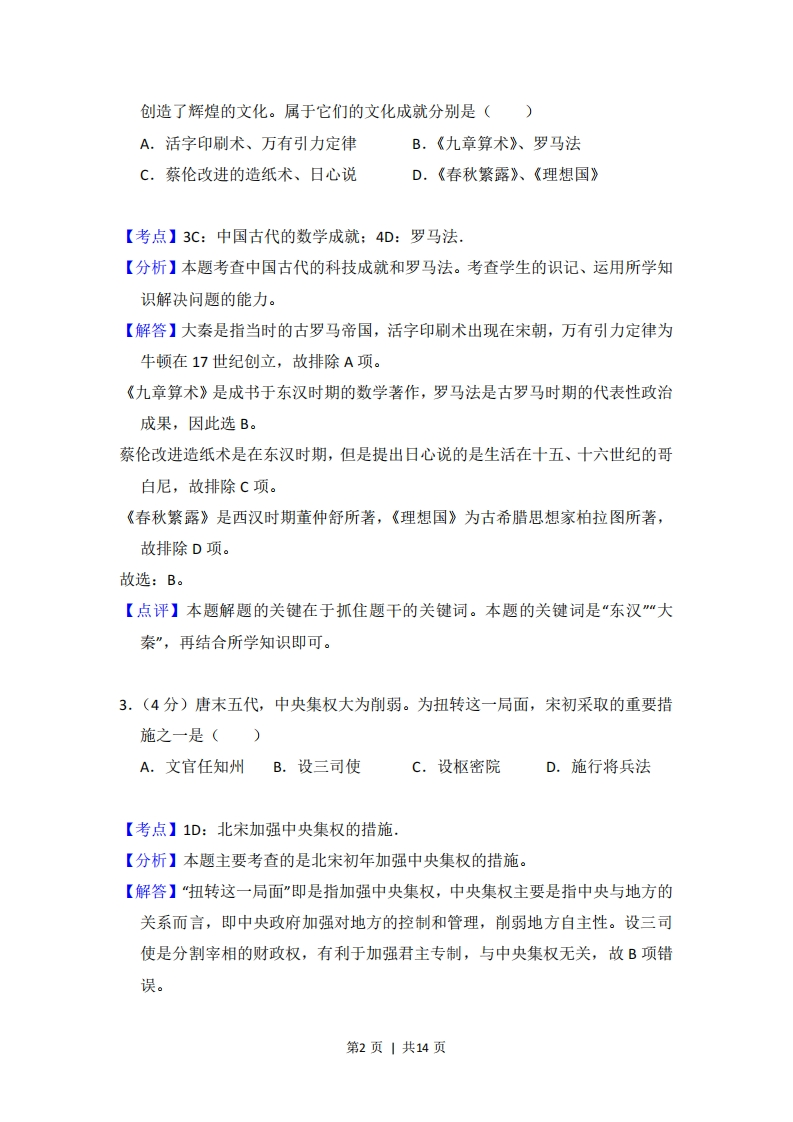 2014年北京市高考历史试卷事考答案与试题佩析一、选择题(共12小题,每小题4分,满分48分)1.(4分)读图,根据所学判断,在地区④产生的代表性著作是()A.《春秋》B.《孟子》C.《荀子》D.《离骚》【考点】3L:《诗经》和楚辞.【分析】考查百家争鸣中儒家代表作以及先秦时期的文学成就。考查楚辞的相关知识,学生读图获取历史信息的能力。【解答】根据图片信息可知地区④是指战国时期的楚国地区,①是指燕国地区,②是指齐国地区,③是指秦国地区,《春秋》为春秋时期鲁国孔子所著,《孟子》为战国时期鲁国孟子所著,《荀子》为战国时期赵国荀子所著,《离骚》为战国时期楚国屈原所著,因此选D。故选:D。【点评】以文学作品为切入点,同时考查学生对地图的空间观念的掌握。学习过程中对课本涉及到的地图表格等非文字材料,一定格外注意。2.(4分)公元97年,东汉的班超曾派人出使欧洲强国“大秦”。东汉和“大秦”都第1页|共14页