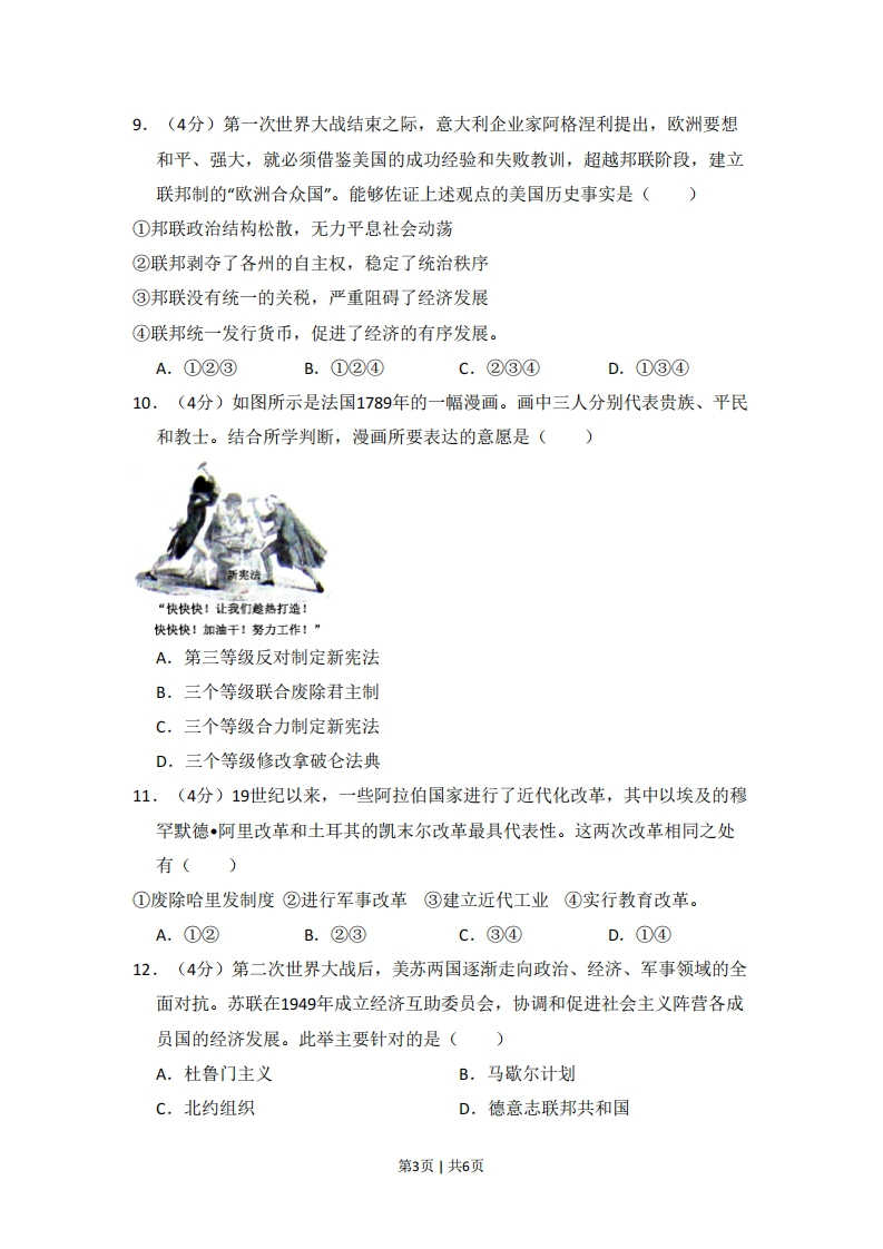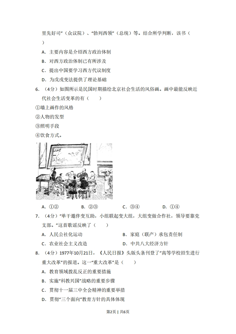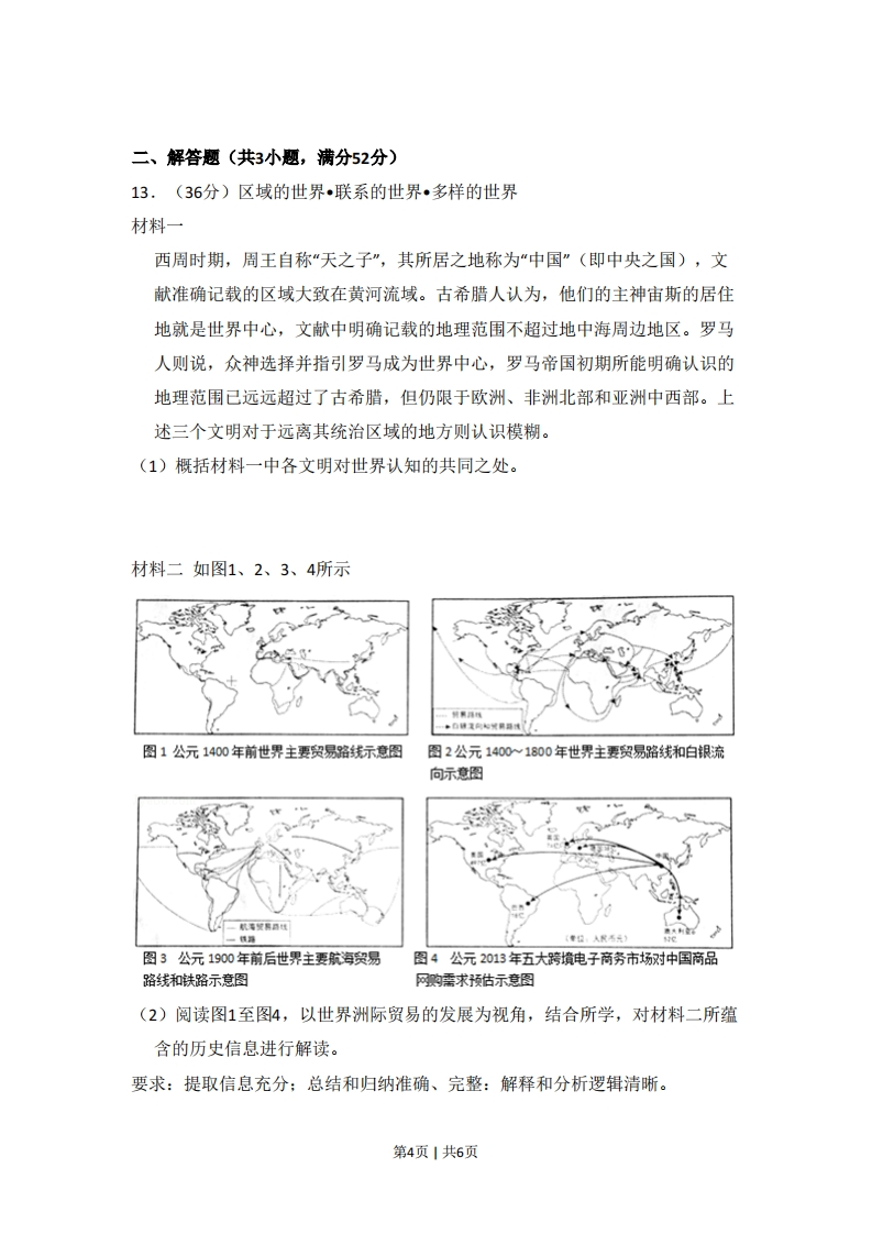 2014年北京市高考历史试卷一、选择题(共12小题,每小题4分,满分48分)1.(4分)读图,根据所学判断,在地区④产生的代表性著作是()A.《春秋》B.《孟子》C.《荀子》D.《离骚》2.(4分)公元97年,东汉的班超曾派人出使欧洲强国“大秦”。东汉和“大秦”都创造了辉煌的文化。属于它们的文化成就分别是()A.活字印刷术、万有引力定律B.《九章算术》、罗马法C.蔡伦改进的造纸术、日心说D.《春秋繁露》、《理想国》3.(4分)唐末五代,中央集权大为削弱。为扭转这一局面,宋初采取的重要措施之一是()A.文官任知州B.设三司使C.设枢密院D.施行将兵法4.(4分)在历史学科的研究性学习中经常出现的错误是,使用单一或不充分的论据得出普遍性的结论。下列选项中没有这类错误的是()A.《授时历》的颁行比现行公历早300年,所以中国古代科技水平领先世界B.《西游记》是明代的一部优秀小说,所以明代文学蓬勃发展C.唐代369位宰相中有83%来自北方,所以唐代宰相的来源存在地域差异D.南宋扬州的城市人口占扬州总人口的81.83%,所以南宋的城市化水平很高5.(4分)《海国图志》中出现了一些外来词汇,如“西业”(参议院)、“里勃第1页1共6页