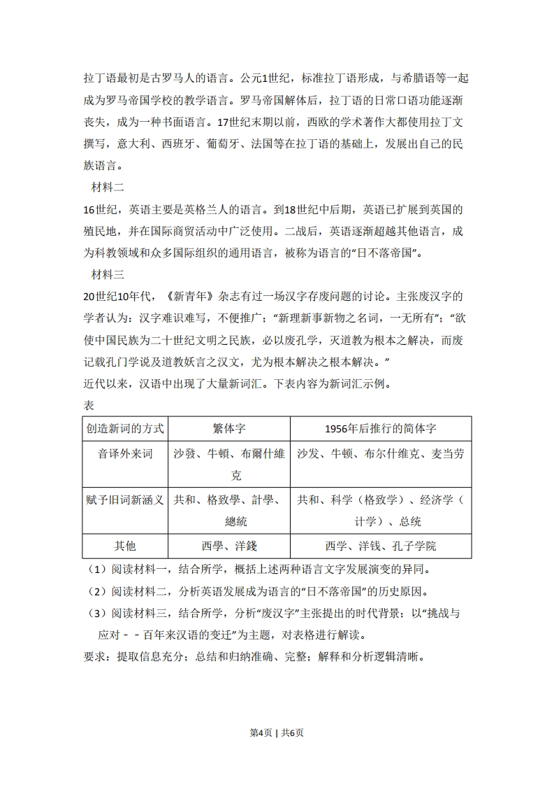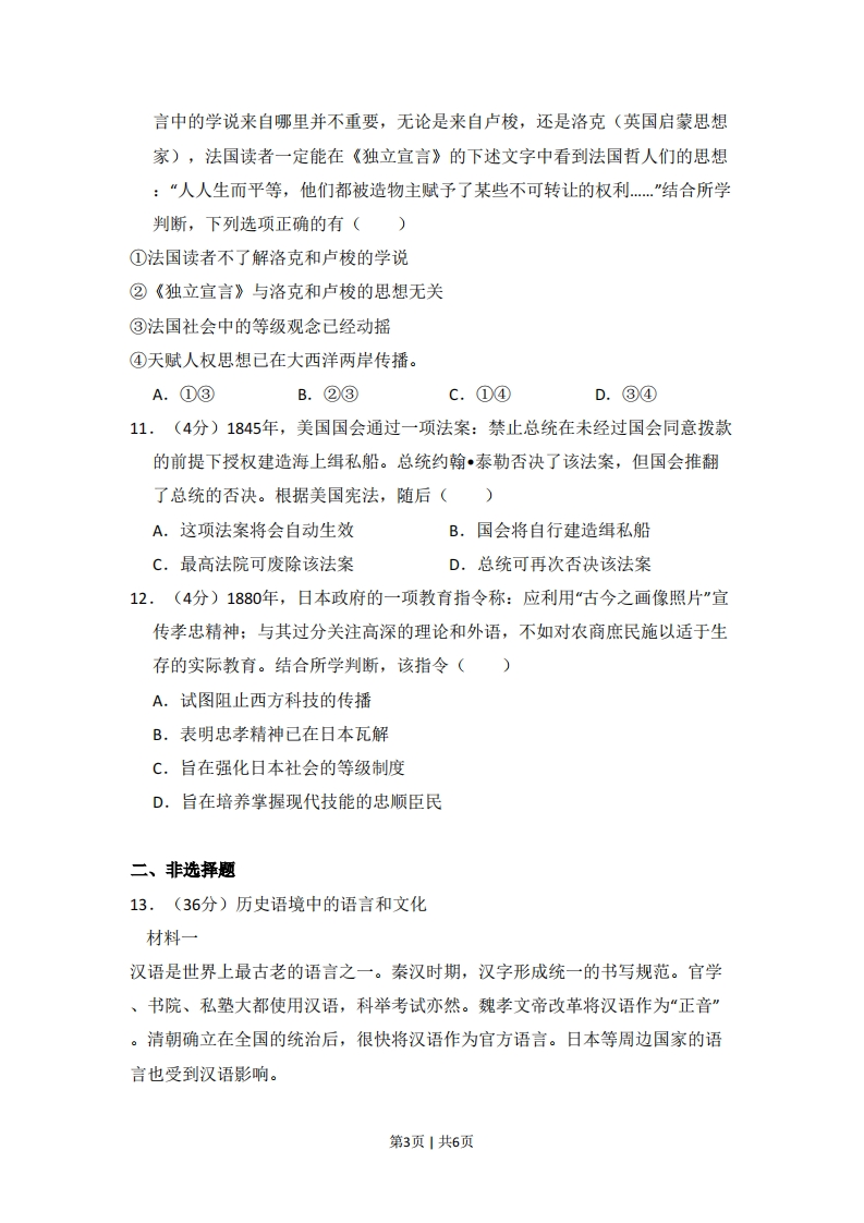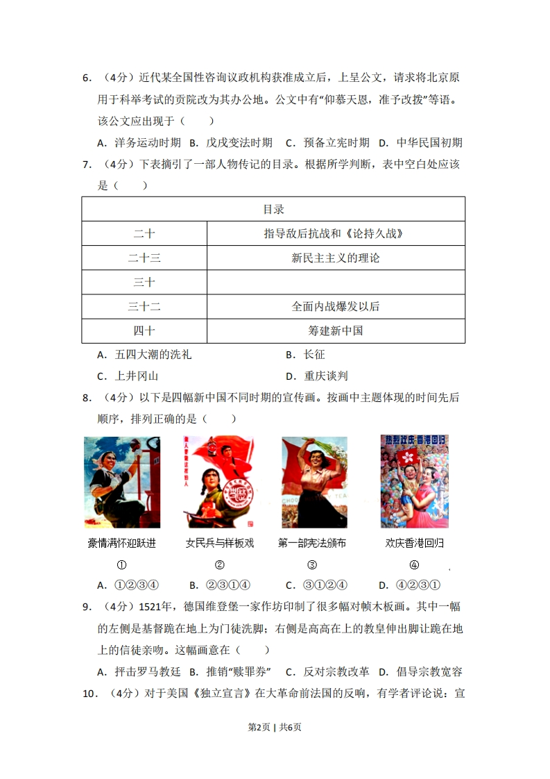 2015年北京市高考历史试卷一、选择题(每小题4分)1.(4分)“苟无事迹,虽圣人不能做《春秋》,苟不知其事迹,虽以圣人读《春秋》,不知所以褒贬。”《四库全书总目》中这段话体现的史学原则是()①秉笔直书②言必有据③论从史出④以小见大。A.①②B.②③C.①③D.②④2.(4分)某朝官员王锷通过贿赂企图兼任宰相。皇帝同意了王锷的请求,并下诏“锷可兼宰相”。时任给事中的李藩行使职权,驳回诏书。由此推断,给事中最有可能隶属于()A.唐朝的门下省B.唐朝的吏部C.宋朝的枢密院D.明朝的内阁3.(4分)唐代长安的商业店铺主要集中在东西两市。按规定,“诸行有正铺者,不得于铺前更造偏铺”。南宋都城中的商业活动散布于城内各处,据记载约有“四百十四行”。上述材料可以佐证,南宋时期()A.私营商业已居主导地位B.坊市制度已经瓦解C.商业发展已超过农业D.资本主义萌芽已出现4.(4分)明朝中后期,王阳明学说在中国士大夫中流行。朝鲜来华使者对此不理解,认为“阳明敢肆己意,谤辱朱子,实斯文之罪人也”。结合所学判断,下列选项正确的有()①朝鲜使者以程朱理学为正宗②王阳明心学超越了理学范畴③王阳明与朱熹观点明显不同④王阳明心学是对儒学的叛逆。A.①②B.②③c.①③D.②④5.(4分)太平天国提倡“剪辫蓄发”,认为当时人的发饰“坏先人之服冕,是使中国之人忘其根本也”。辛亥革命期间,革命党人认为“欲除满清之藩篱,必先去满清之形状”,提倡“剪辫易服”。二者均希望通过变革发饰()A.与西方文明相对接B.号召推翻清朝统治C.提倡民主自由思想D.表明各自宗教信仰第1页1共6页