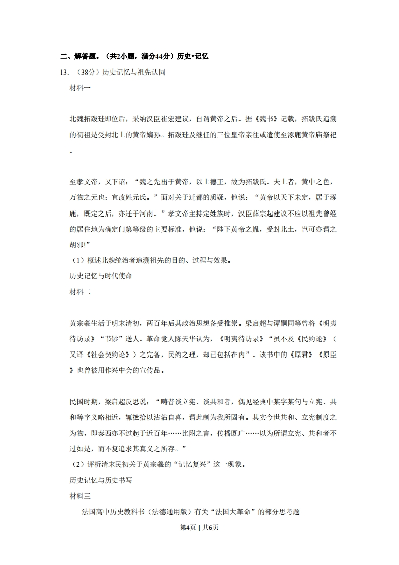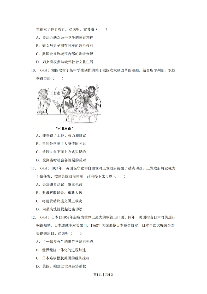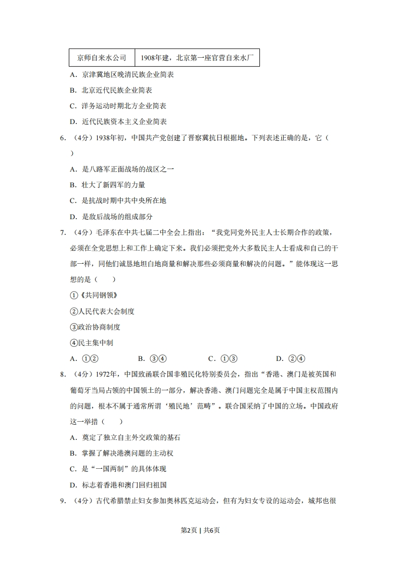 2019年北京市高考历史试卷一、选择题:本题共12小题,每小题4分,共48分。在每小题给出的四个选项中,只有一项是符合题目要求的。1.(4分)在中国新疆乌鲁木齐南山矿区以及俄罗斯阿尔泰山北麓等地,出土了公元前7~前5世纪楚国生产的凤鸟纹刺绣丝绸。据此可以判断()A.东周时期丝织品做工精良,远播西域地区B.楚国是中西交通起点,楚文化有明显西域特征C.汉代丝路开通之前,中原与西域没有交往D.东周时期楚国与西域交流广泛,生活方式趋同2.(4分)《诗》《书》等原是孔子编订的私学教材,至汉代,位列官方史书《汉书》的《艺文志》第一大部类“六艺略”。导致这一变化的主要原因是()A.诸子“百家争鸣”B.始皇帝焚书坑儒C.汉武帝独尊儒术D.司马迁撰《史记》3.(4分)据《梦溪笔谈》记载,张咏任崇阳知县时,因“民不务耕织”而唯以植茶获利,遂下令将茶树全部砍掉,改种桑麻。有人入市买菜,他怒斥:“汝村民皆有土田,何不自种而费钱买菜?”这反映出,宋代()A.官府垄断茶利,商业环境恶劣B.农副产品较少,货币使用率低C.地方官员固守重农抑商的思想D.商人社会地位较以往愈加低下4.(4分)明万历十五年,顾宪成等人奏疏忤旨,神宗要求内阁拟票重罚。内阁首辅申时行等只拟罚俸,神宗震怒,令“还改票来!”申时行只得遵旨。这说明,明代内阁大学士()A.仅作为侍从顾问,不参决政事B.万历年间开始参与军国大事决策C.按照皇帝的传谕来票拟和批红D.掌握票拟权力,但仍需服从君权5.(4分)为下表选取表名,最恰当的是()名称相关信息开滦唐山煤矿1878年建,中国近代煤炭工业北洋水师大沽船坞1880年建,北方最早的船舶修造厂北洋银元局1902年建,位于天津,造币中心第1页1共6页