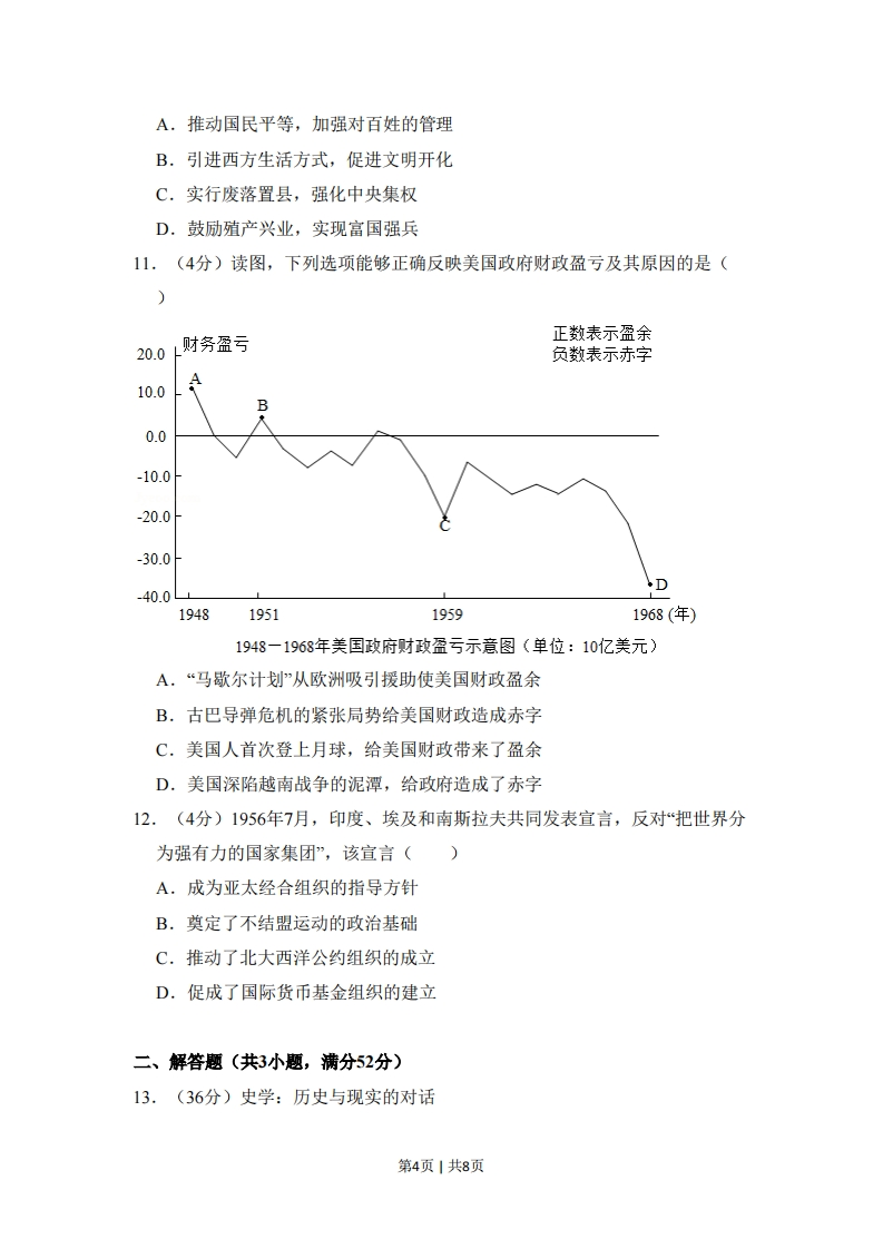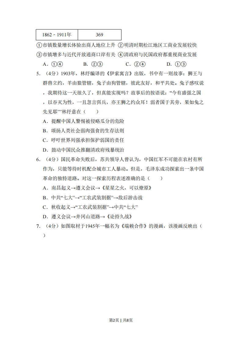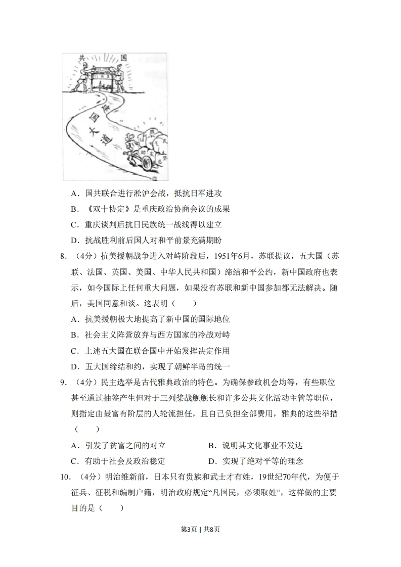 2018年北京市高考历史试卷一、选择题(共12小题,每小题4分,满分48分)1.(4分)“王”字在甲骨文中是一把斧头的形象,象征军事首领的征伐权利,战国时期,孟子认为,“以力假仁者霸...以德行仁者王”,他的观点()A.与甲骨文“王”字的本义一致B.是“无为而治”的理论依据C.体现出儒家强调教化的政治理念D.奠定了宗法制度的思想基础2.(4分)南宋年初“中原士民、扶携南渡,不知其几千万人”,南方地区小麦价格暴涨,“农获其利,倍于种稻”,小麦在南方大规模种植,南稻北麦的粮食作物分布格局被打破,对此认识正确的是()①南迁的北方人民对面食的需求推动小麦种植②《农政全书》的刊刻推广了先进的种植技术③稻麦兼种技术的发展为小麦种植提供了条件④曲辕犁开始从北方引入,促进生产效率提高A.①②B.①③C.①④D.②③3.(4分)乾隆继位之初,曾裁撤军机处,但第二年又下旨:“目前两路军务尚未全竣,且联日理万机,亦问有特召交出之事,仍须就近承办”,将其恢复,此后军机处“军国大计,阔不总揽“内阁宰辅名存而已”。这表明()A.清朝内阁权利得到加强B.清朝中央集权遭到削弱C.军机大臣获得宰相职位D.军机处有助于加强皇权4.(4分)明中叶以来,松江府(今上海一带)所辖市镇数量如下表所示,据此表可以得出()时间松江市镇数量1550年以前591551-1722年1131723-1861年167第1页1共8页