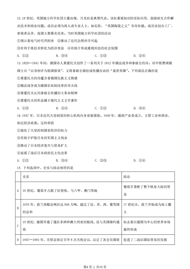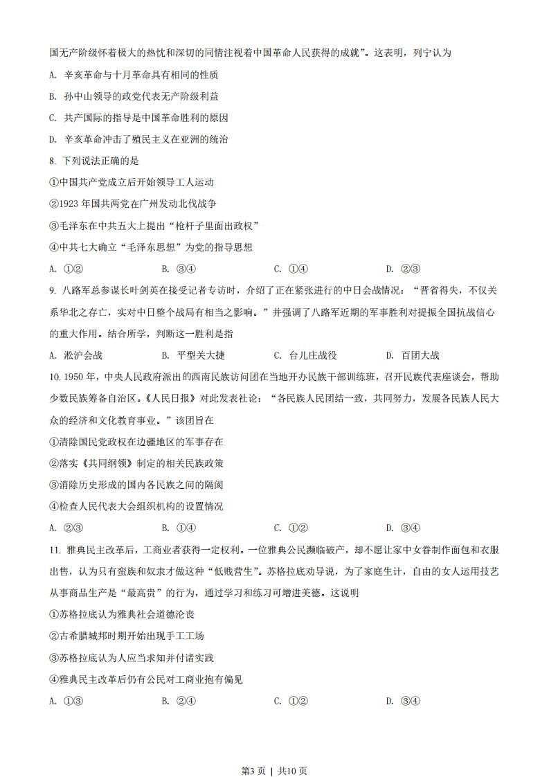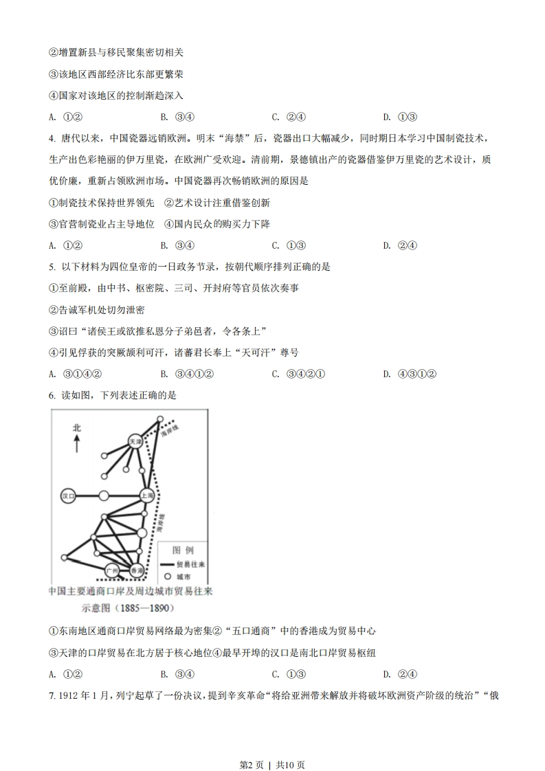 2021年普通高中学业水平等级性考试北京·历史一、选择题1.祝岁习俗古己有之。《诗经》云:“称彼兕觥(酒杯),万寿无疆。”汉代岁首,皇帝“大朝受贺”“百官受赐宴飨”。民间亦在岁首祭祀,其时全家依次列坐,向家长敬酒祝寿。该习俗A.出现于战国并兴盛于汉代B.体现礼仪教化与伦理秩序C.植根于我国古代商业文明D.仅是官方举行的庆祝仪式2.下图为唐代告身(官员接受官职的凭证)书写格式示意图。该图说明唐代告身门某官。下年签名)尚书省官员制:年可(皇帝画可)月日制付外施行。制书如右,请奉签名)(门下省官员月主者施行具官封、言。告身格式示意图签名)(中书省官员名、行·。①由中书省和门下省官员共同草拟②在皇帝画可同意后交门下省审议③最终由尚书省的官员签署并颁下④可体现三省相互牵制又分工配合A.①③B.②④C.①②D.③④3.唐中后期,官府在今福建地区大量设置税场,五代十国至宋初又将很多税场升为县,其分布状况见如图。以下说法正确的是图例五代十国由场升县宋代由场骨舞州府油新四移民较少她区移民较多地区①由场升县绝大部分发生在宋代第1页」共10页