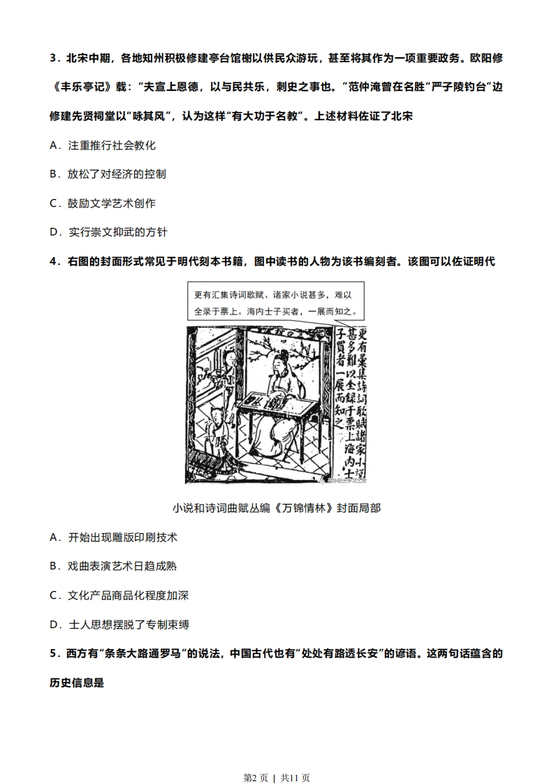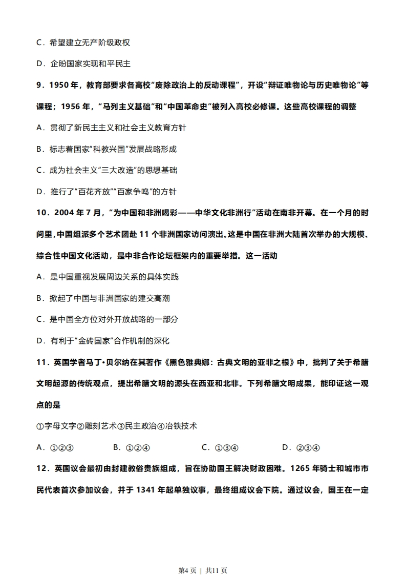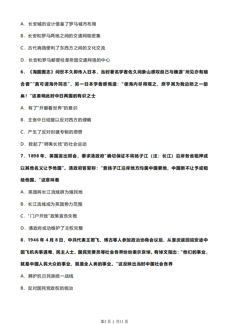 2022年普通高中学业水平等级性考试(北京卷)历史本试卷共9页,100分。考试时长90分钟。考生务必将答案答在答题卡上,在试卷上作答无效。考试结束后,将本试卷和答题卡一并交回。第一部分本部分共15题,每题3分,共45分。在每题列出的四个选项中,选出最符合题目要求的一项。1.近年,考古工作者在江西国字山发现了战国中期的大型墓葬。该墓葬具有突出的越文化特征,同时又有楚文化和江准文化等文化因素,墓葬形制也与中原墓葬有相似之处。此考古发现A.印证了“春秋五霸“的政治格局B.反映了中华文明多元一体的特点C.证明中原率先成为中华文明核心D.说明了统一多民族国家已经建立2.汉代某地区“地广人稀”,到南北朝时期逐渐发展为“民多田少”。这一地区位于右侧示意图中的②1洛阳建康图例河流名④0线市A.①B.②C.③D.④第1页」共11页