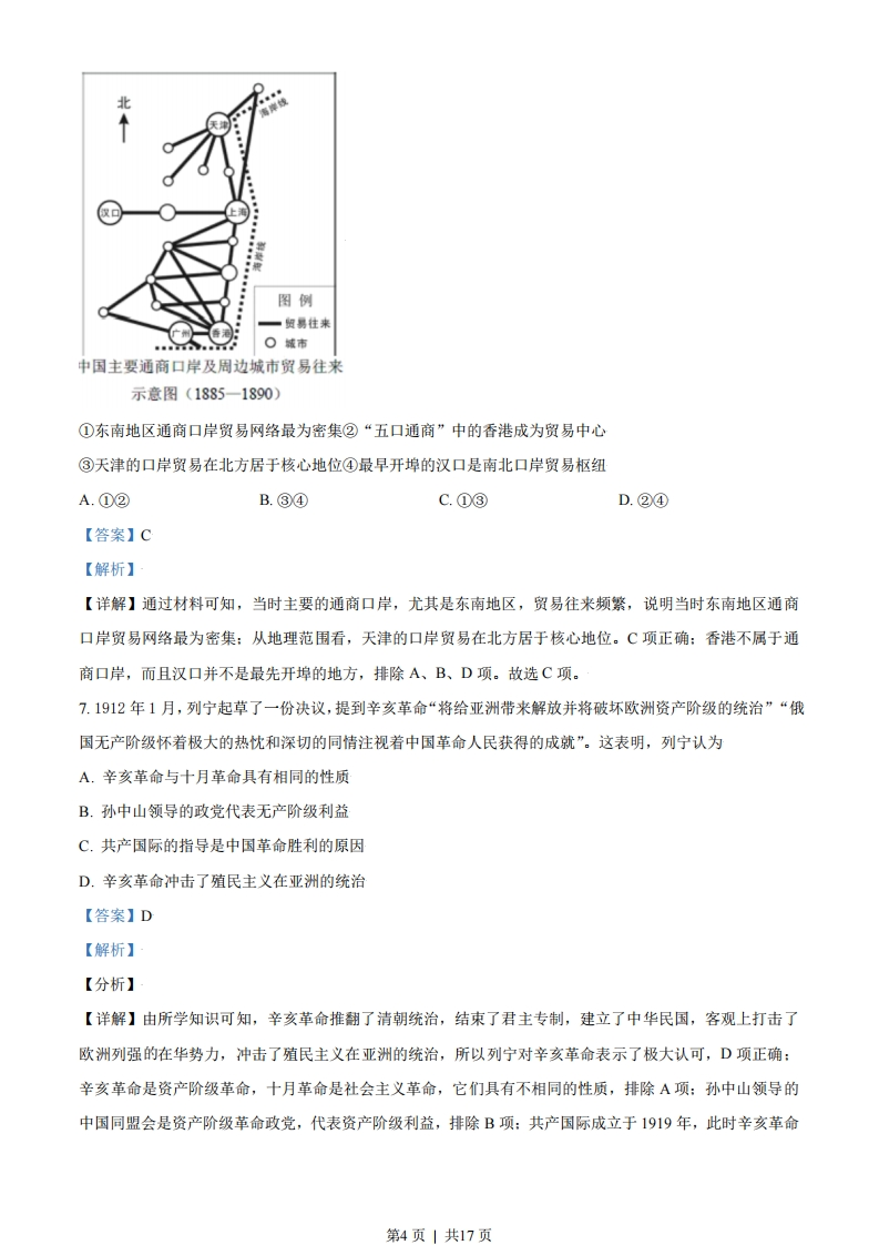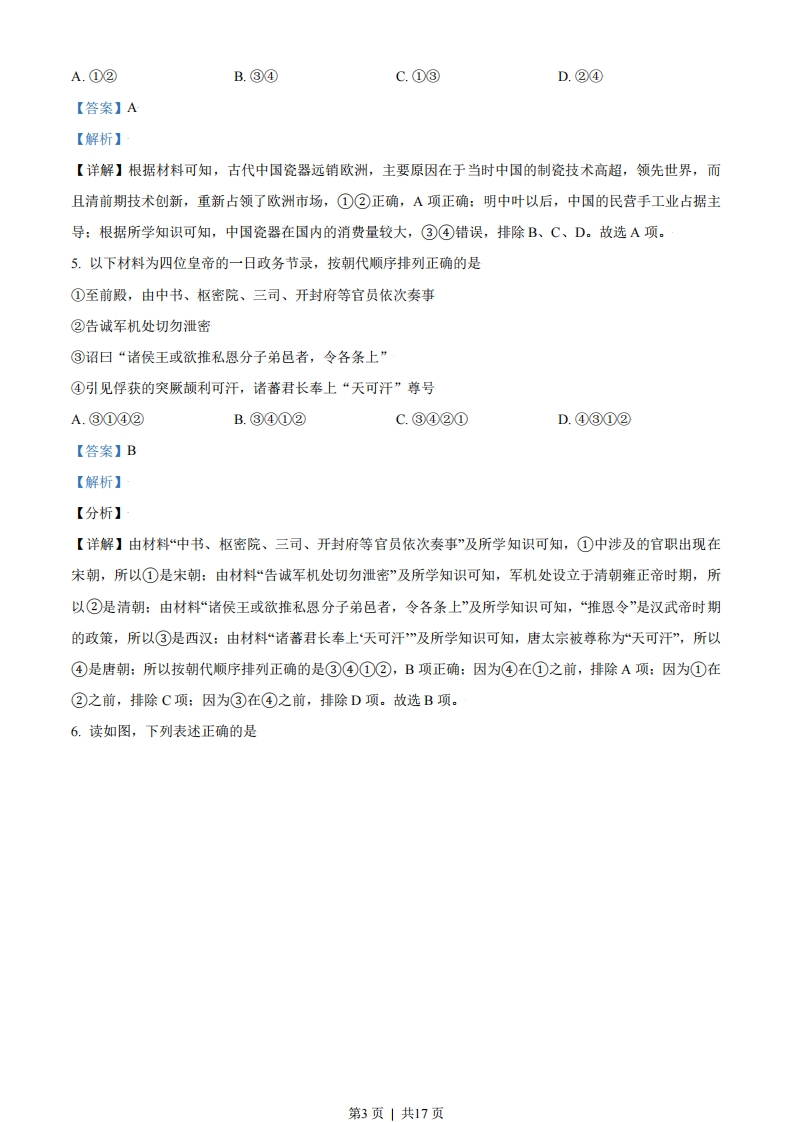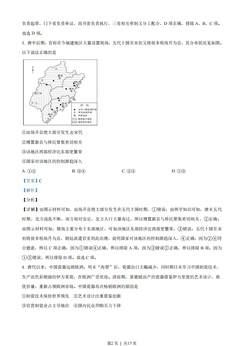 2021年普通高中学业水平等级性考试北京·历史一、选择题1.祝岁习俗古己有之。《诗经》云:“称彼兕觥(酒杯),万寿无疆。”汉代岁首,皇帝“大朝受贺”“百官受赐宴飨”。民间亦在岁首祭祀,其时全家依次列坐,向家长敬酒祝寿。该习俗A.出现于战国并兴盛于汉代B.体现礼仪教化与伦理秩序C.植根于我国古代商业文明D.仅是官方举行的庆祝仪式【答案】B【解析】【分析】【详解】由材料可知,祝岁习俗由来已久,从皇帝到普通百姓都很重视,通过举行各种仪式来体现对君主或长辈的敬意与美好期盼,体现了通过节庆礼仪进行教化和对伦理秩序的认同,B项正确:由材料中《诗经》的记述可知,该习俗在西周时就己经出现,排除A项:该习俗植根于我国古代农耕文明,排除C项:由材料可知,祝岁习俗并不仅是官方举行的庆祝仪式,在民间也有,排除D项。故选B项。2.下图为唐代告身(官员接受官职的凭证)书写格式示意图。该图说明唐代告身可门年年某官。签名)(尚书省官员制:月日制付外施行。制书如右,签名)(门下省官员月可(皇帝画可)请奉主者施行具官封、謹言签名)(中书省官员名告身格式示意图:德行……①由中书省和门下省官员共同草拟②在皇帝画可同意后交门下省审议③最终由尚书省的官员签署并颁下④可体现三省相互牵制又分工配合A.①③B.②④C.①②D.③④【答案】D【解析】【详解】根据示意图中签名机构可知,这里涉及的是三省六部制的运作机制,结合所学知识可知,中书省第1页」共17页
