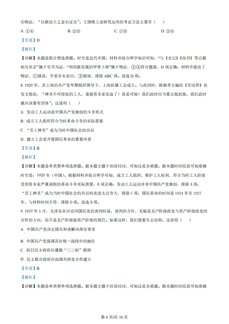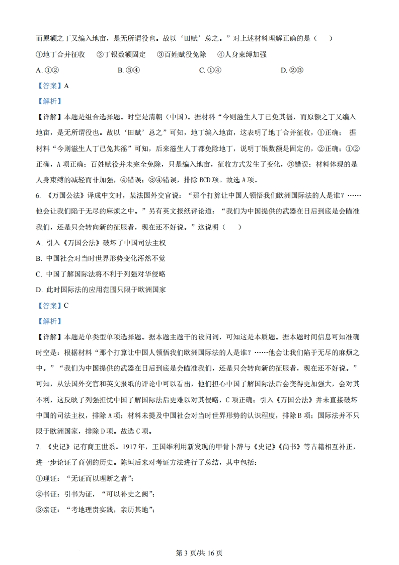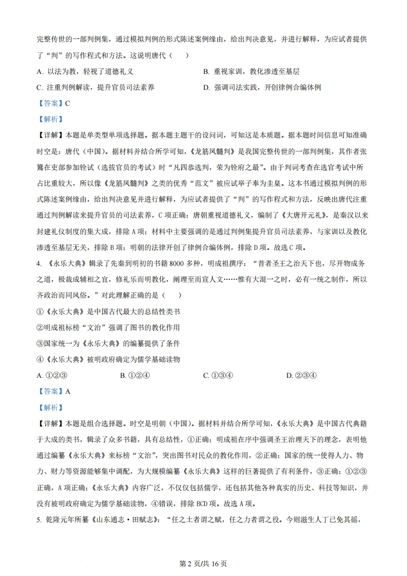 北京市2024年普通高中学业水平等级性考试历史本试参满分100分,考试时间90分钟。第一部分本部分共15题,每题3分,共45分。在每题列出的四个选项中,选出最符合题目要求的一项。1,古代玉器为礼之重器,孔子用玉比喻理想人格:温润而泽,仁也:缜密以栗(坚硬),知(智)也:廉(棱角)而不刿(割),义也:垂之如队(坠),礼也。这一比喻寄托了()A.隆礼重法的精神B.无为而治的理想C.修身明德的追求D.选贤任能的理念【答案】C【解析】【详解】本题是单类型单项选择题。据本题主题干的设问词,可知这是正向题。据本题时间信总可知准确时空是:春秋战国时期(中国)。据材料并结合所学可知,孔子用玉的温润、坚硬、有棱角而不伤人、下垂等特质来比喻理想人格中的仁、智、义、礼等品质。这反映了孔子希望人们通过自我修养,培养和具备这些美好的品德,以达到高尚的人格境界,C项正确:“隆礼重法”是荀子观点,且材料也未涉及“法”,排除A项:无为而治是道家观点,与儒家孔子思想不符,排除B项:材料并未涉及选拔人才的相关内容,排除D项。故选C项。2.西汉官员朱邑,少时为舒桐乡啬夫,为政“廉平不苛”“存问耆老孤寡”“所部吏民爱敬焉”,后“举贤良为大司农丞…以治行第一入为大司农”。上述材料可以印证西汉时期()①社会基层组织开始建立②中正官负责官员的考核③政府通过察举选拔人才④官吏为政注重优抚老弱A.①②B.③④C.①③D.②④【答案】B【解析】【详解】本题是组合选择题。时空是西汉(中国)。据材料“举贤良为大司农丞…以治行第一入为大司农”可知,朱邑因贤良而被察举为官,这表明西汉政府通过察举制度选拔人才,③正确:朱邑在担任舒桐乡啬夫时“存问耆老孤寡”,体现了官吏为政注重优抚老弱,④正确:③④正确,B项正确:社会基层组织在西汉之前早己存在,并非此时开始建立,①错误:中正官负责官员考核是魏晋时期的九品中正制,而非西汉,②错误:①②错误,排除ACD项。故选B项。3.“判”是古时官员断决狱讼的文本,也是唐代铨选官吏的考试科目之一。唐代的《龙筋风髓判》是我国第1页供16页