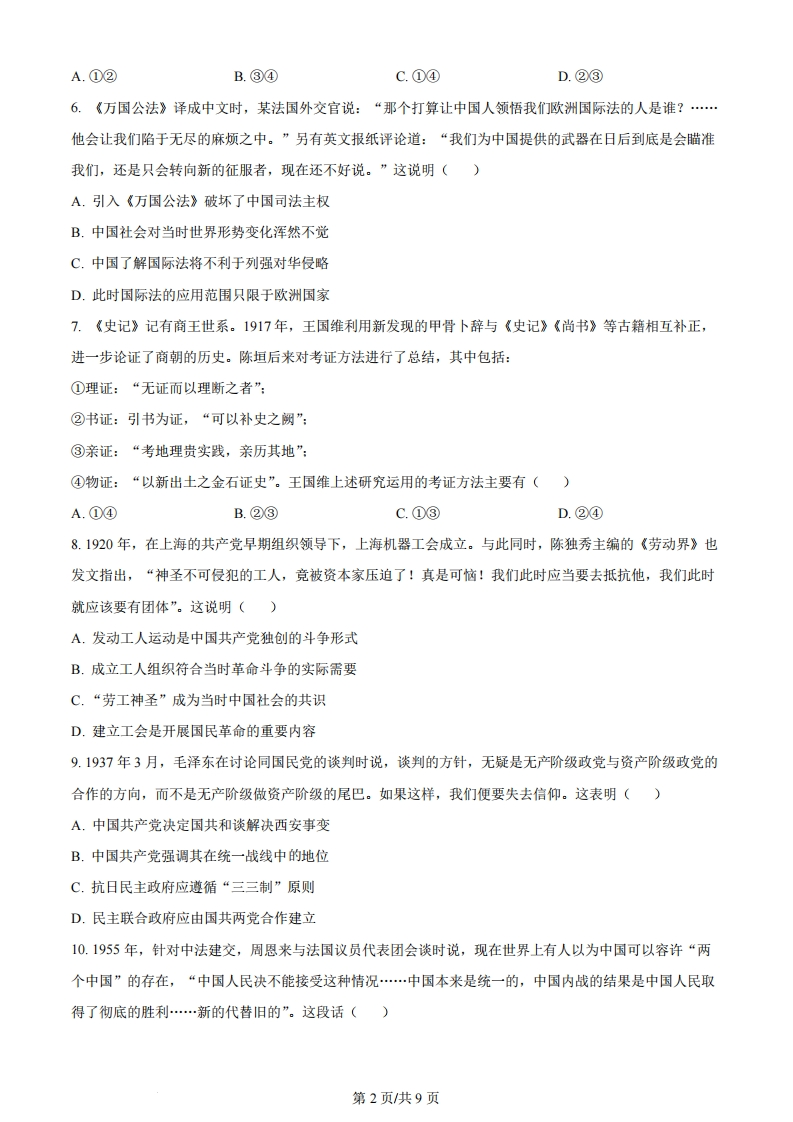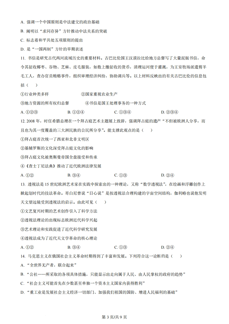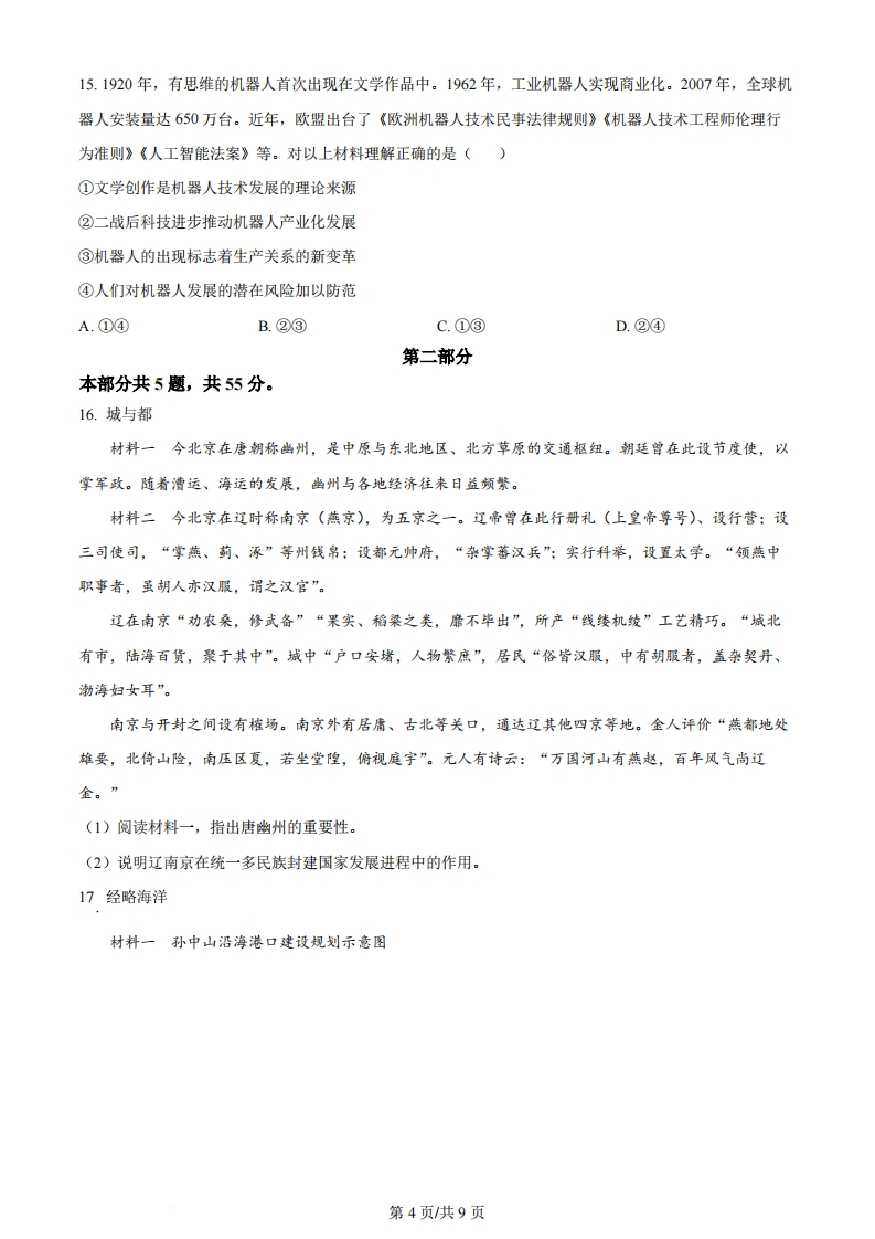 北京市2024年普通高中学业水平等级性考试历史本试参满分100分,考试时间90分钟。第一部分本部分共15题,每题3分,共45分。在每题列出的四个选项中,选出最符合题目要求的一项。1,古代玉器为礼之重器,孔子用玉比喻理想人格:温润而泽,仁也:缜密以栗(坚硬),知(智)也:廉(棱角)而不刿(割),义也:垂之如队(坠),礼也。这一比喻寄托了()A.隆礼重法的精神B.无为而治的理想C.修身明德的追求D.选贤任能的理念2.西汉官员朱邑,少时为舒桐乡啬夫,为政“廉平不苛”“存问耆老孤寡”“所部吏民爱敬焉”,后“举贤良为大司农丞…以治行第一入为大司农”。上述材料可以印证西汉时期()①社会基层组织开始建立②中正官负责官员的考核③政府通过察举选拔人才④官吏为政注重优抚老弱A.①②B.③④C.①③D.②④3.“判”是古时官员断决狱讼的文本,也是唐代铨选官吏的考试科目之一。唐代的《龙筋凤髓判》是我国完整传世的一部判例集,通过模拟判例的形式陈述案例缘由,给出判决意见,并进行解释,为应试者提供了“判”的写作程式和方法。这说明唐代()A.以法为教,轻视了道德礼义B.重视家训,教化渗透至基层C.注重判例解读,提升官员司法素养D.强调司法实践,开创律例合编体例4.《永乐大典》辑录了先秦到明初的书籍8000多种,明成祖撰序:“昔者圣王之治天下也,尽开物成务之道,极裁成辅相之宜,修礼乐而明教化,阐理至而宣人文…惟有大混一之时,必有一统之制作,所以齐政治而同风俗。”对此理解正确的是()①《永乐大典》是中国古代最大的总结性类书②明成祖标榜“文治”强调了图书的教化作用③国家统一为《永乐大典》的编纂提供了条件④《永乐大典》被明政府确定为儒学基础读物A.①②③B.①②④C.①③④D.②③④5.乾隆元年所纂《山东通志·田赋志》:“任之土者谓之赋,任之力者谓之役。今则滋生人丁己免其徭,而原额之丁又编入地亩,是无所谓役也。故以‘田赋’总之。”对上述材料理解正确的是()①地丁合并征收②丁银数额固定③百姓赋役免除④人身束缚加强第1页共9页