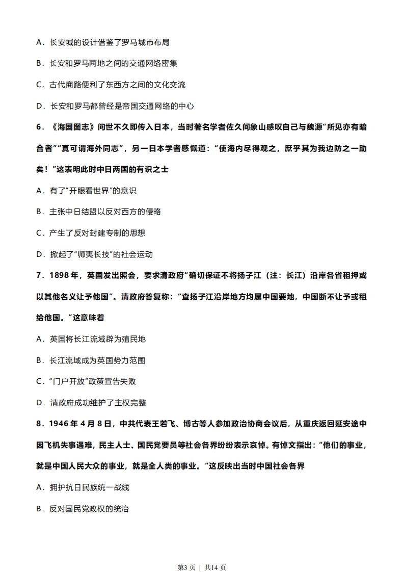 2022年普通高中学业水平等级性考试(北京卷)及答案历史本试卷共9页,100分。考试时长90分钟。考生务必将答案答在答题卡上,在试卷上作答无效。考试结束后,将本试卷和答题卡一并交回。第一部分本部分共15题,每题3分,共45分。在每题列出的四个选项中,选出最符合题目要求的一项。1.近年,考古工作者在江西国字山发现了战国中期的大型墓葬。该墓葬具有突出的越文化特征,同时又有楚文化和江准文化等文化因素,墓葬形制也与中原墓葬有相似之处。此考古发现A.印证了“春秋五霸“的政治格局B.反映了中华文明多元一体的特点C.证明中原率先成为中华文明核心D.说明了统一多民族国家已经建立2.汉代某地区“地广人稀”,到南北朝时期逐渐发展为“民多田少”。这一地区位于右侧示意图中的②1洛阳建康图例河流名④0线市A.①B.②C.③D.④第1页」共14页